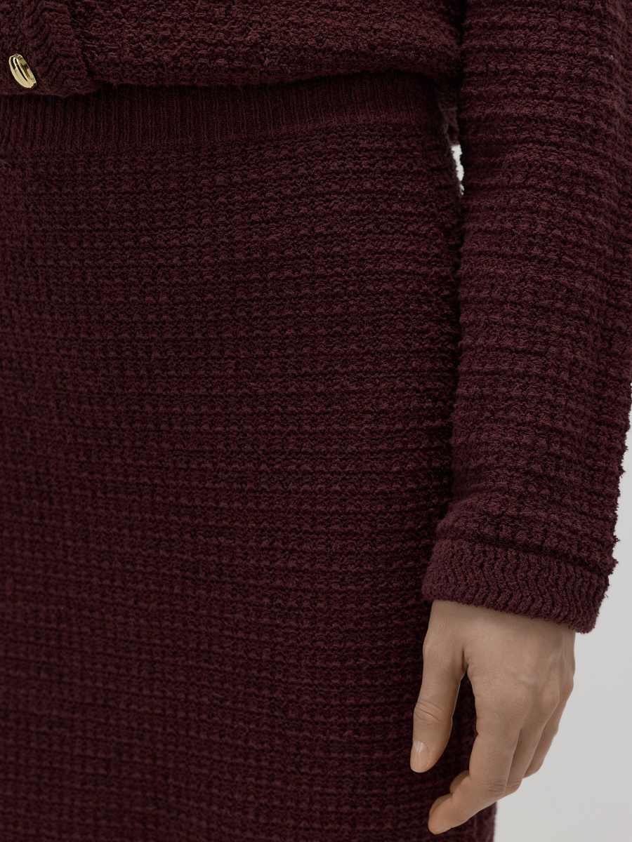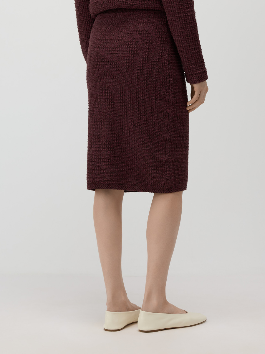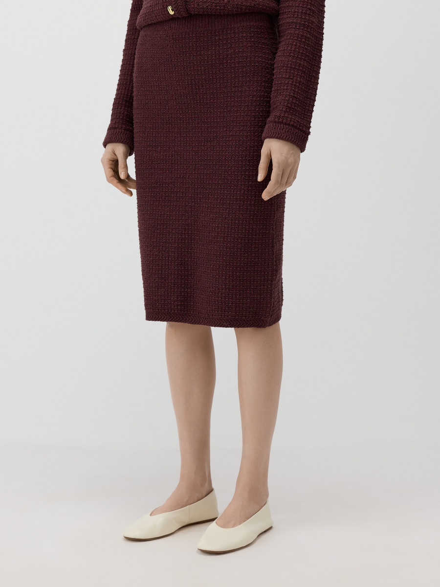 Прямая юбка длиной чуть ниже колена. Выполнена плотным плетением из хлопковой пряжи букле, создающей тактильный объем и визуальную глубину поверхности. Эластичный пояс мягко фиксирует изделие на талии, позволяя варьировать посадку и сохраняя чистые линии силуэта.