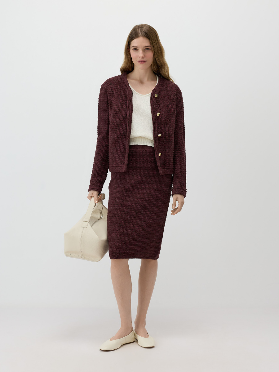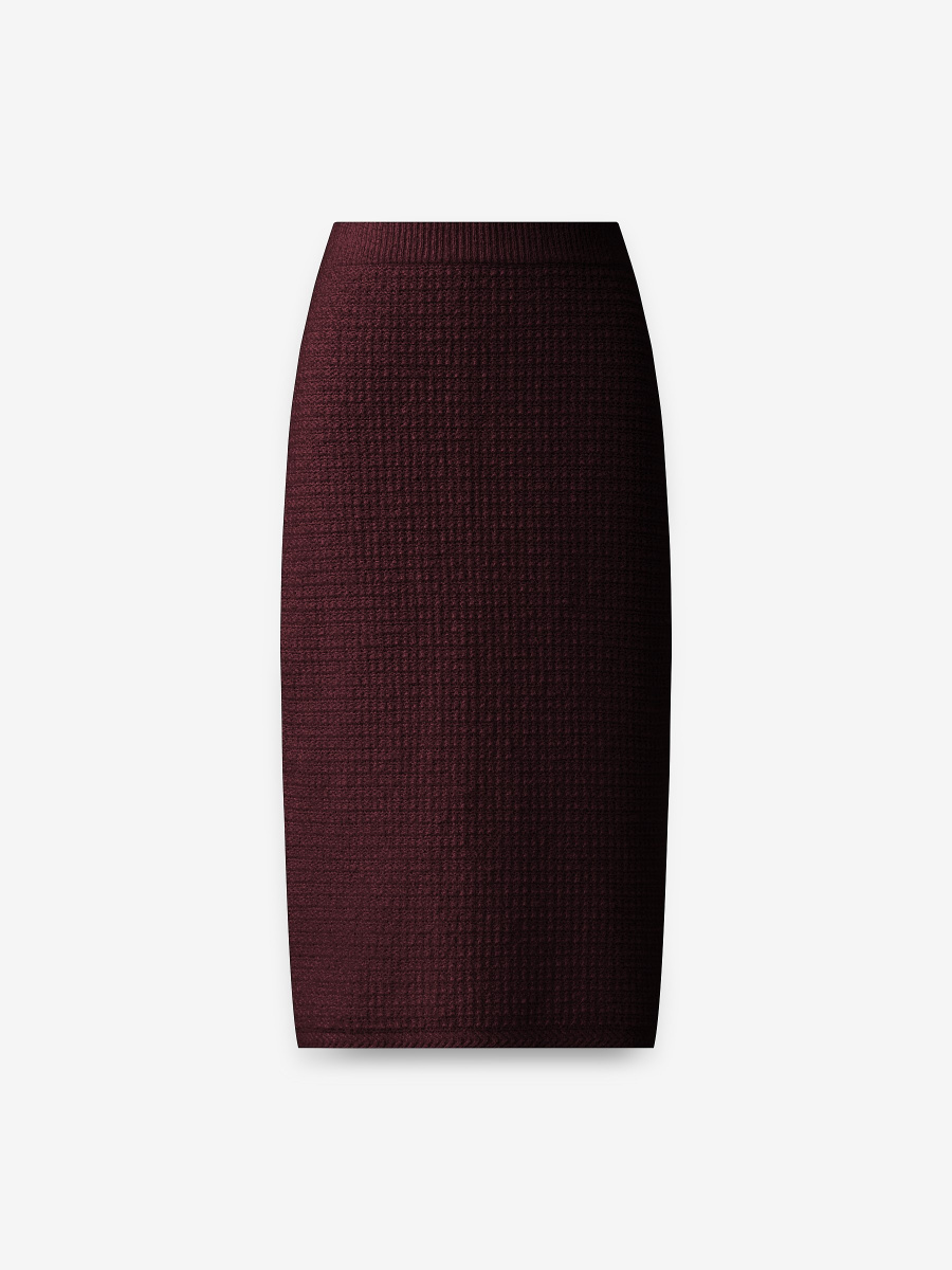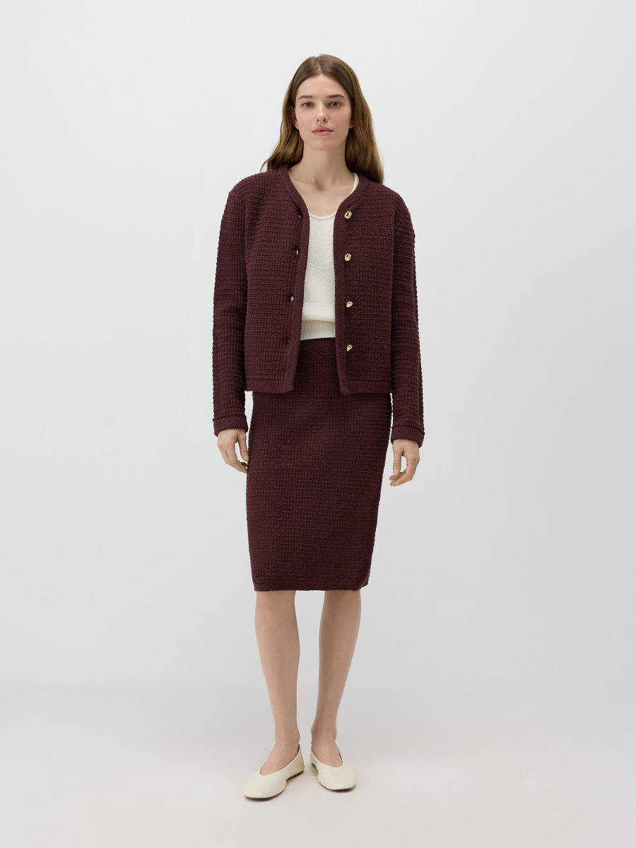 Прямая юбка длиной чуть ниже колена. Выполнена плотным плетением из хлопковой пряжи букле, создающей тактильный объем и визуальную глубину поверхности. Эластичный пояс мягко фиксирует изделие на талии, позволяя варьировать посадку и сохраняя чистые линии силуэта.