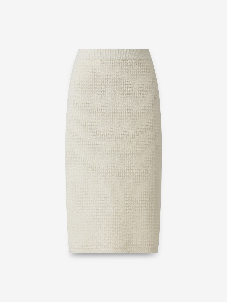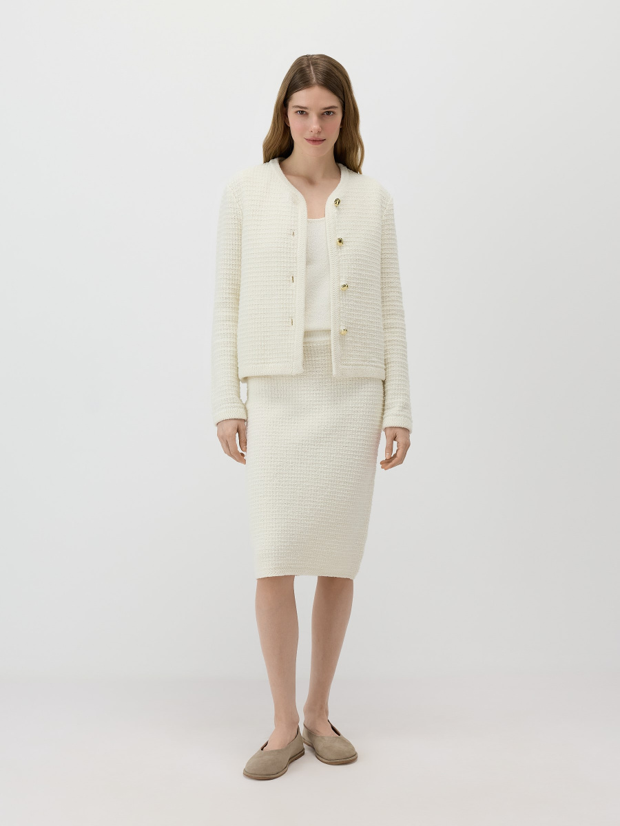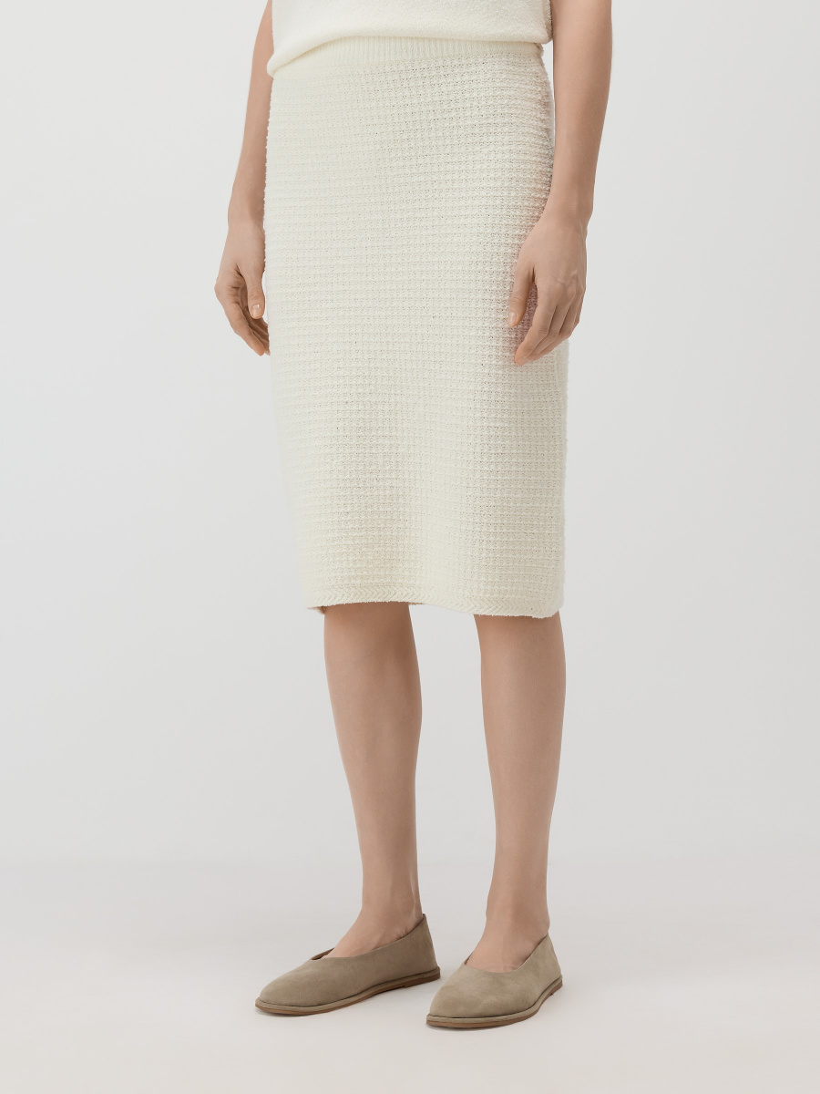 Прямая юбка длиной чуть ниже колена. Выполнена плотным плетением из хлопковой пряжи букле, создающей тактильный объем и визуальную глубину поверхности. Эластичный пояс мягко фиксирует изделие на талии, позволяя варьировать посадку и сохраняя чистые линии силуэта.