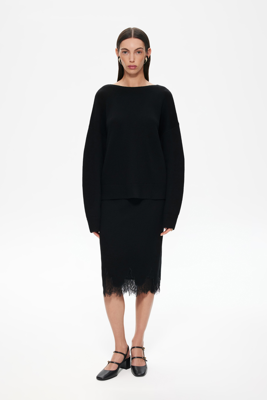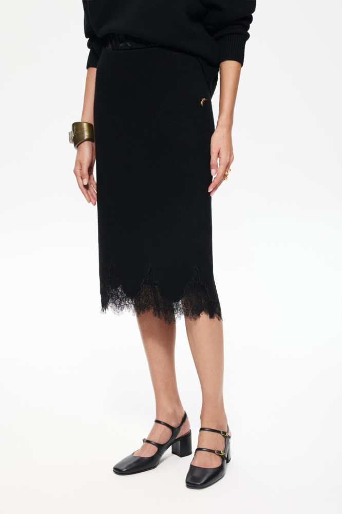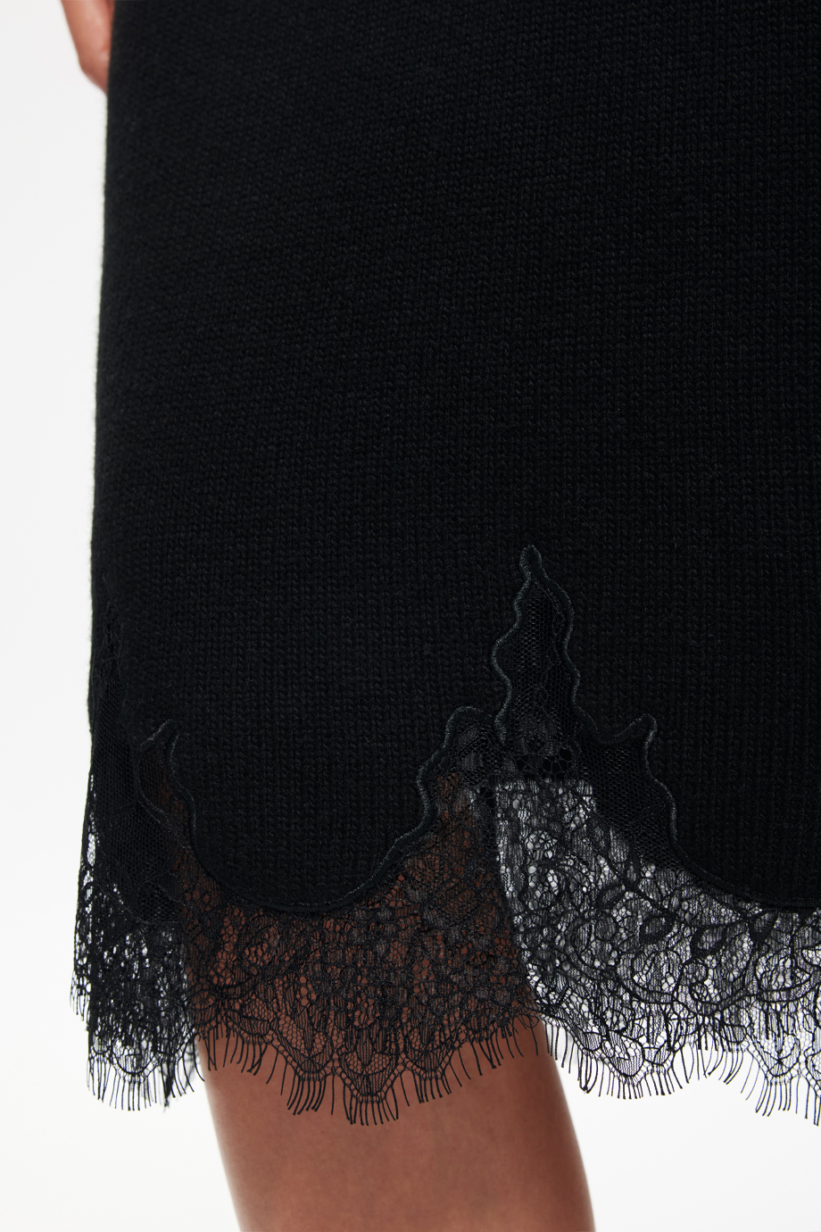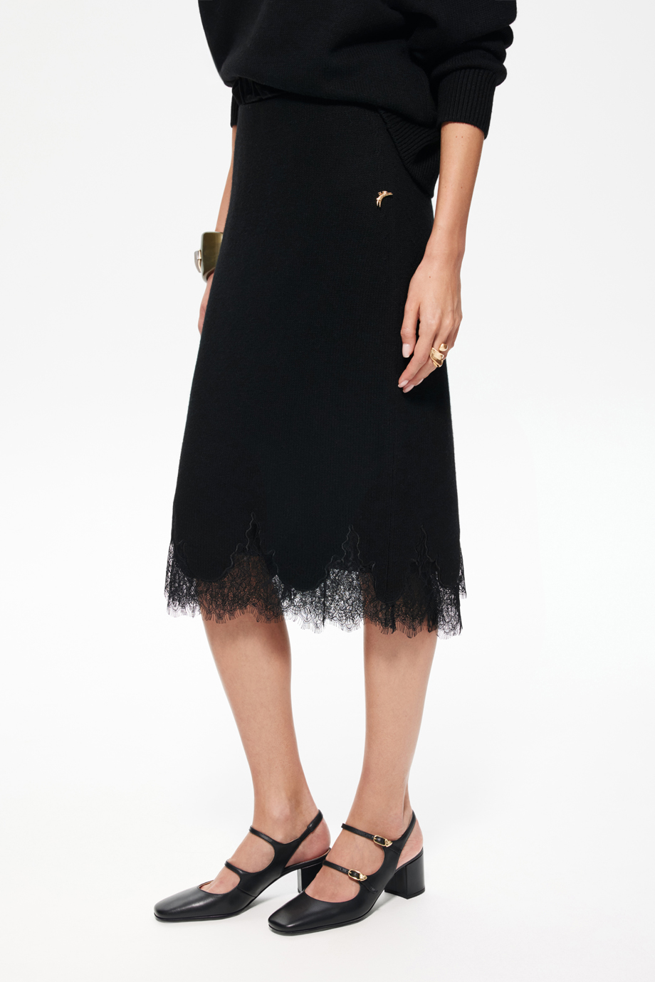 Юбка-миди выполнена из смесовой пряжи с добавлением кашемира. Модель лаконичного прямого силуэта дополнена комфортным эластичным поясом и кружевом.
