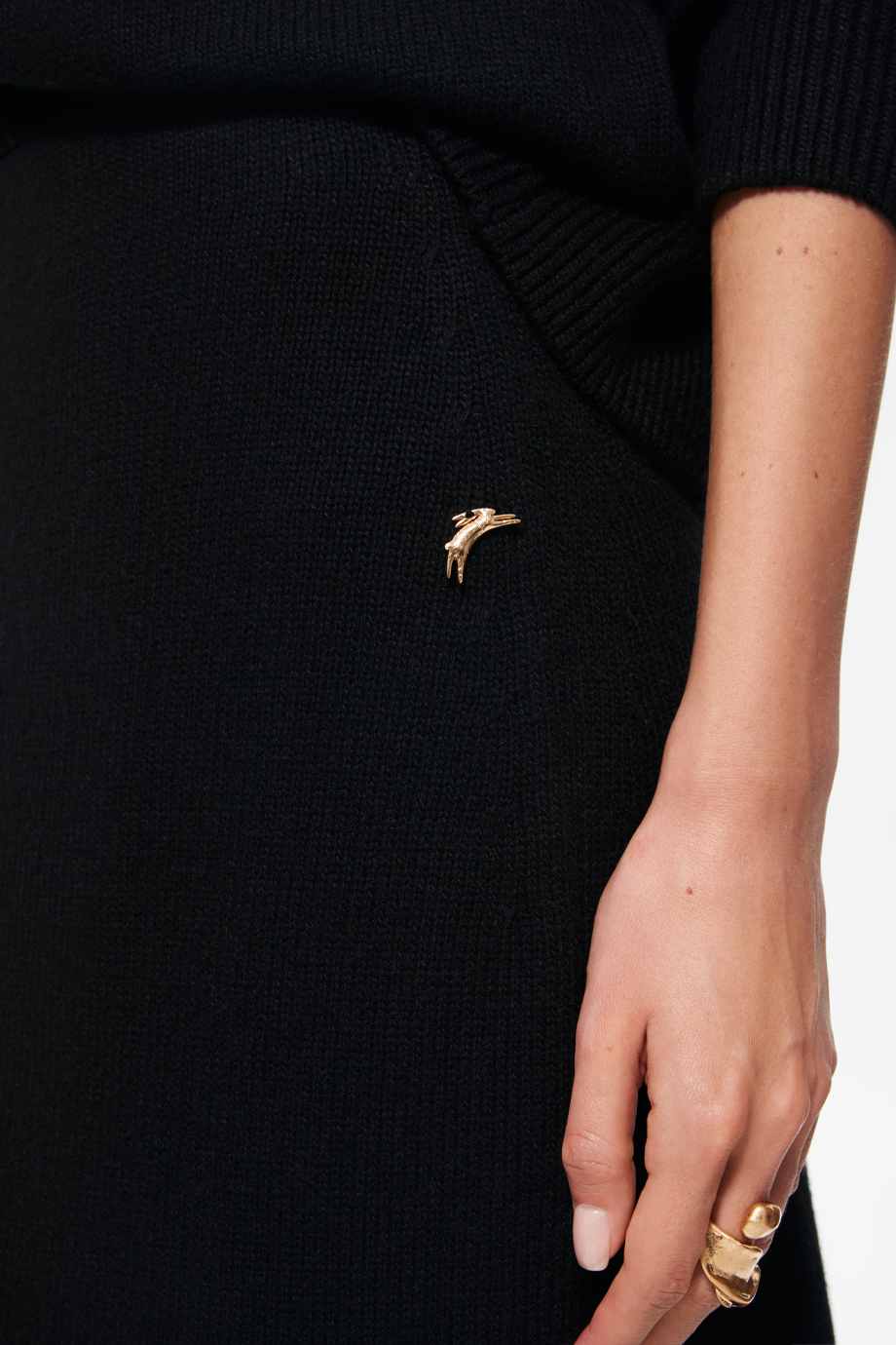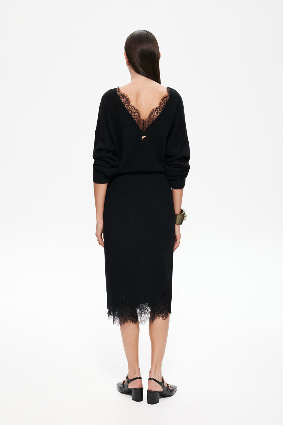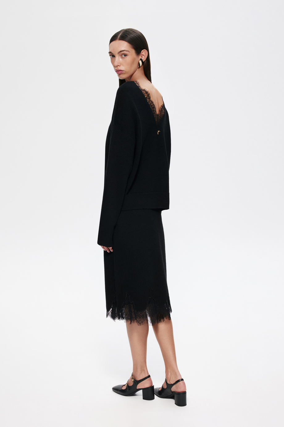 Юбка-миди выполнена из смесовой пряжи с добавлением кашемира. Модель лаконичного прямого силуэта дополнена комфортным эластичным поясом и кружевом.