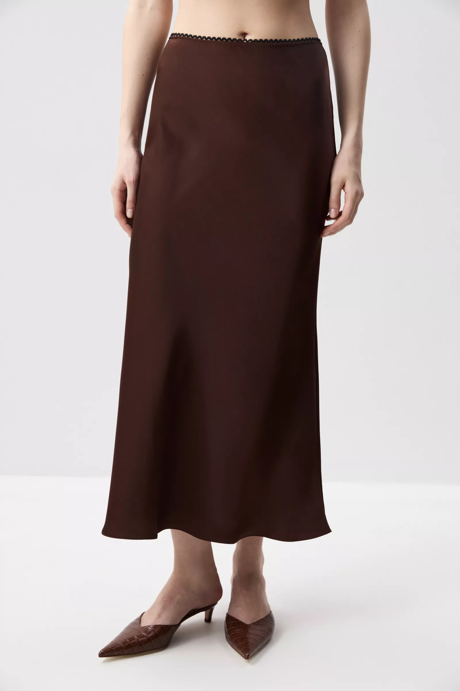Юбка годе из плотного сатина в длине миди. Благодаря крою по косой юбка идеально садится по фигуре, подчеркивая естественные изгибы фигуры. Юбка дополнена декоративной резинкой с фестонами по линии талии.