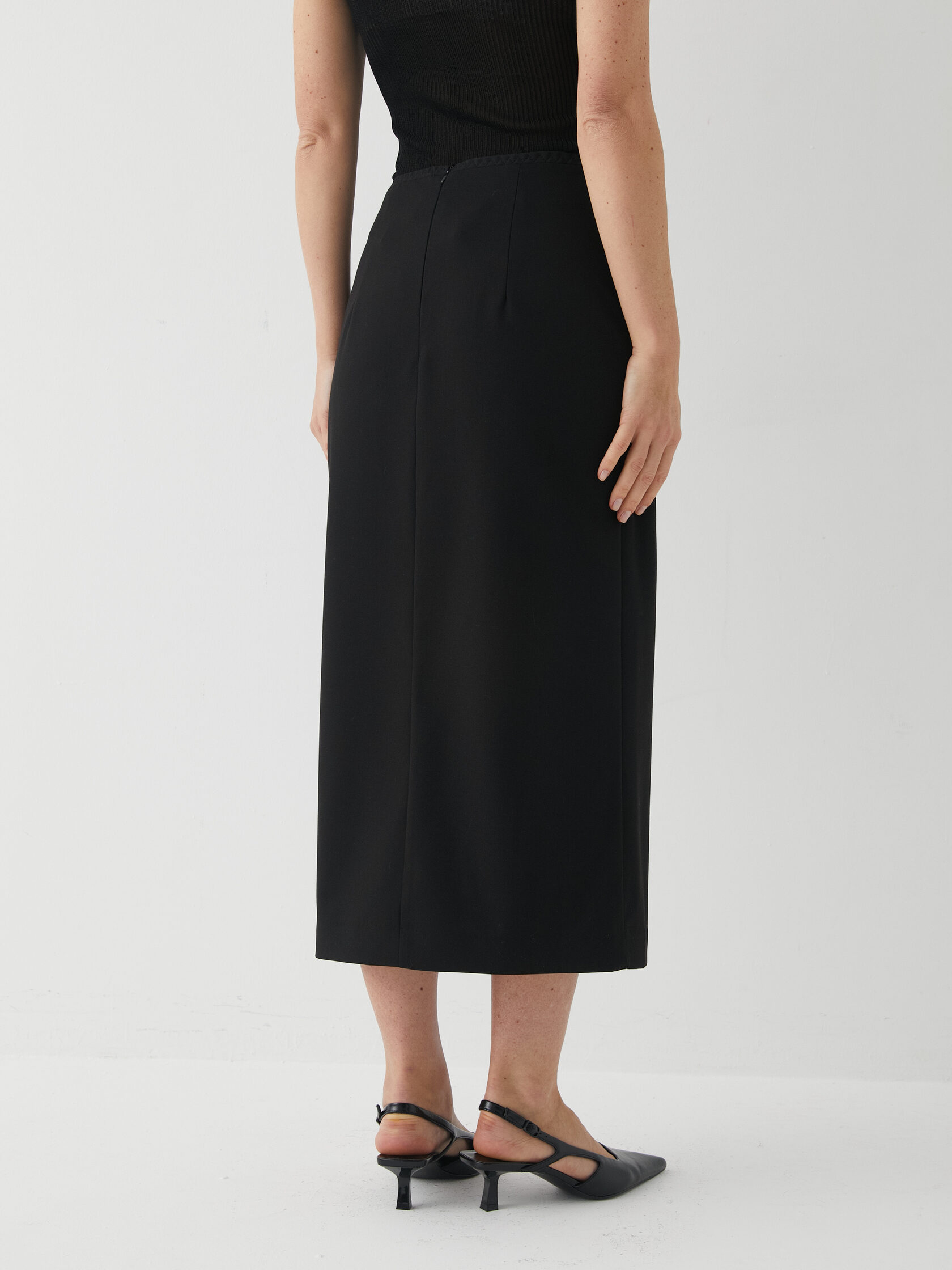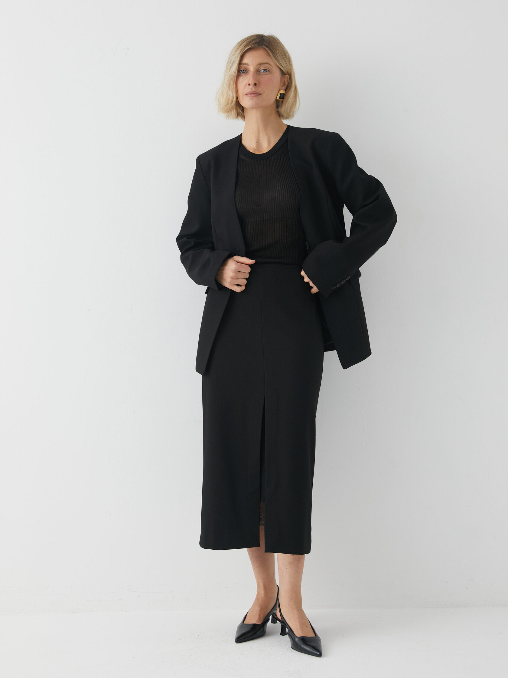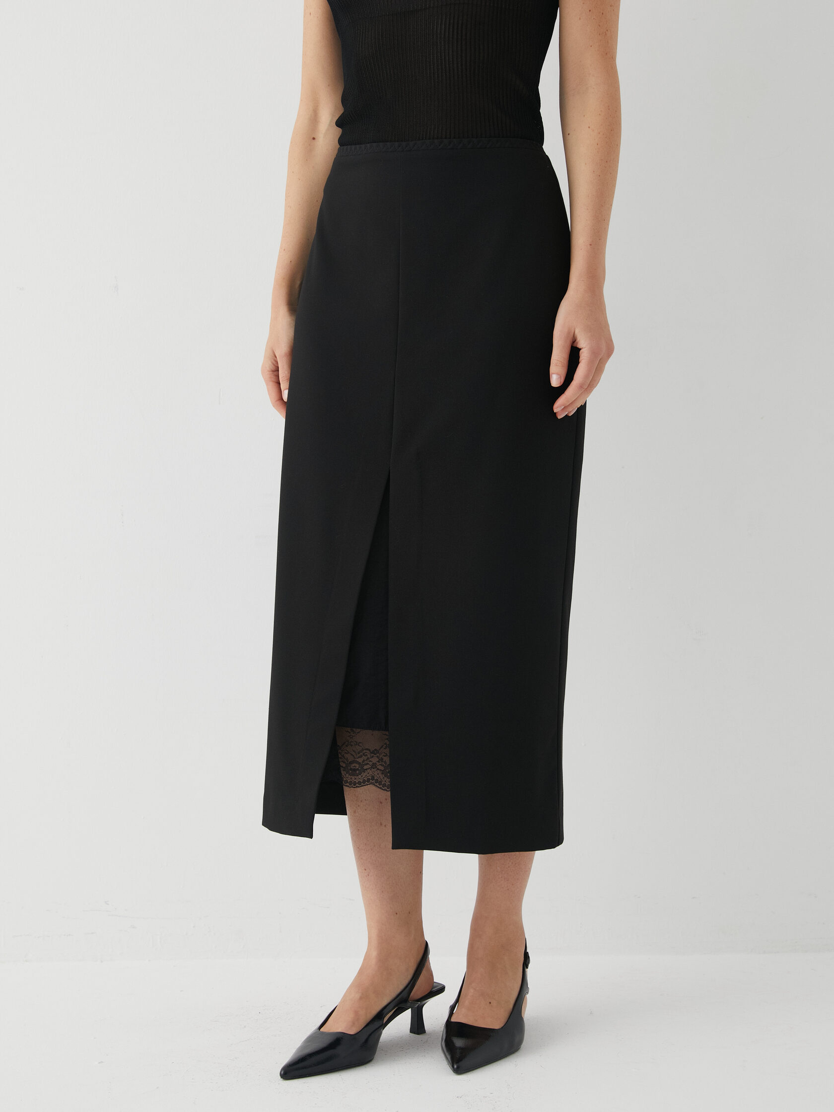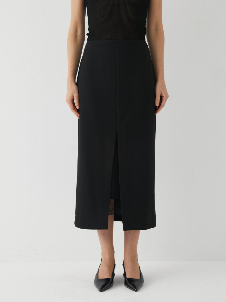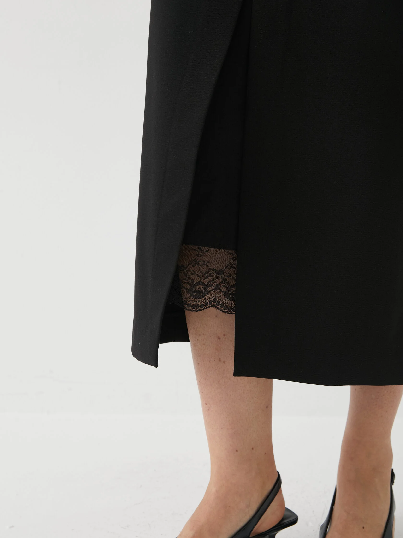 В этом сезоне мы переосмыслили классическую прямую юбку, добавив ей капельку интриги. Тонкая полоска кружева, выглядывающая из-под подола, превращает строгий силуэт в нежное высказывание.