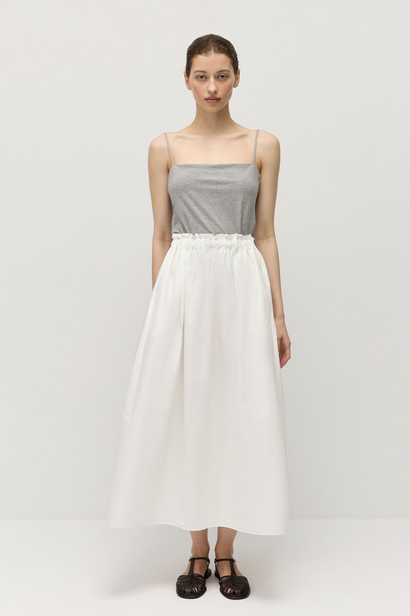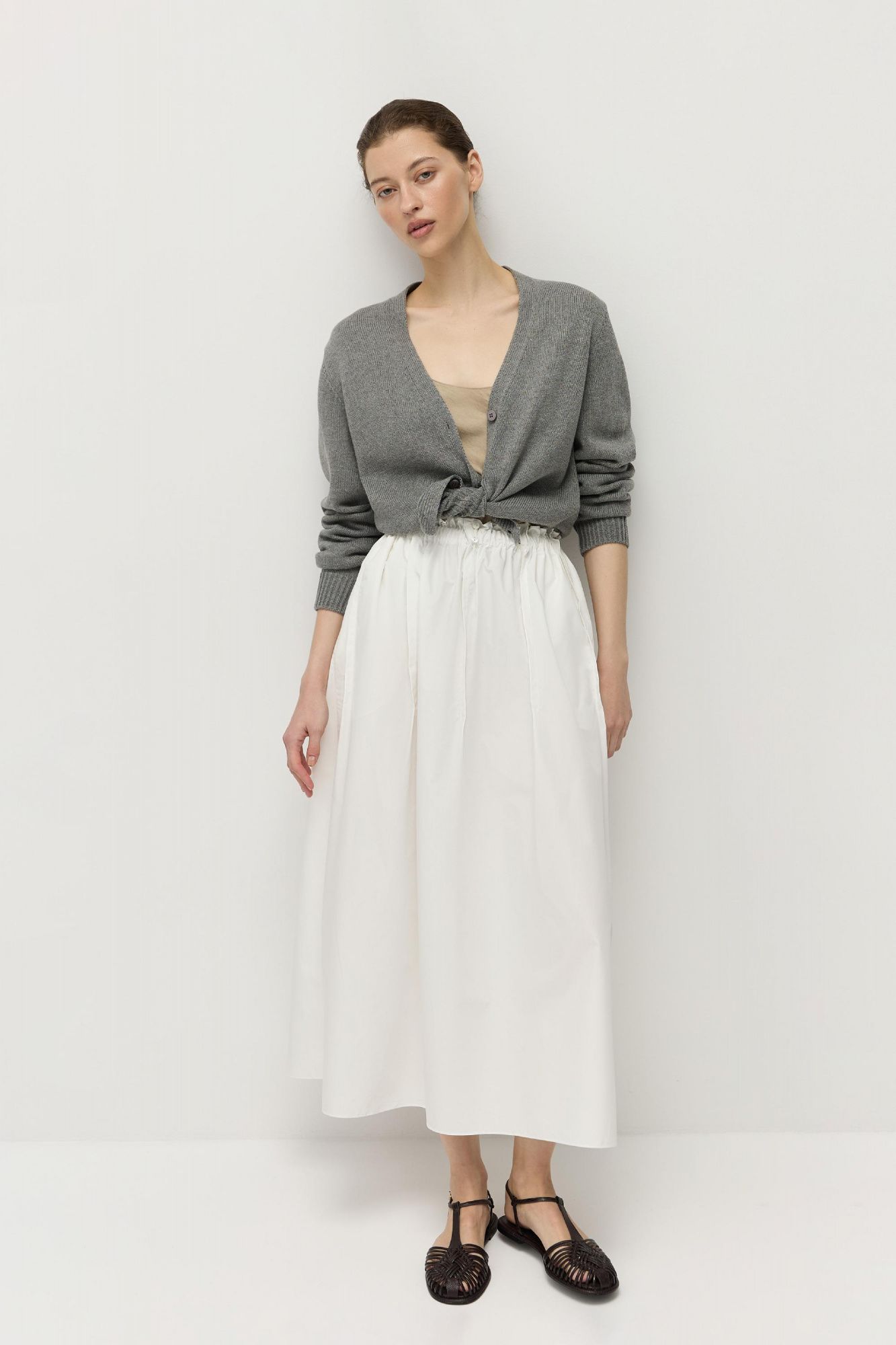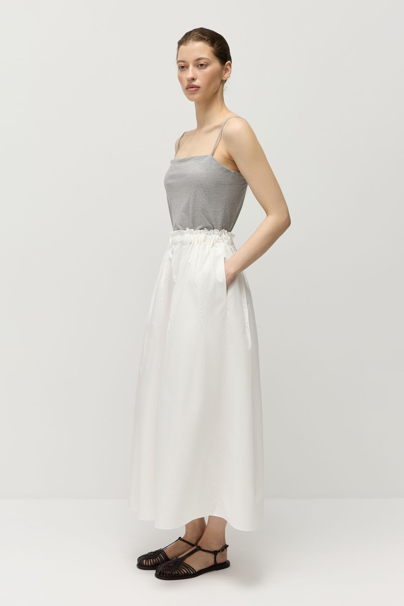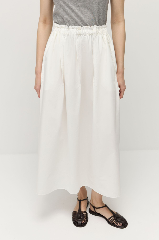 Юбка длины миди А-силуэта сшита из натурального «хрустящего» хлопка.