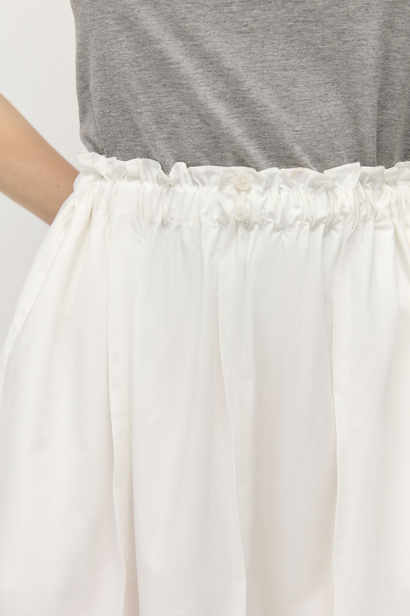 С двумя боковыми швами и резинкой на талии. По верхнему краю юбки предусмотрена декоративная сборка, дополненная декоративными пуговицами из натуральной ракушки.