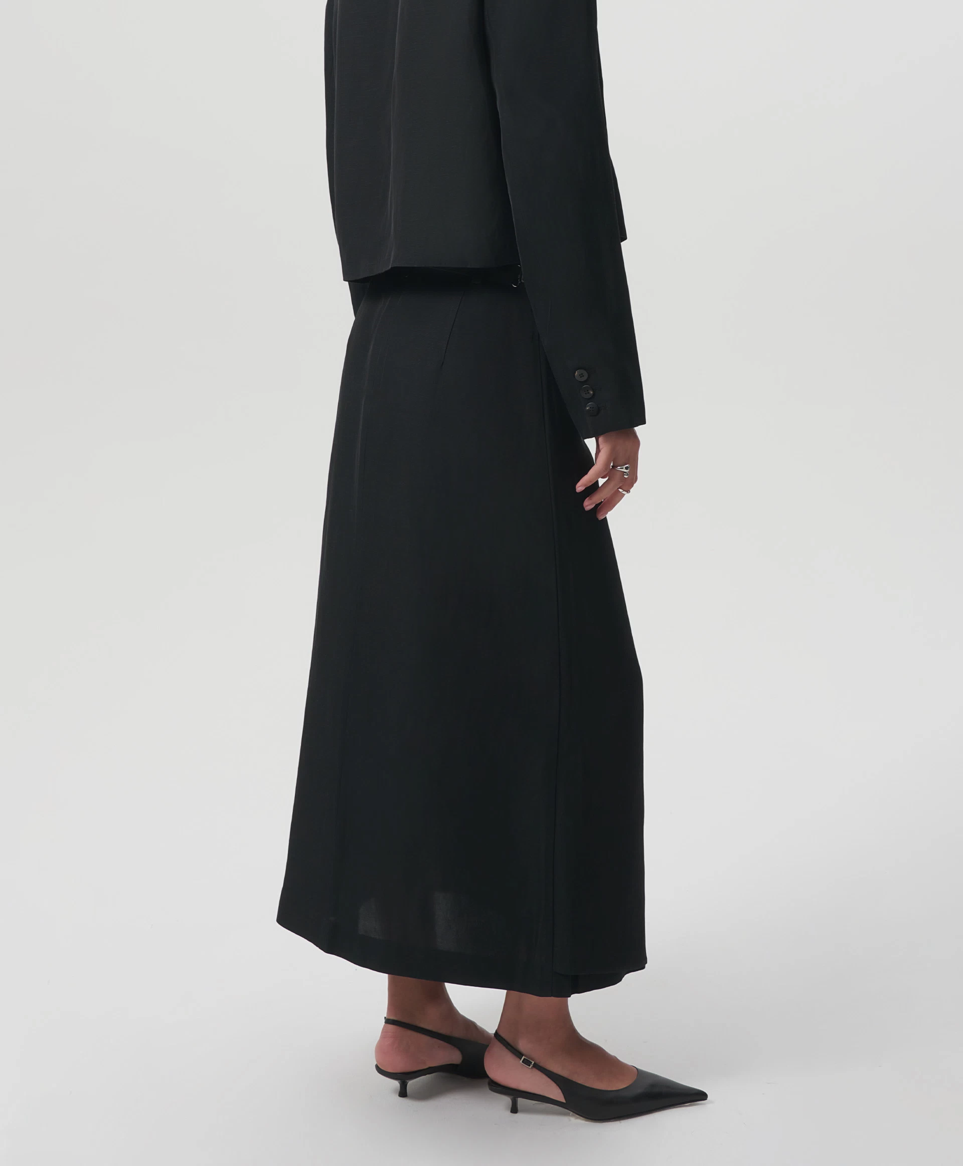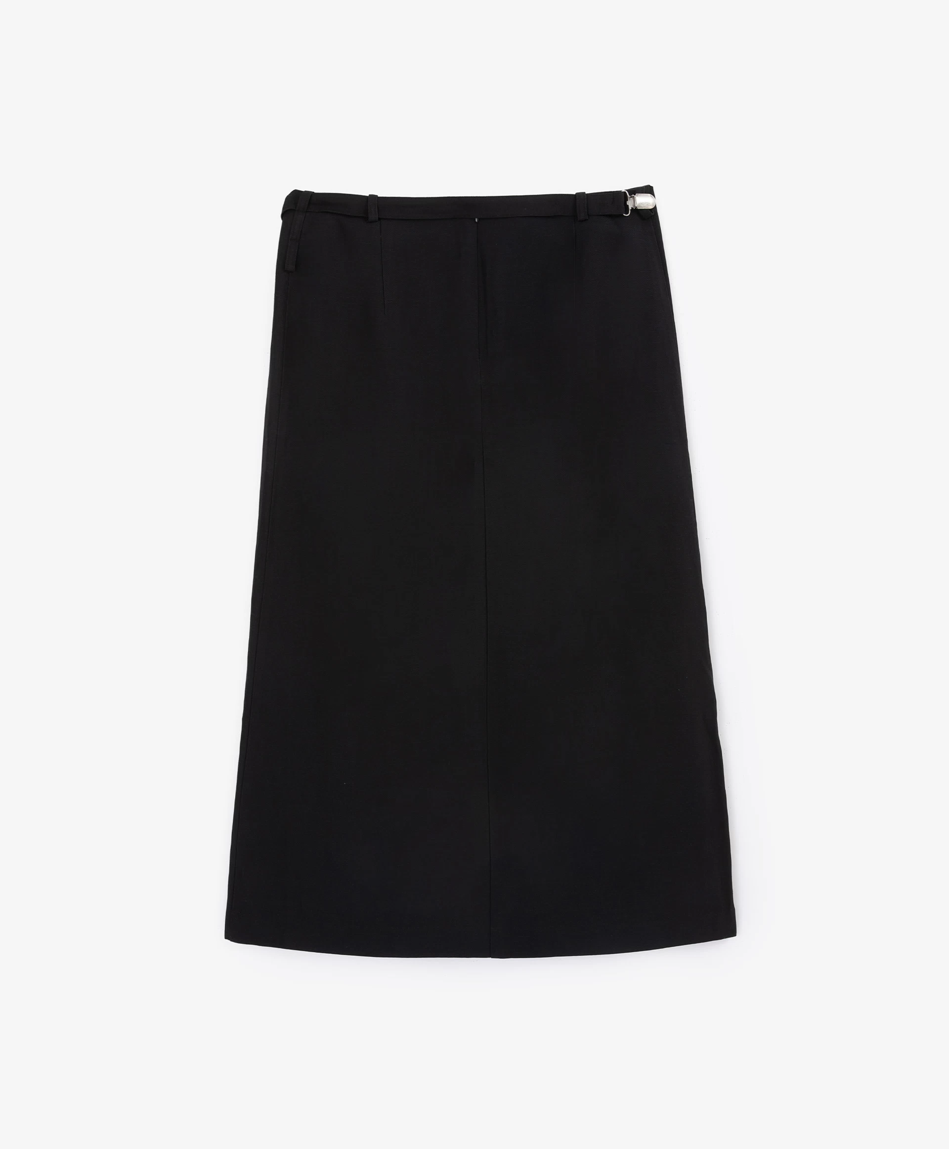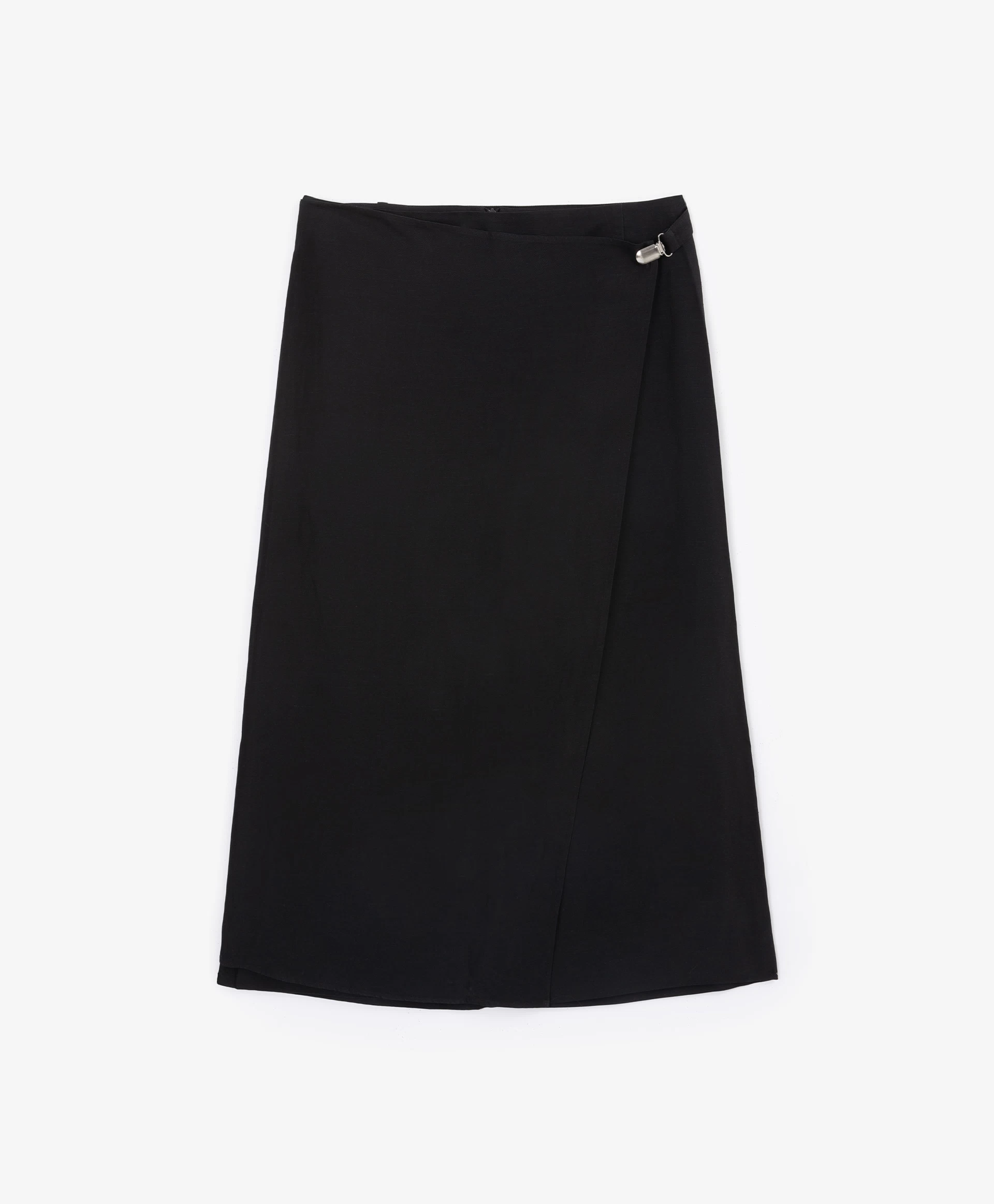 Юбка средней посадки выполнена из скользящего шелковистого текстиля на основе вискозы с высоким содержанием льна. Лен придает изделию легкую чесучевую фактуру, полученную благодаря переплетению нитей разной толщины и плотности. Модель представляет собой основу - прямую юбку длины мидакси (среднее между миди и макси), дополненную асимметричной прямоугольной деталью, вшитой в боковой шов. Она может ниспадать в свободном движении, а также быть зафиксирована металлическими клипсами, прикрепленными к ленте из основной ткани. Клипсы, расположенные с двух сторон от съемной ленты, можно переставлять в любом положении, как внутри изделия, так и объединяя юбку и другие предметы гардероба - по настроению. В любом случае, все образы с юбкой будут выглядеть ярко и небанально, сочетая в себе элегантность и женственность с ноткой юношеской беспечности. Юбка застегивается на потайную молнию на спинке.