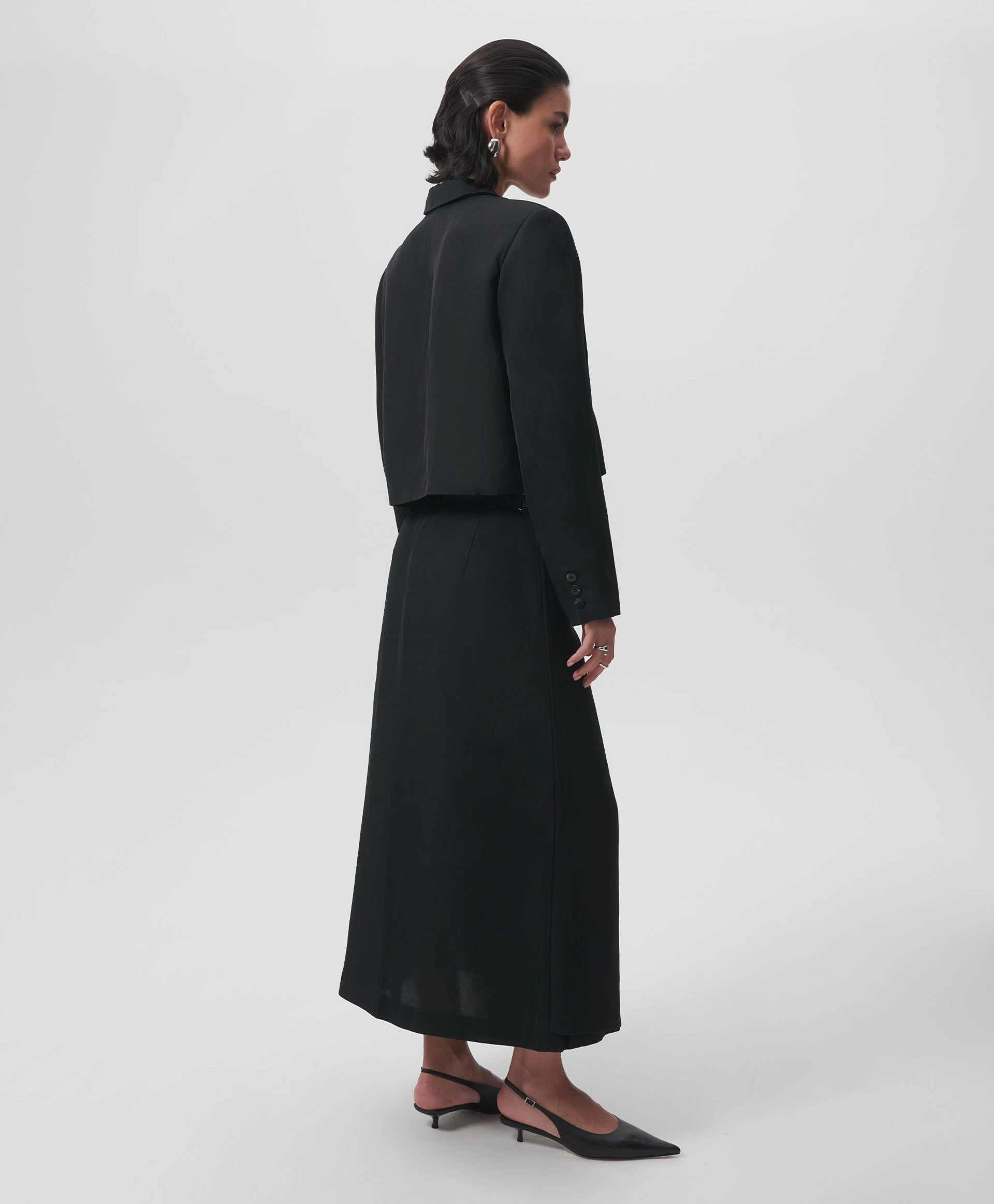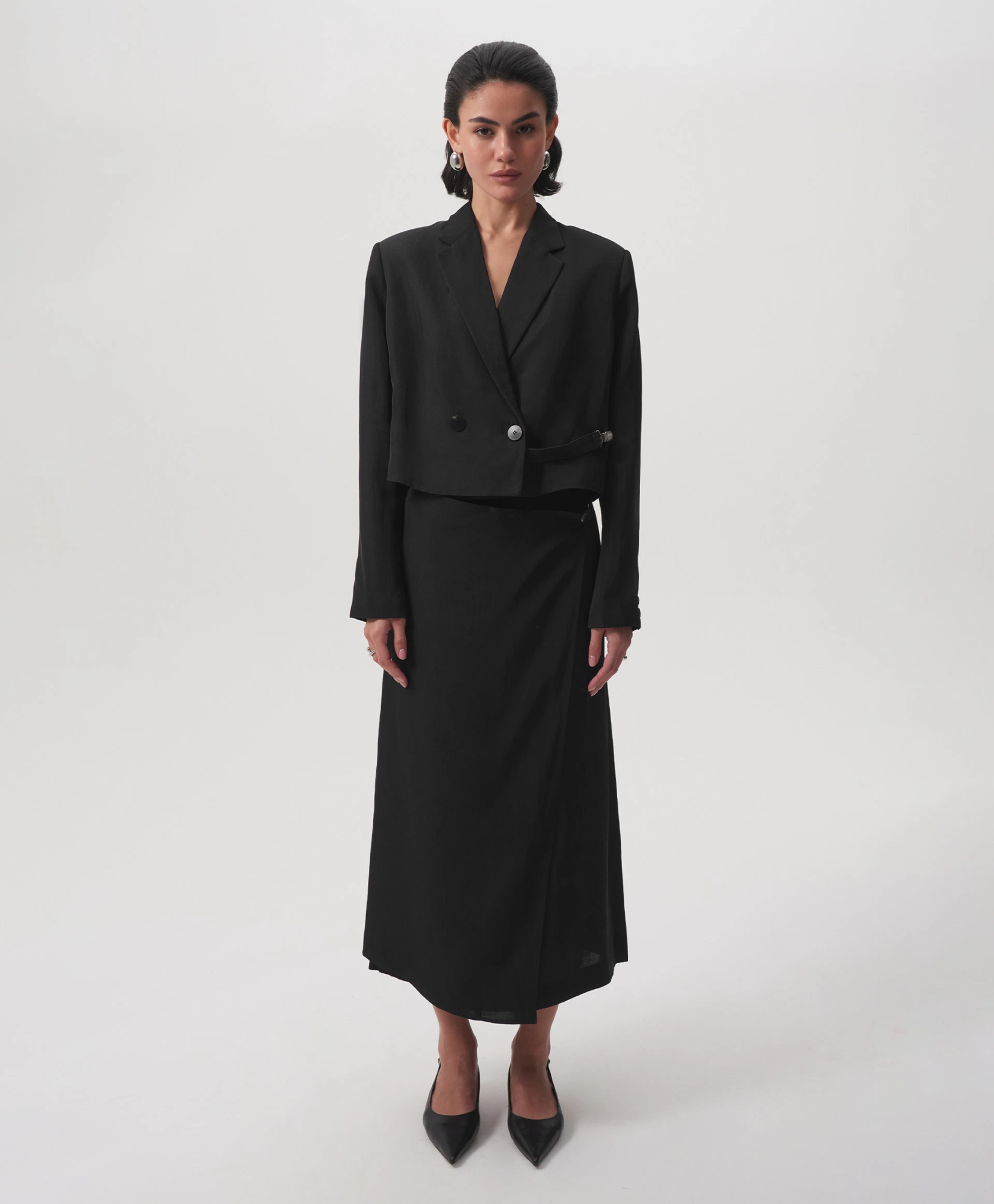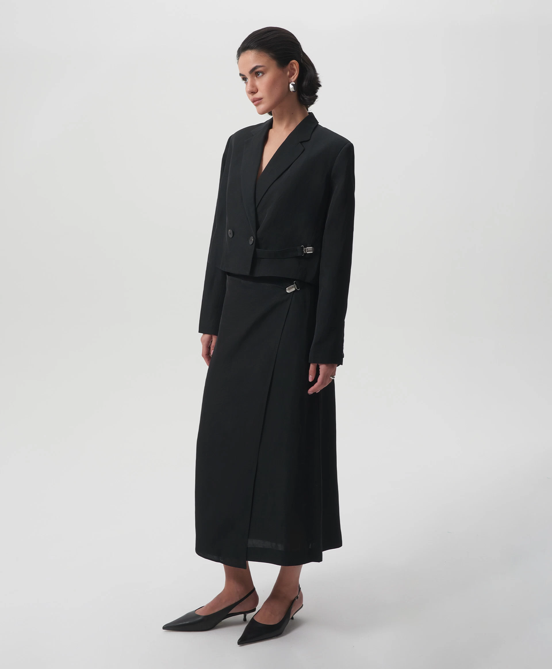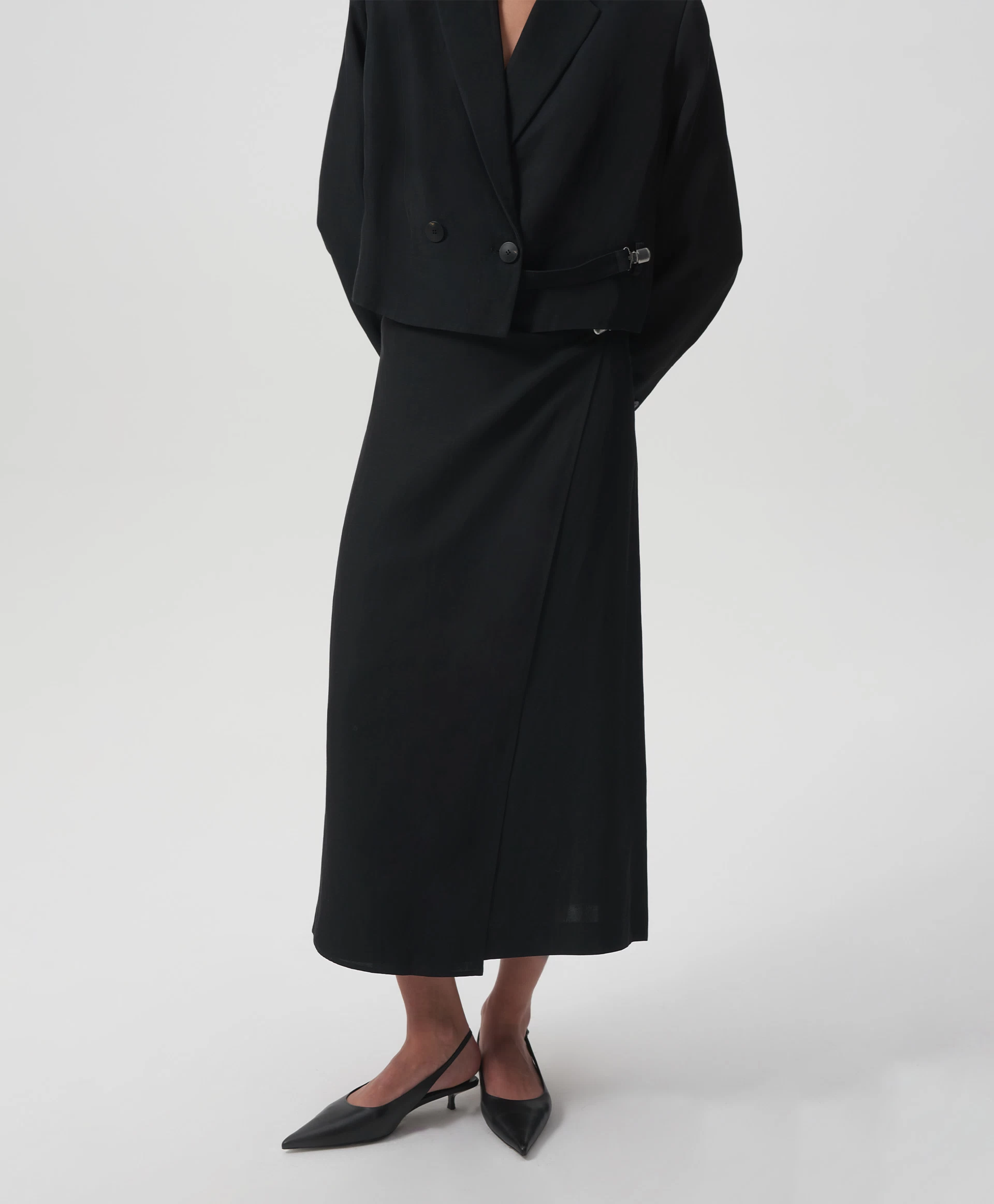 Юбка средней посадки выполнена из скользящего шелковистого текстиля на основе вискозы с высоким содержанием льна. Лен придает изделию легкую чесучевую фактуру, полученную благодаря переплетению нитей разной толщины и плотности. Модель представляет собой основу - прямую юбку длины мидакси (среднее между миди и макси), дополненную асимметричной прямоугольной деталью, вшитой в боковой шов. Она может ниспадать в свободном движении, а также быть зафиксирована металлическими клипсами, прикрепленными к ленте из основной ткани. Клипсы, расположенные с двух сторон от съемной ленты, можно переставлять в любом положении, как внутри изделия, так и объединяя юбку и другие предметы гардероба - по настроению. В любом случае, все образы с юбкой будут выглядеть ярко и небанально, сочетая в себе элегантность и женственность с ноткой юношеской беспечности. Юбка застегивается на потайную молнию на спинке.
