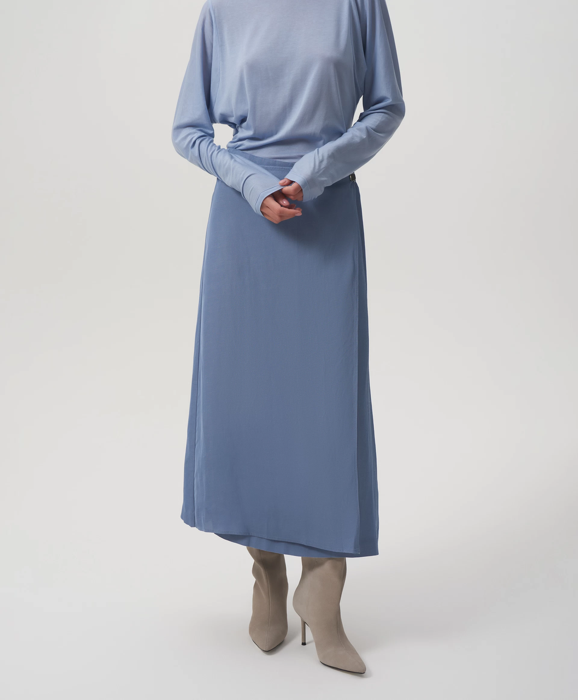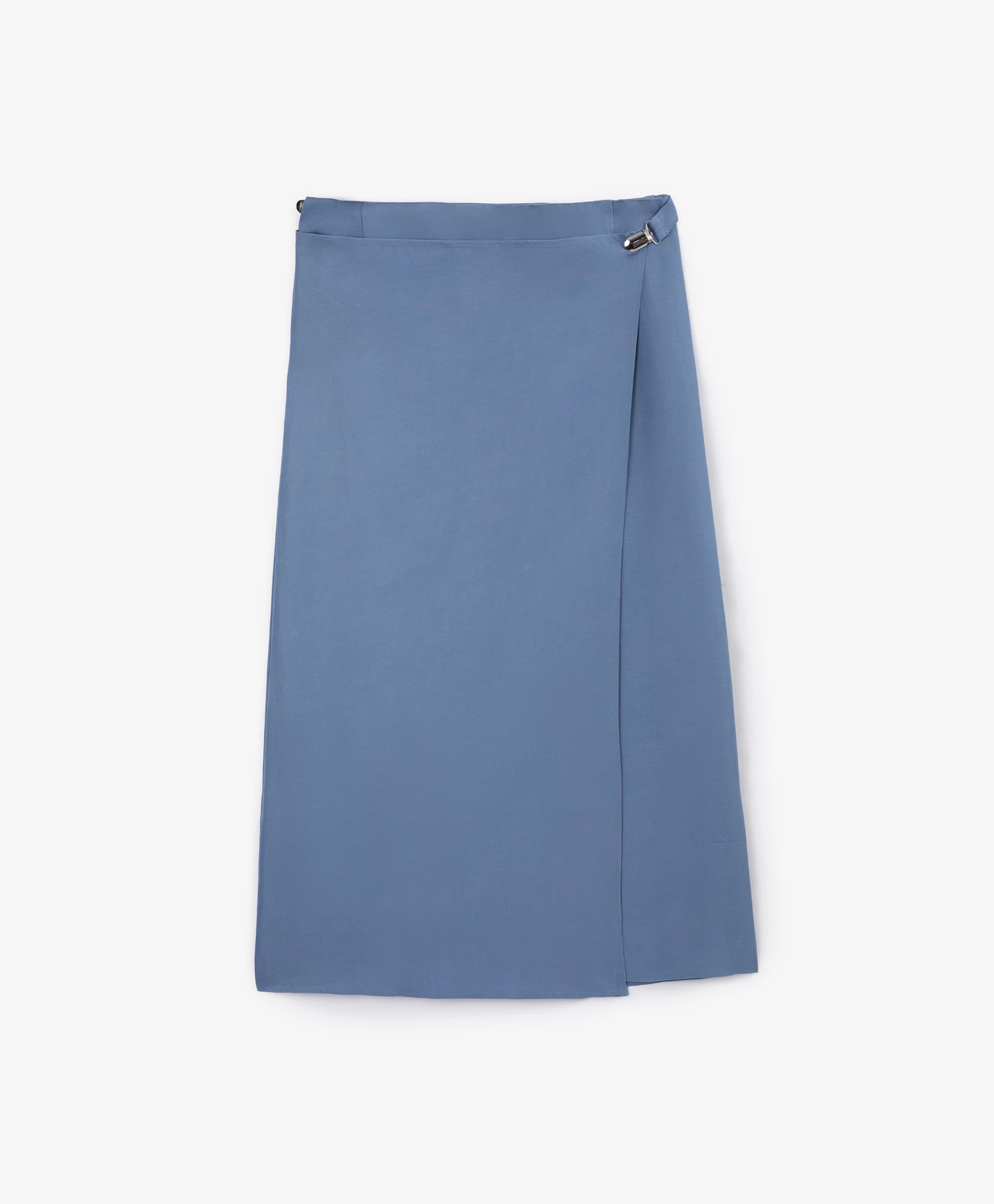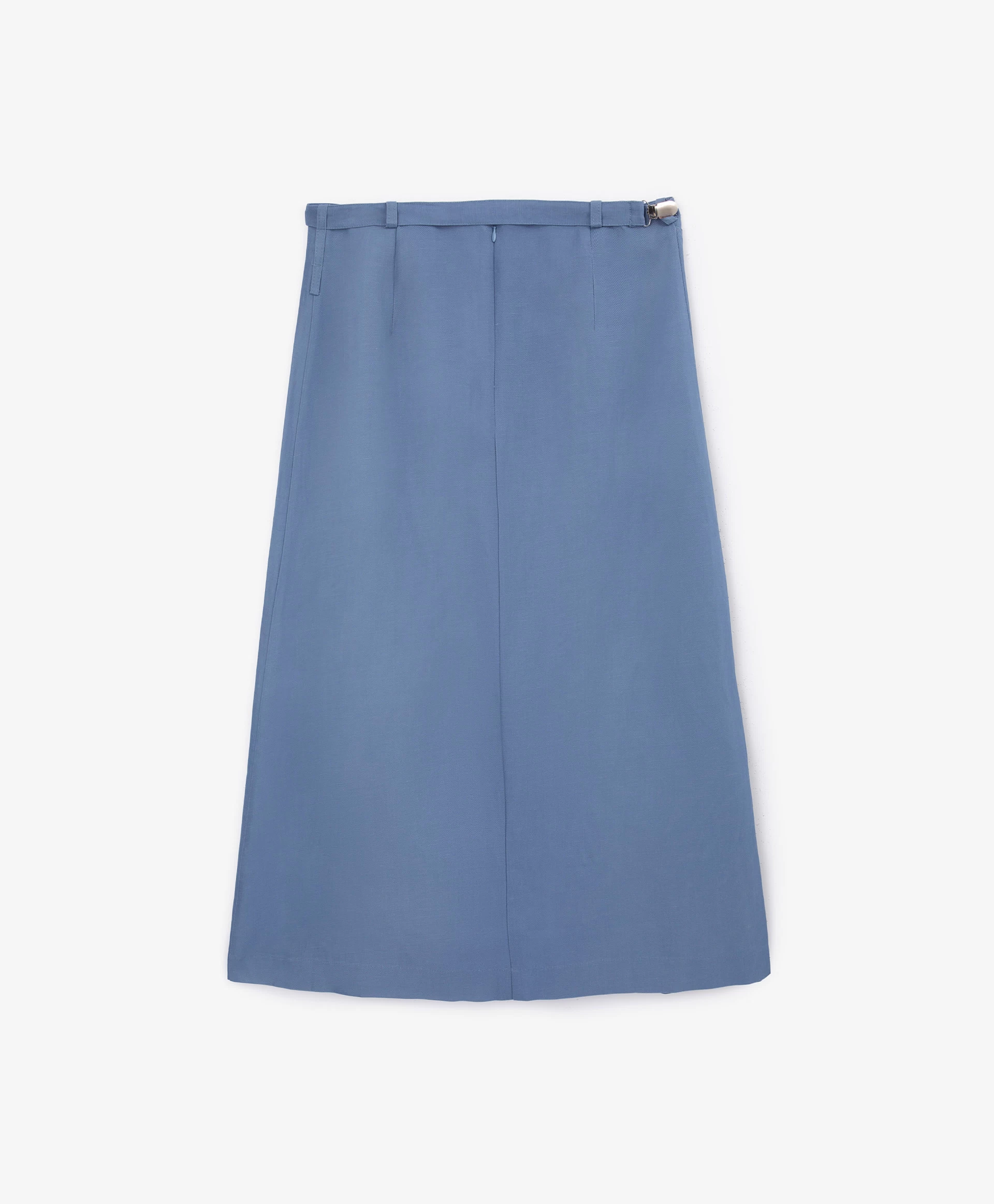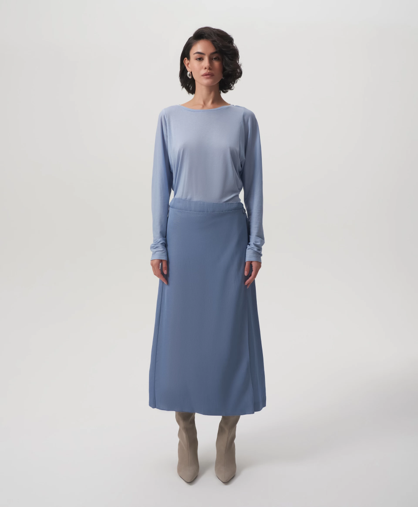 Юбка средней посадки выполнена из скользящего шелковистого текстиля на основе вискозы с высоким содержанием льна. Лен придает изделию легкую чесучевую фактуру, полученную благодаря переплетению нитей разной толщины и плотности. Модель представляет собой основу - прямую юбку длины мидакси (среднее между миди и макси), дополненную асимметричной прямоугольной деталью, вшитой в боковой шов. Она может ниспадать в свободном движении, а также быть зафиксирована металлическими клипсами, прикрепленными к ленте из основной ткани. Клипсы, расположенные с двух сторон от съемной ленты, можно переставлять в любом положении, как внутри изделия, так и объединяя юбку и другие предметы гардероба - по настроению. В любом случае, все образы с юбкой будут выглядеть интересно и небанально, сочетая в себе элегантность и женственность с ноткой юношеской беспечности. Юбка застегивается на потайную молнию на спинке.