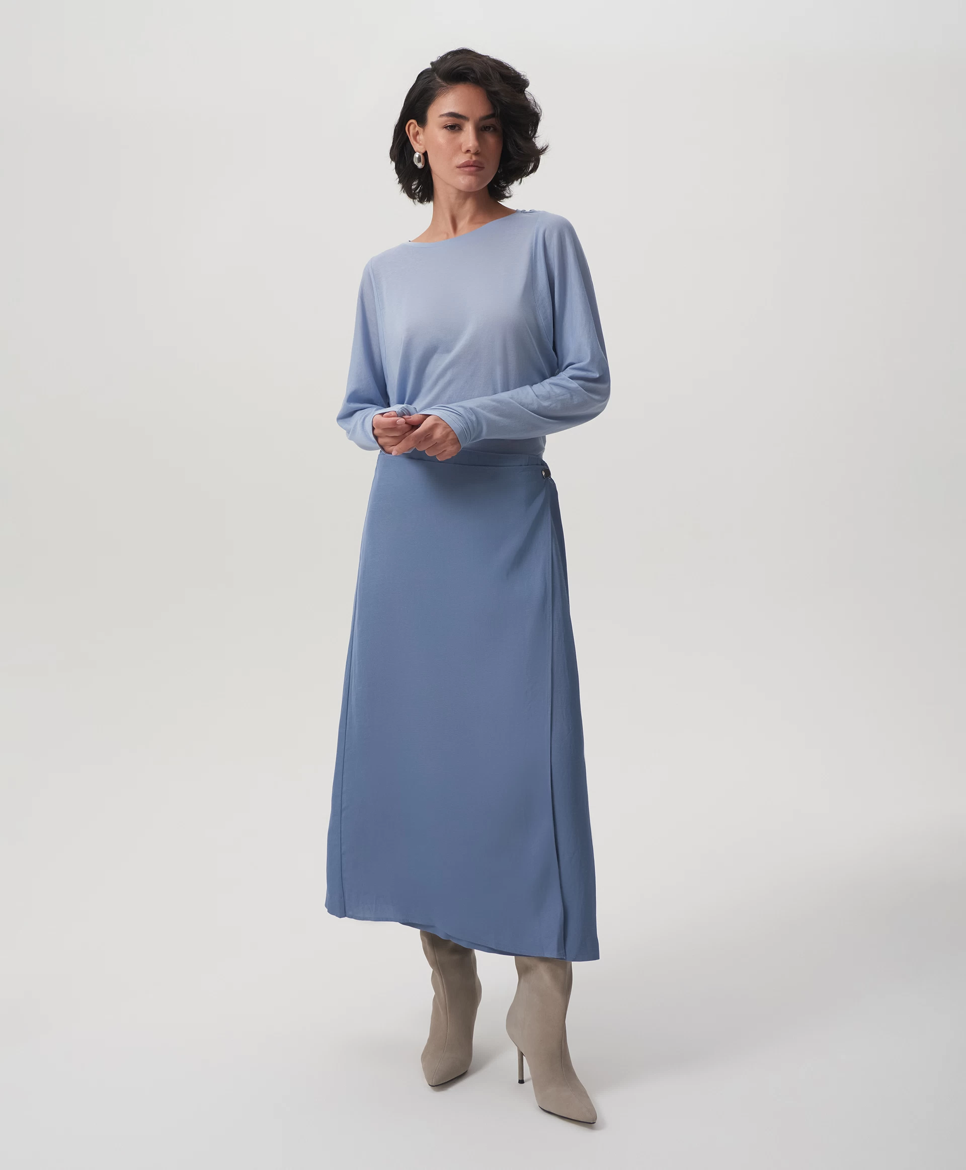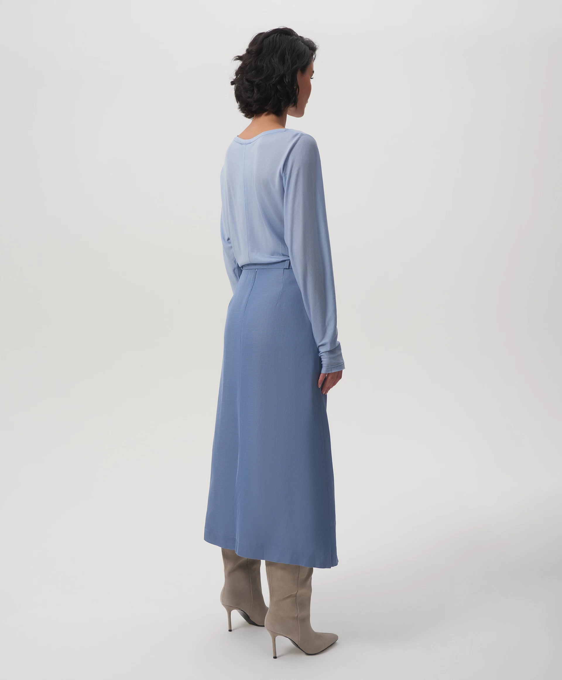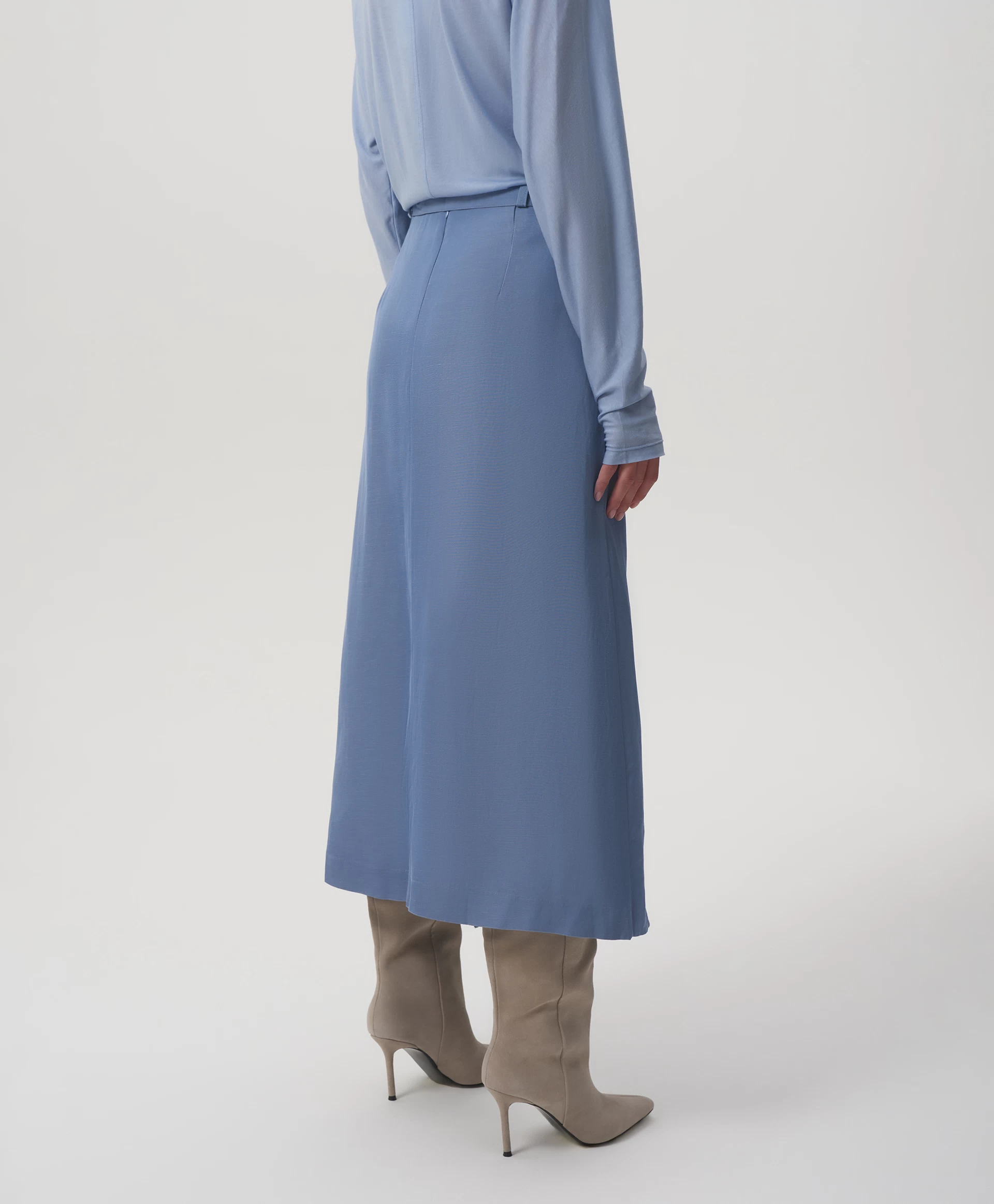 Юбка средней посадки выполнена из скользящего шелковистого текстиля на основе вискозы с высоким содержанием льна. Лен придает изделию легкую чесучевую фактуру, полученную благодаря переплетению нитей разной толщины и плотности. Модель представляет собой основу - прямую юбку длины мидакси (среднее между миди и макси), дополненную асимметричной прямоугольной деталью, вшитой в боковой шов. Она может ниспадать в свободном движении, а также быть зафиксирована металлическими клипсами, прикрепленными к ленте из основной ткани. Клипсы, расположенные с двух сторон от съемной ленты, можно переставлять в любом положении, как внутри изделия, так и объединяя юбку и другие предметы гардероба - по настроению. В любом случае, все образы с юбкой будут выглядеть интересно и небанально, сочетая в себе элегантность и женственность с ноткой юношеской беспечности. Юбка застегивается на потайную молнию на спинке.