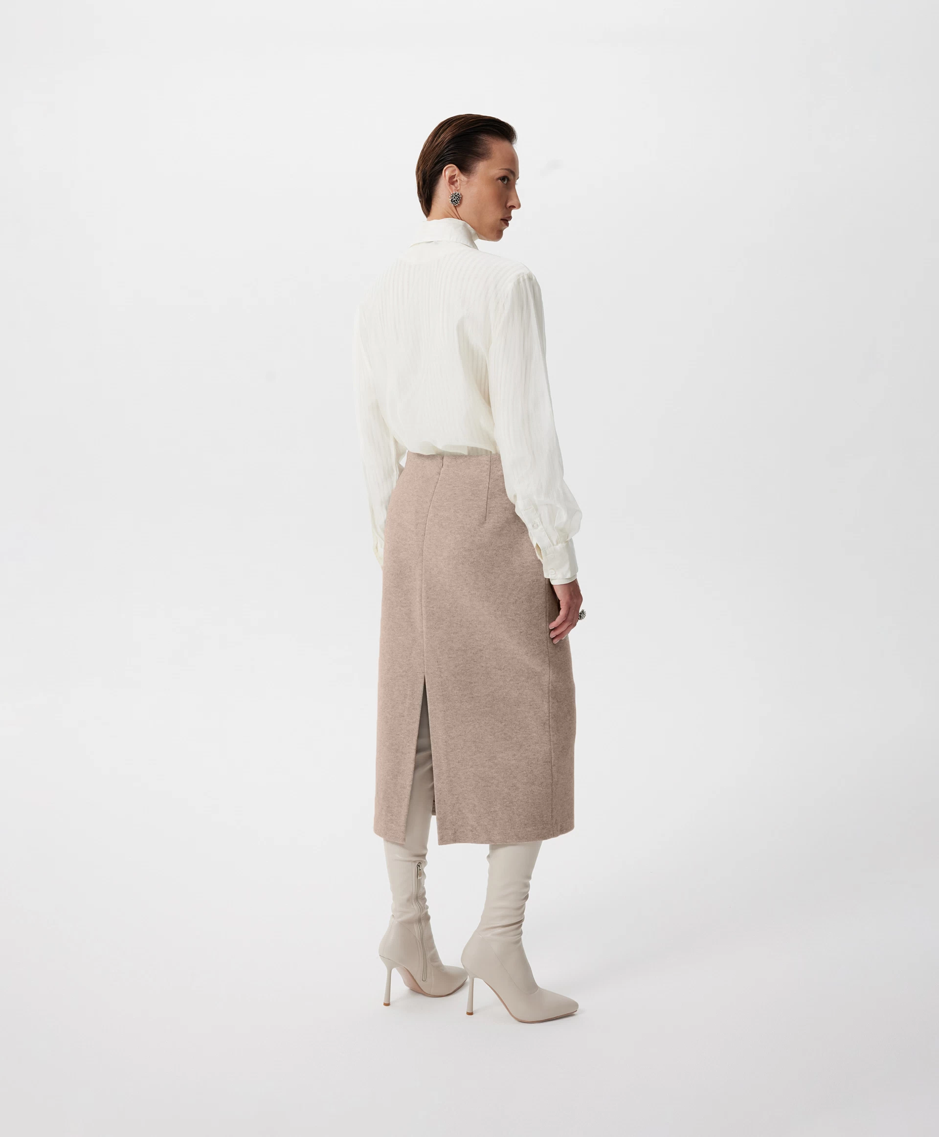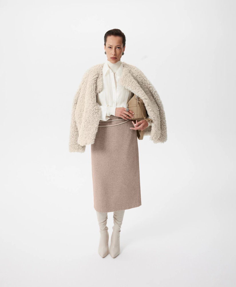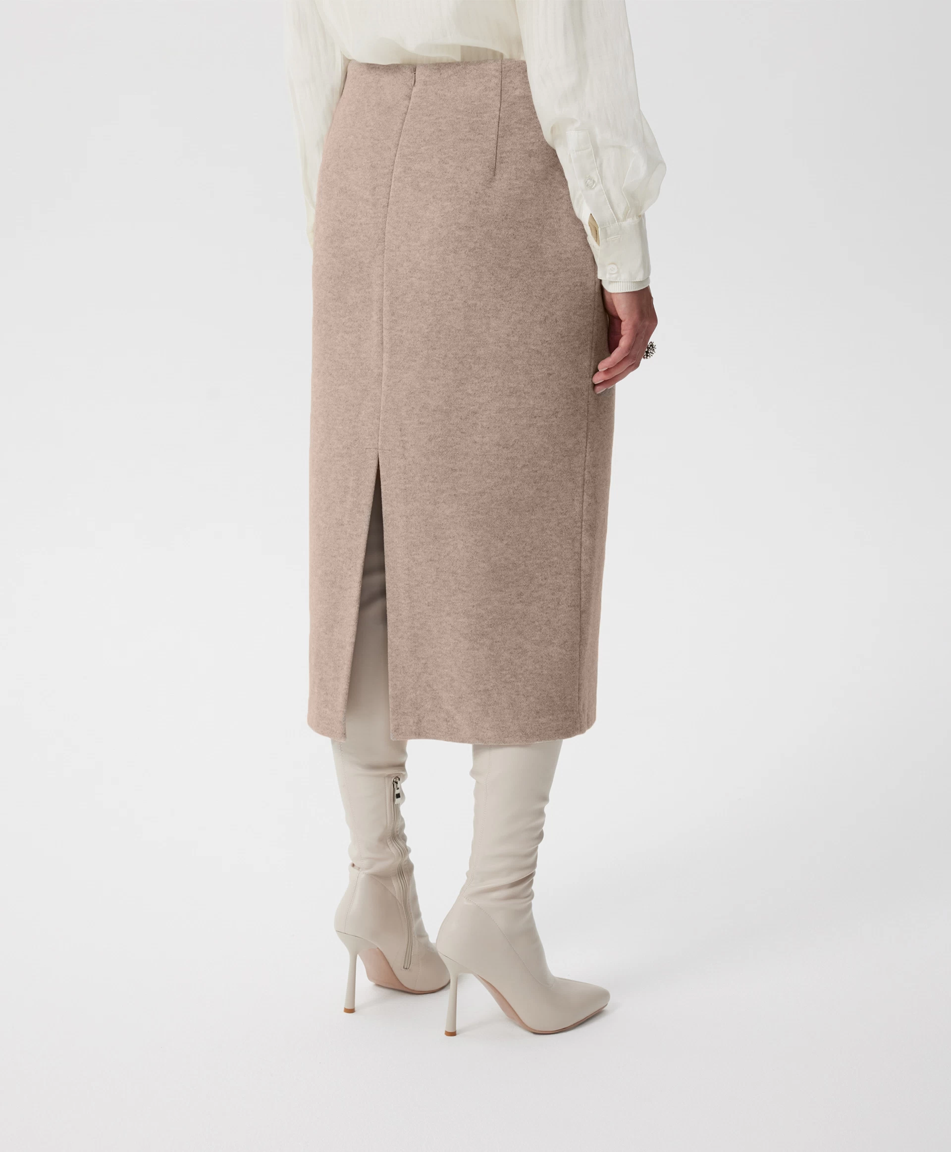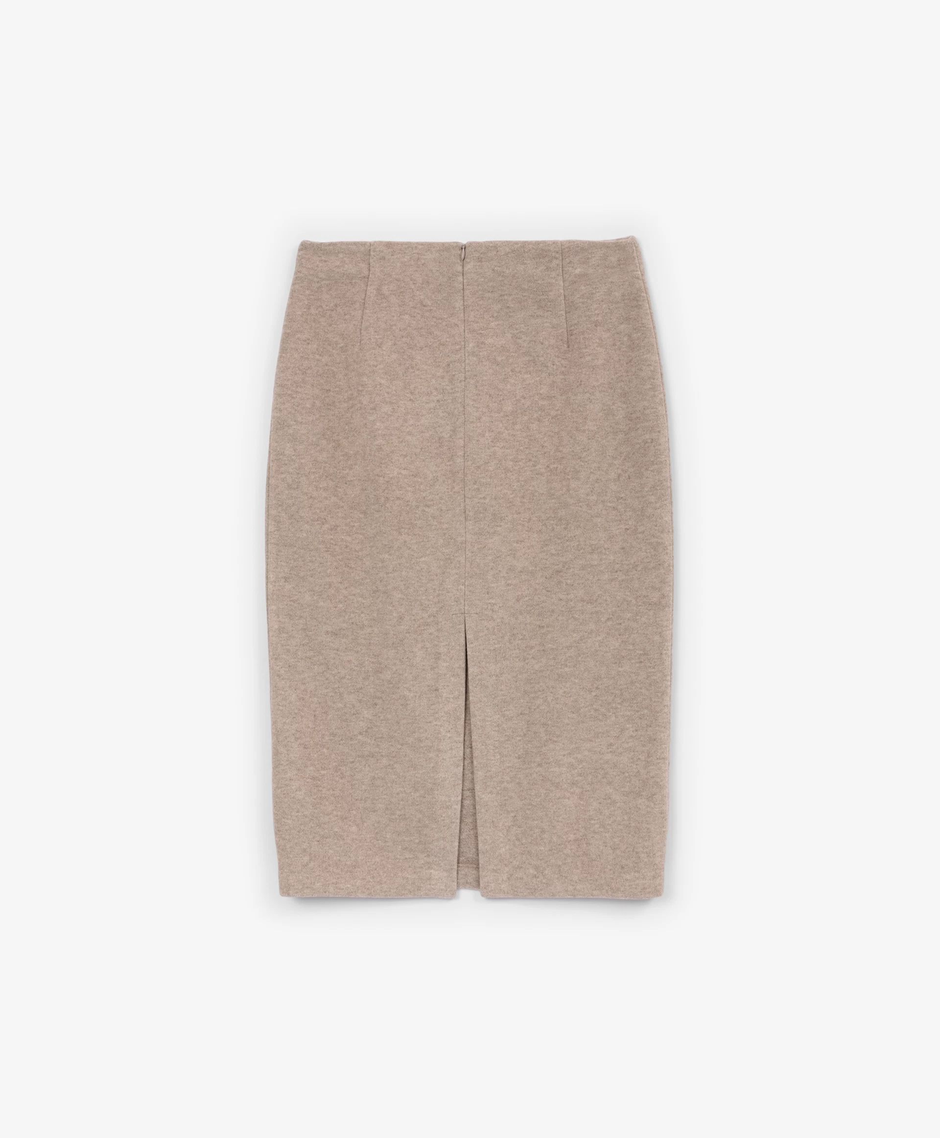 Юбка-карандаш средней посадки длины мидакси (среднее между миди и макси) — отражение элегантного минимализма, нестареющая классика, воплощённая в мягком комфортном трикотаже благородного и дорогого по восприятию бежевого цвета. Многокомпонентный состав на основе района (разновидность вискозы), меланжевая структура делают материал похожим на мягчайшую костюмную ткань с лёгким бархатистым ворсом. Юбка без подкладки отлично держит форму и обладает невероятной тактильной притягательностью. Она станет основой осенне-зимнего гардероба, прекрасно вписываясь и в деловые, и в повседневные образы. Юбка имеет разрез на задней части для комфортного шага.