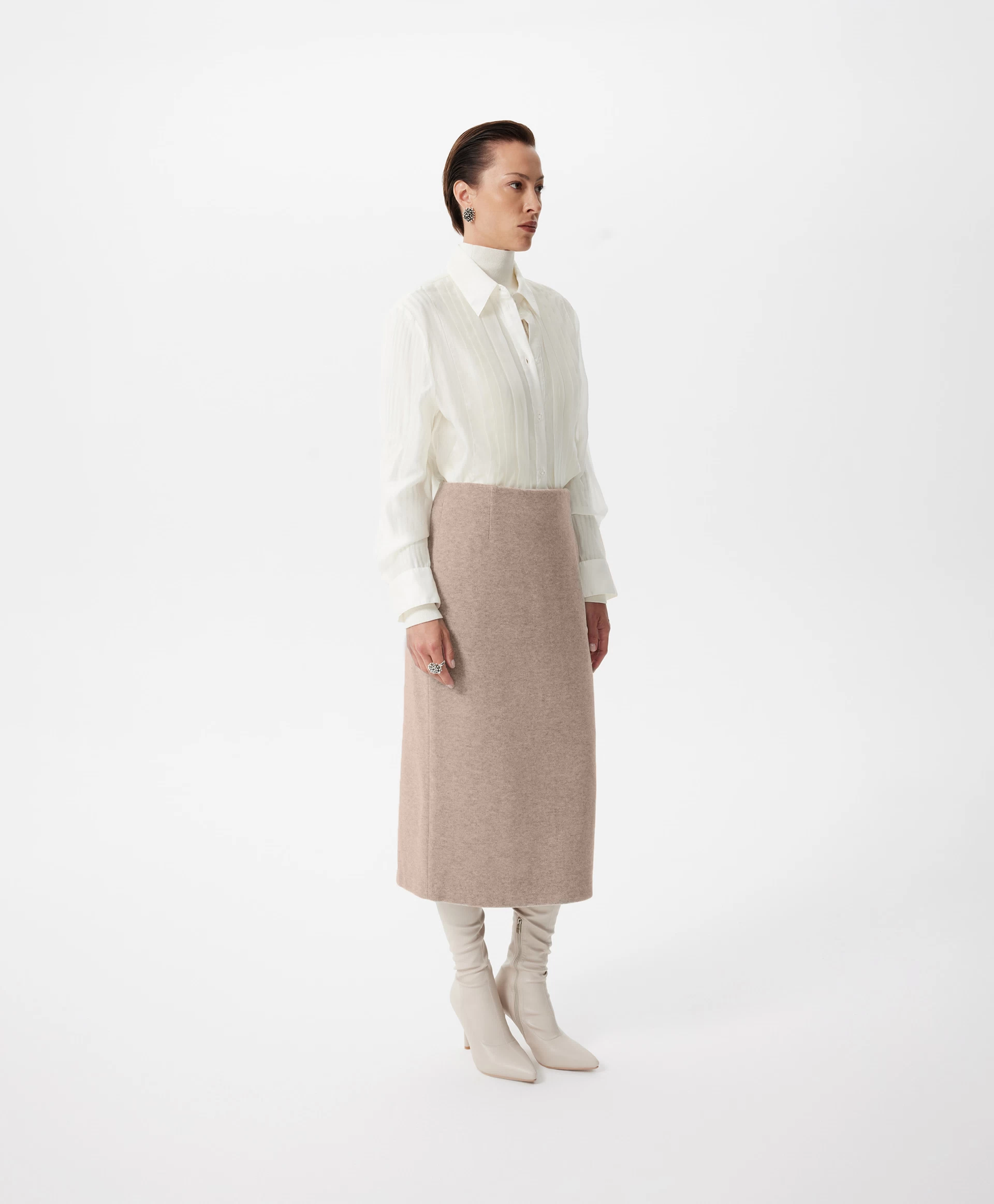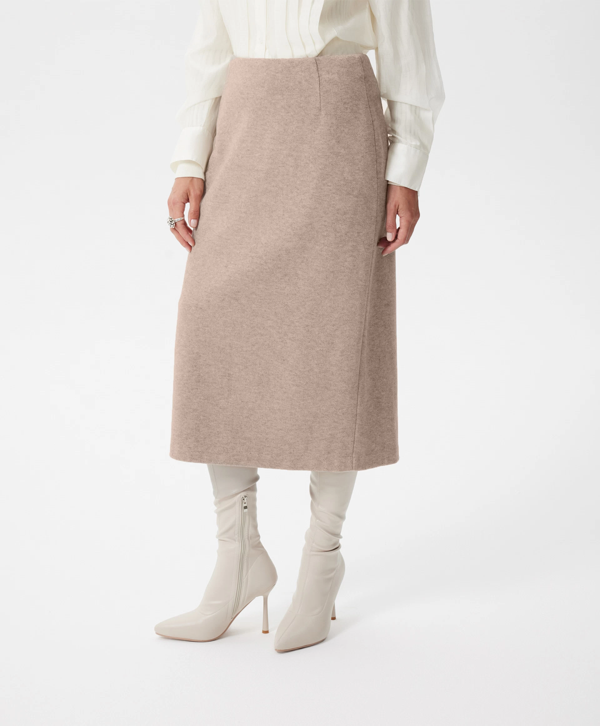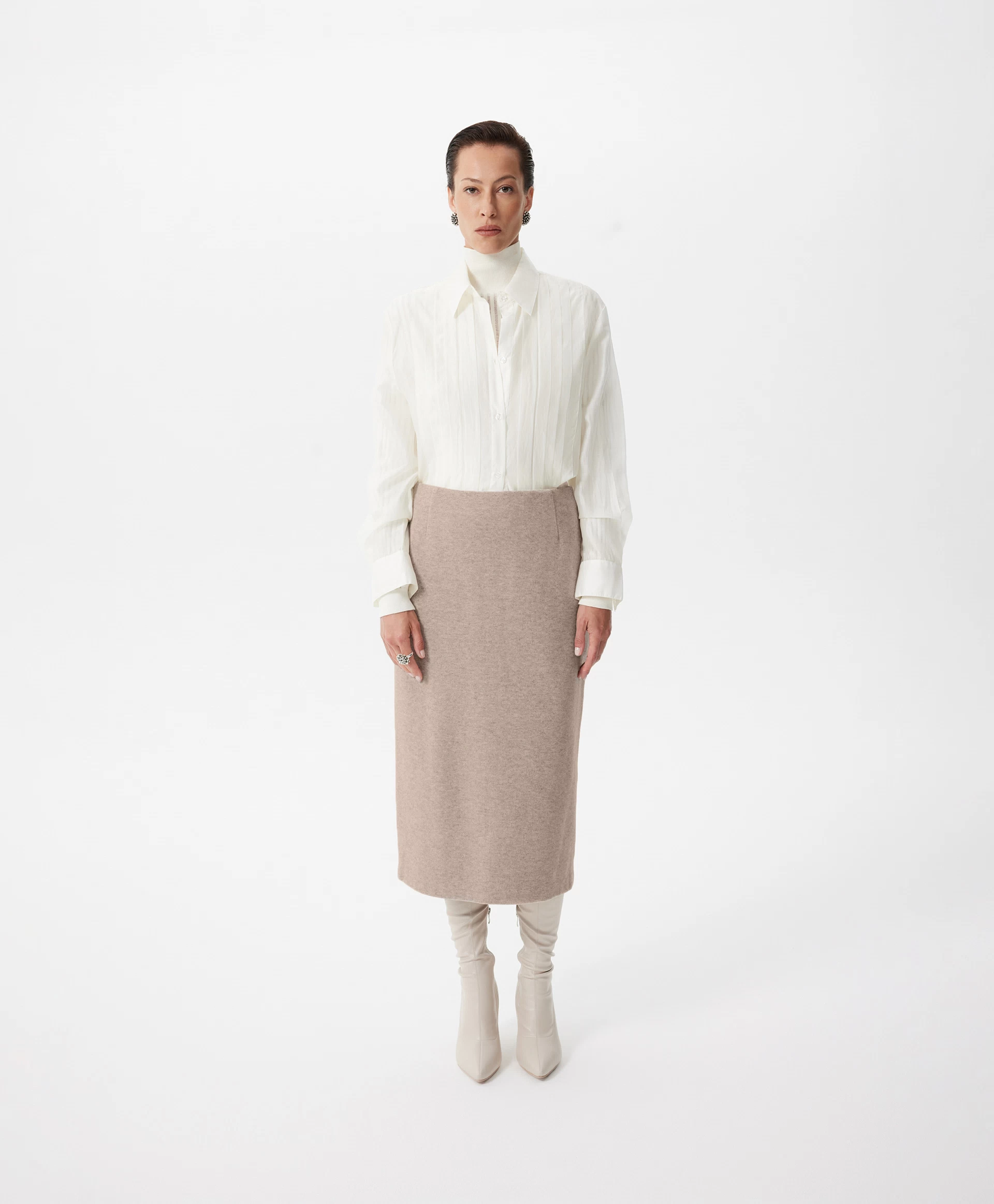 Юбка-карандаш средней посадки длины мидакси (среднее между миди и макси) — отражение элегантного минимализма, нестареющая классика, воплощённая в мягком комфортном трикотаже благородного и дорогого по восприятию бежевого цвета. Многокомпонентный состав на основе района (разновидность вискозы), меланжевая структура делают материал похожим на мягчайшую костюмную ткань с лёгким бархатистым ворсом. Юбка без подкладки отлично держит форму и обладает невероятной тактильной притягательностью. Она станет основой осенне-зимнего гардероба, прекрасно вписываясь и в деловые, и в повседневные образы. Юбка имеет разрез на задней части для комфортного шага.