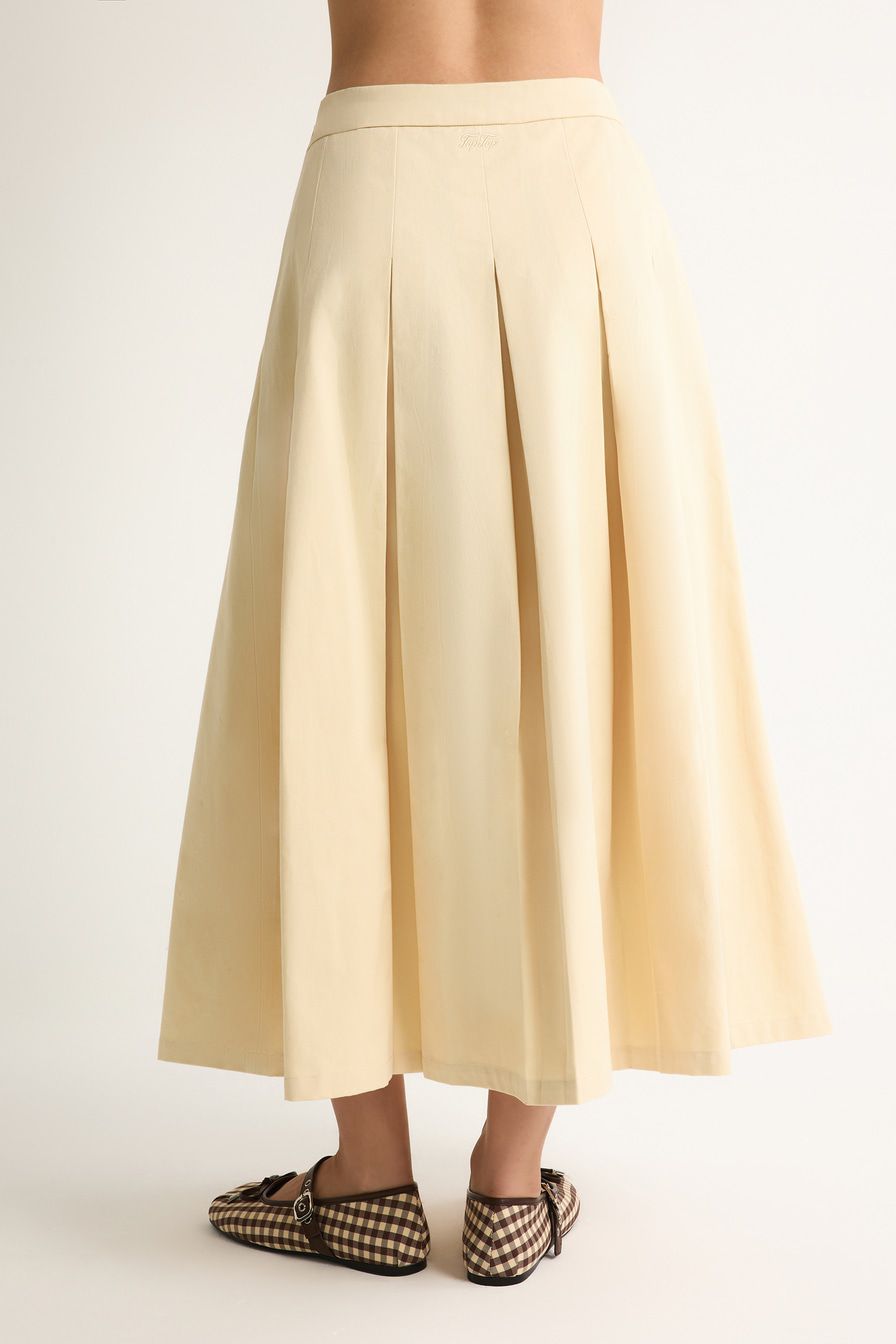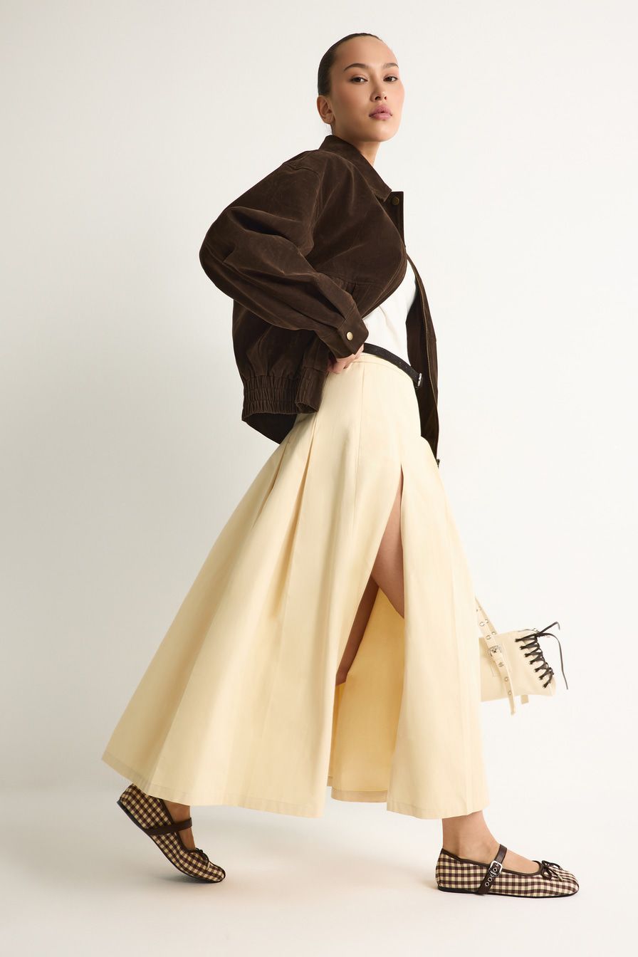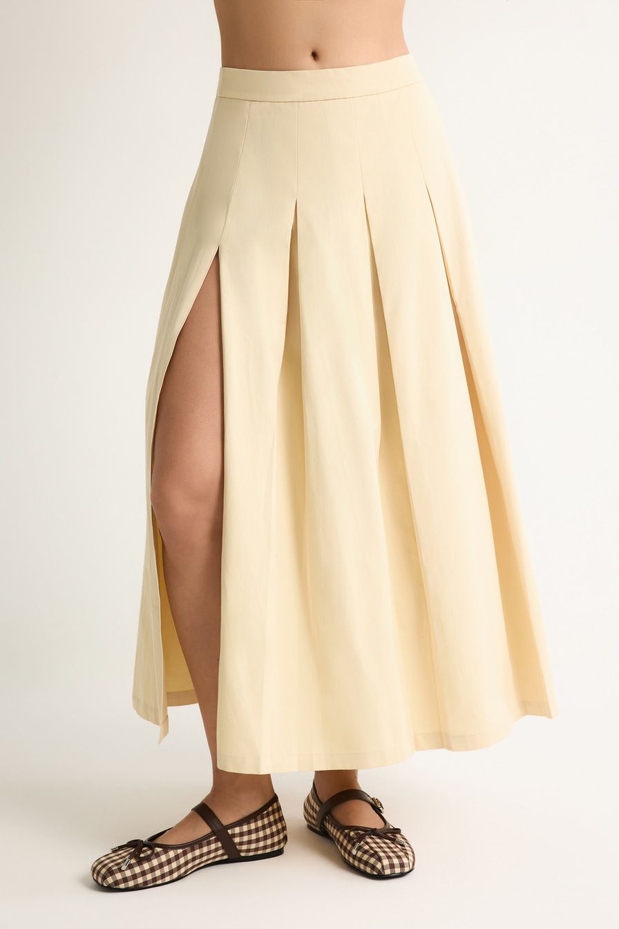 Светло-бежевая юбка-миди А-силуэта выполнена из плотного хлопка, декорирована высоким разрезом и встречными складками.