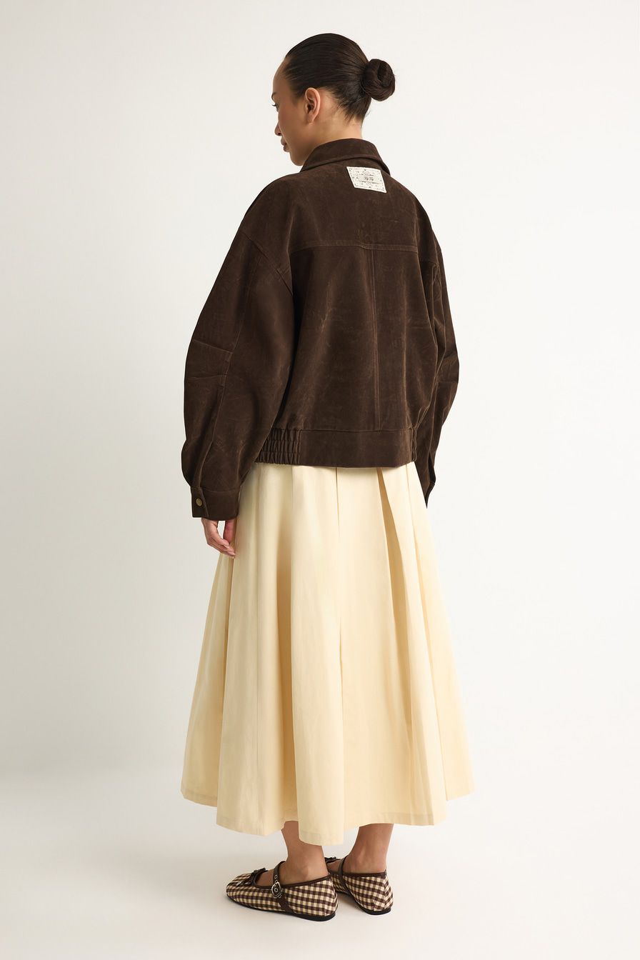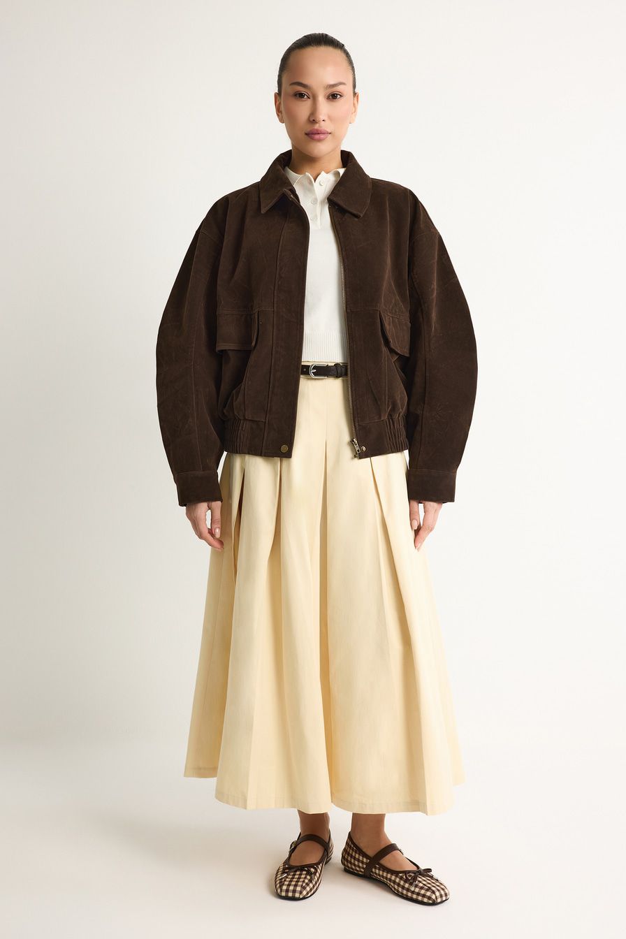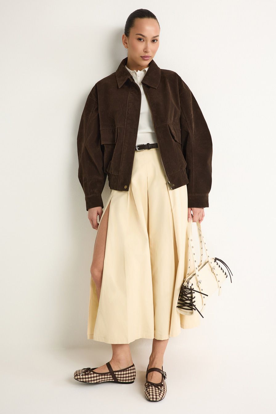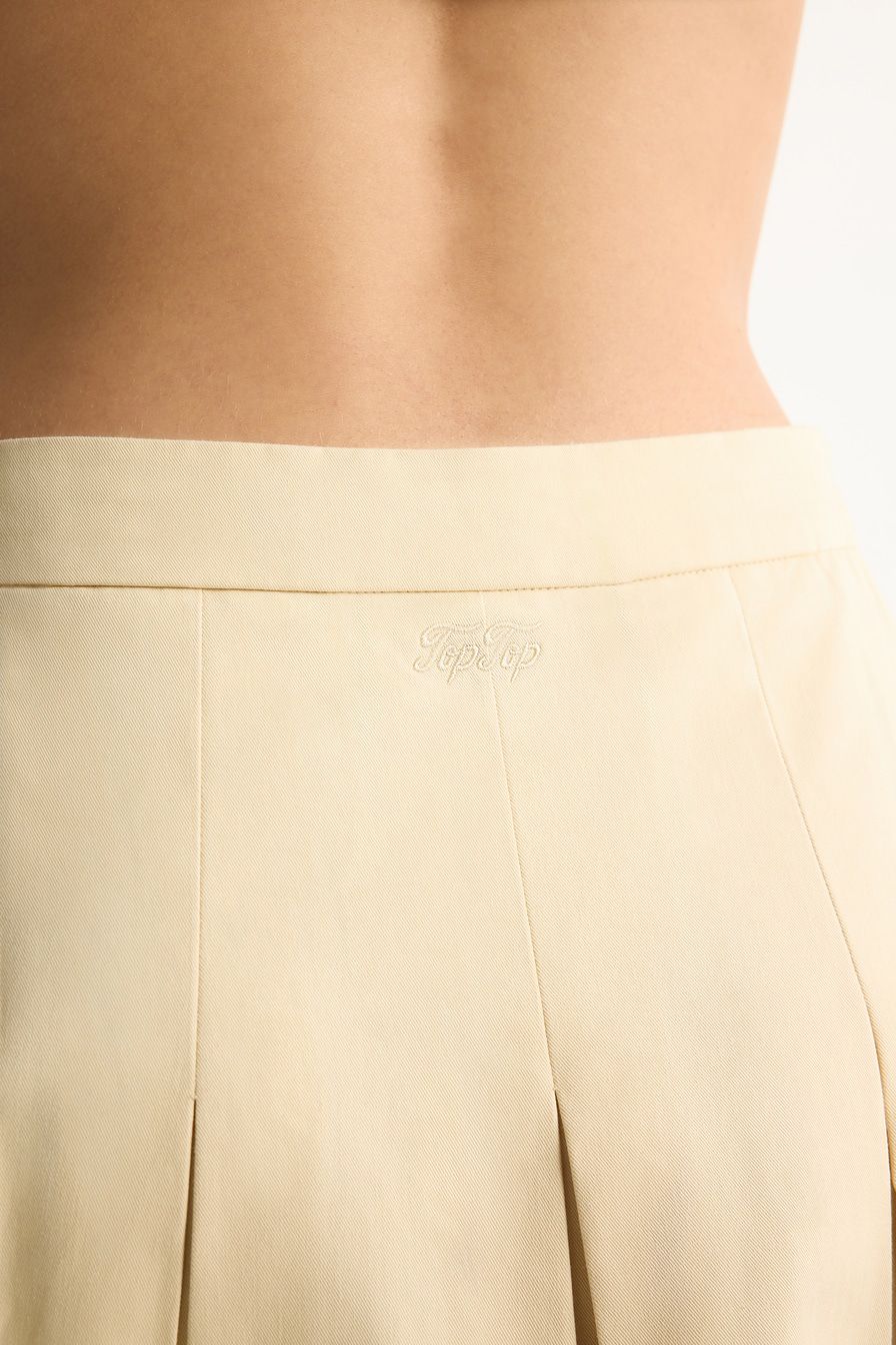 Светло-бежевая юбка-миди А-силуэта выполнена из плотного хлопка, декорирована высоким разрезом и встречными складками.