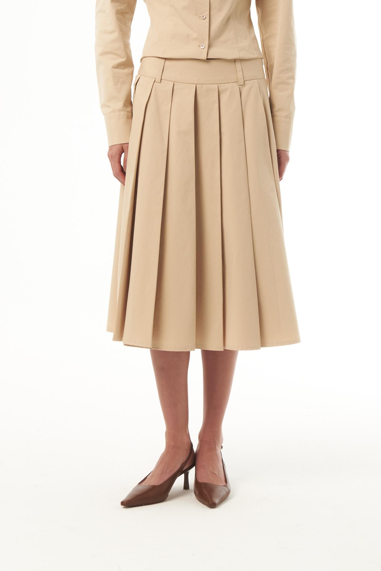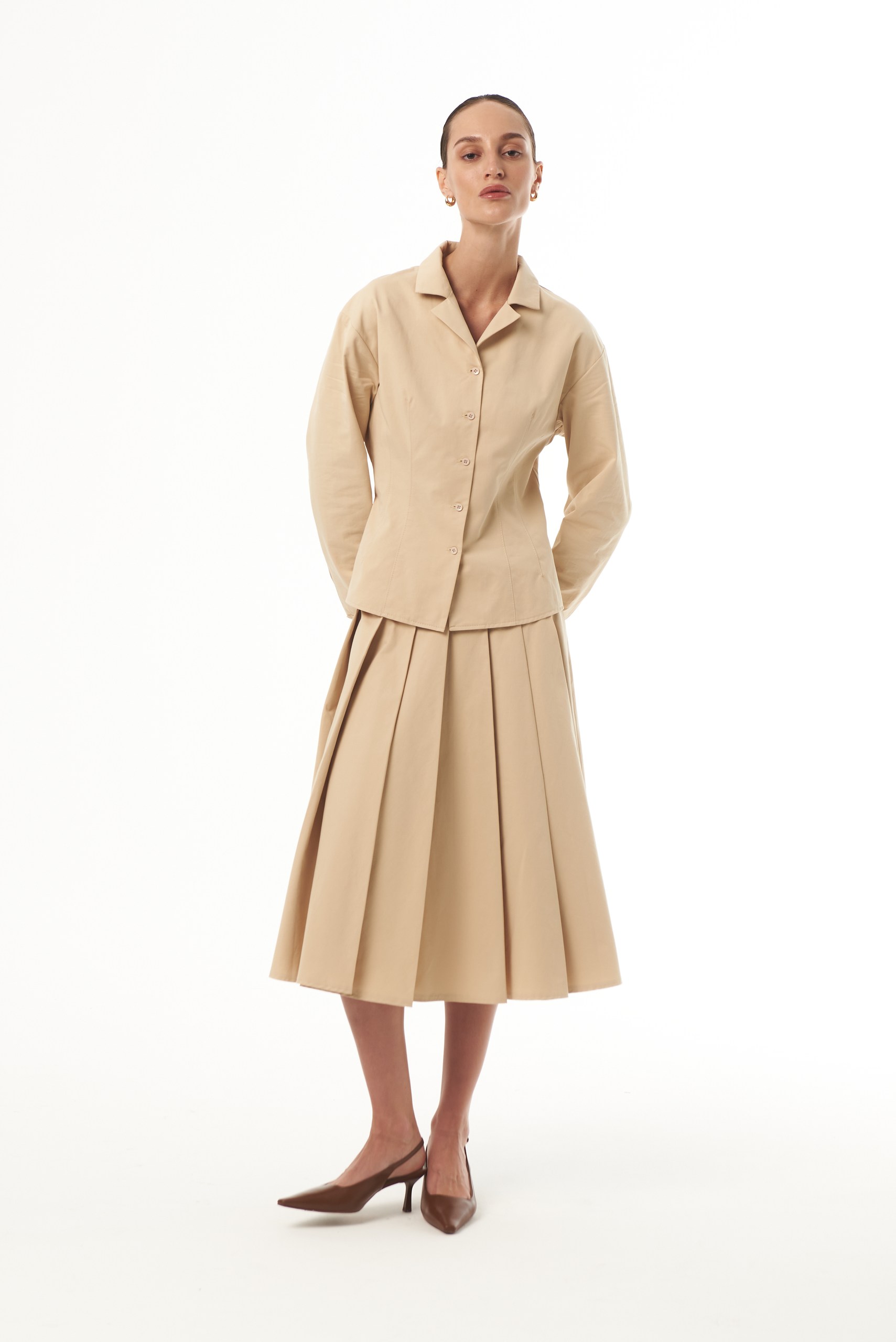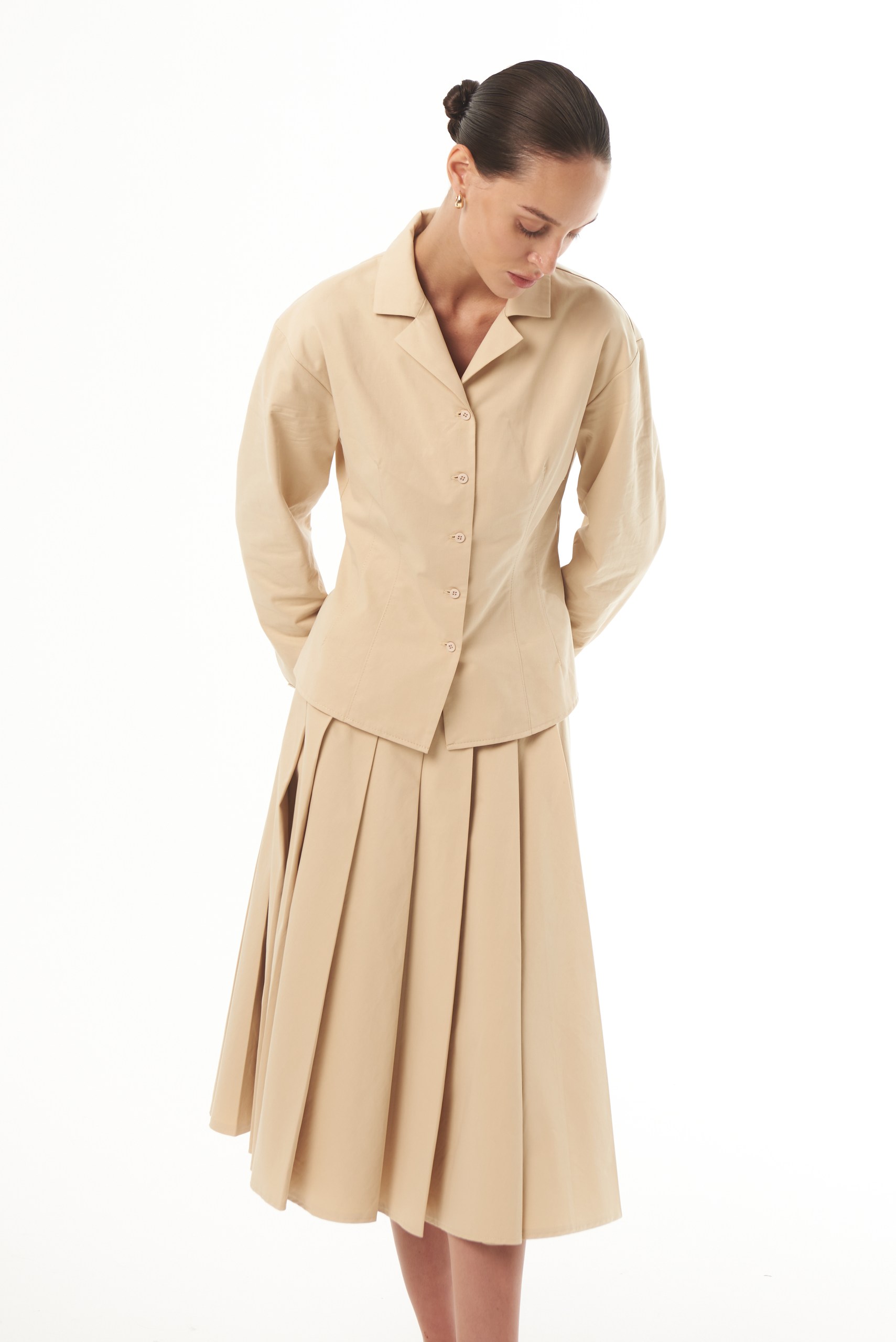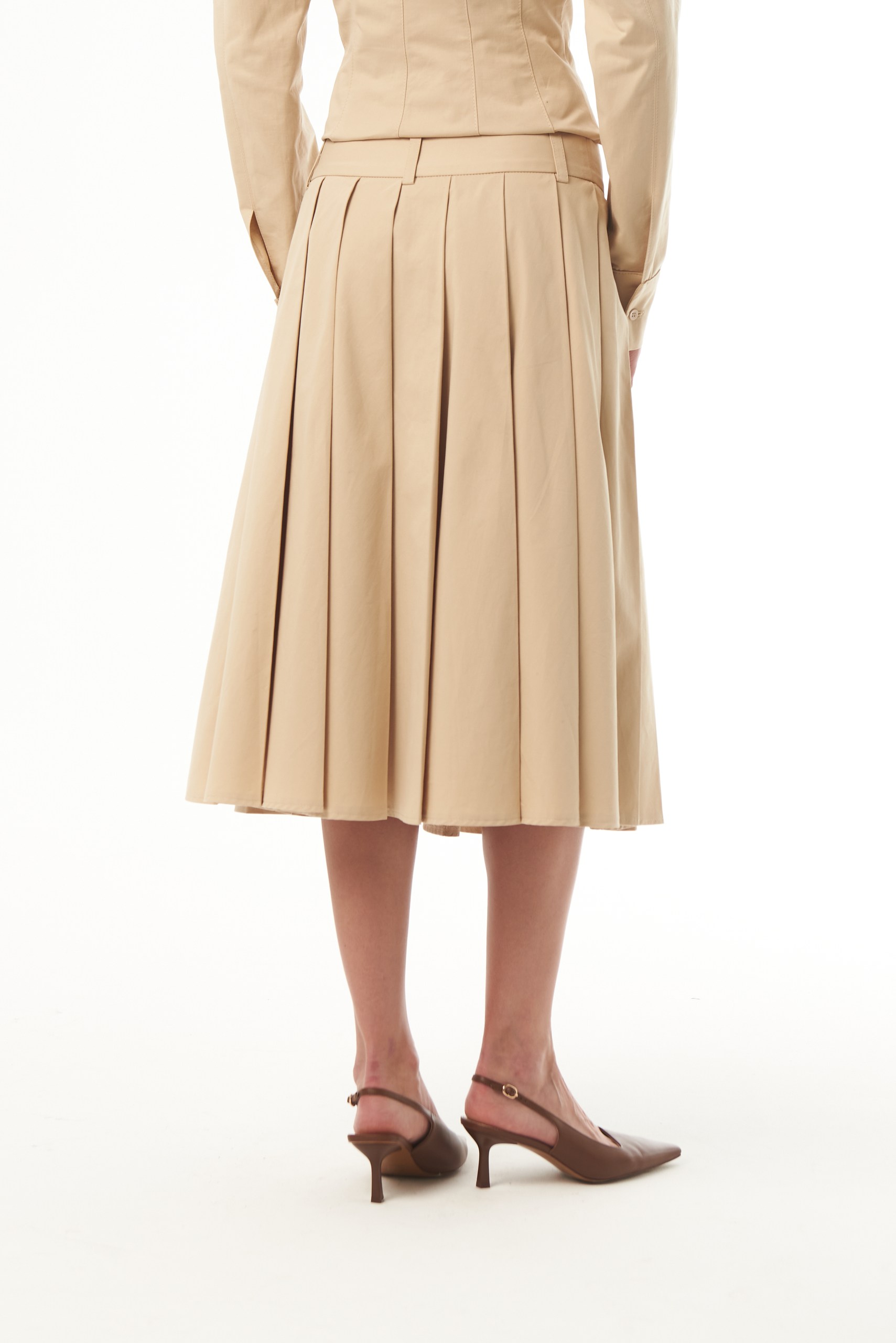Юбка малого объёма, со складками, небольшим расклешением по линии низа, с притачным поясом. Юбка длиной ниже середины икры. Застежка – потайная молния. Изделие выполнено из плотного 100% хлопка, который отлично держит форму. Сочетайте юбку с рубашкой из аналогичной ткани.