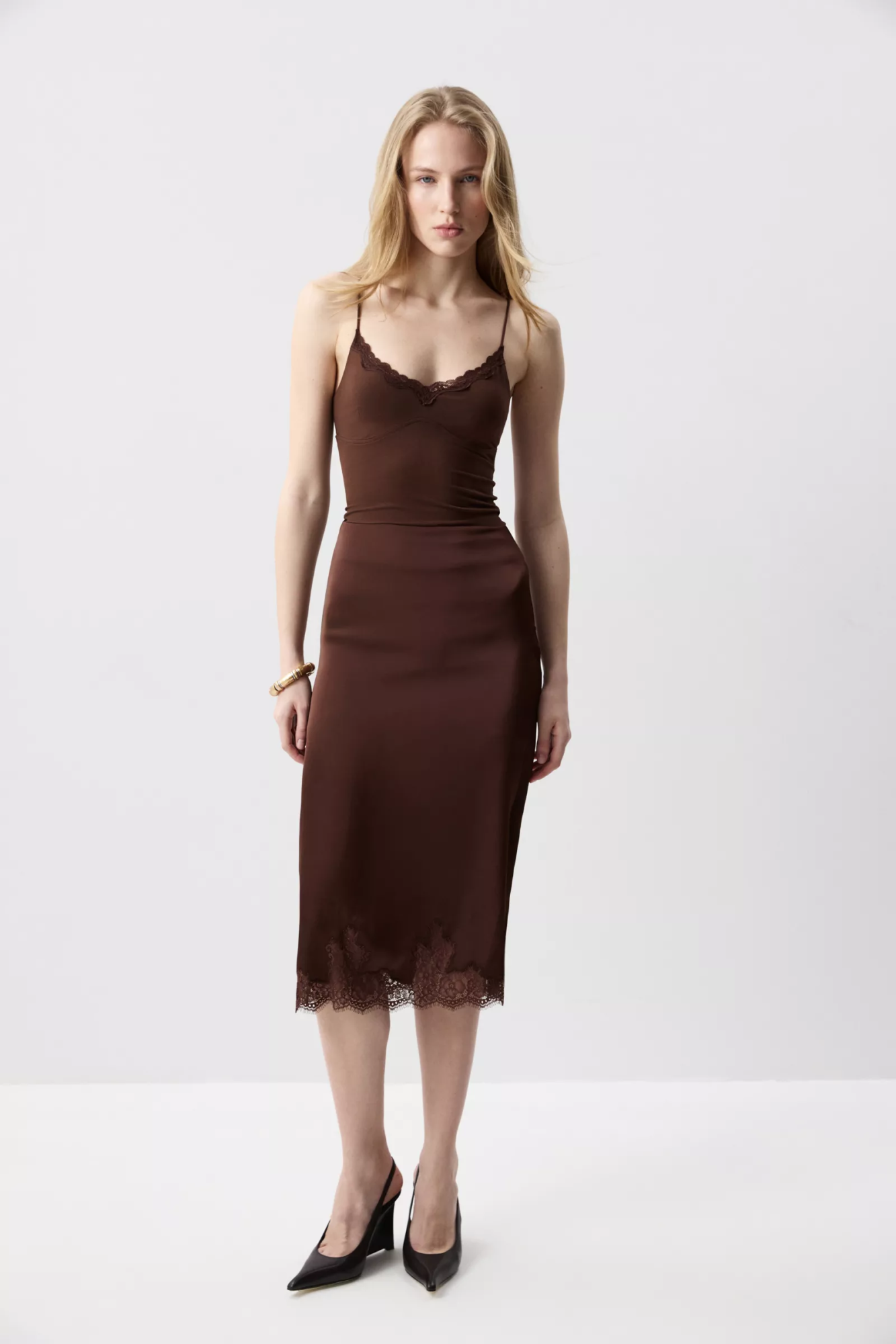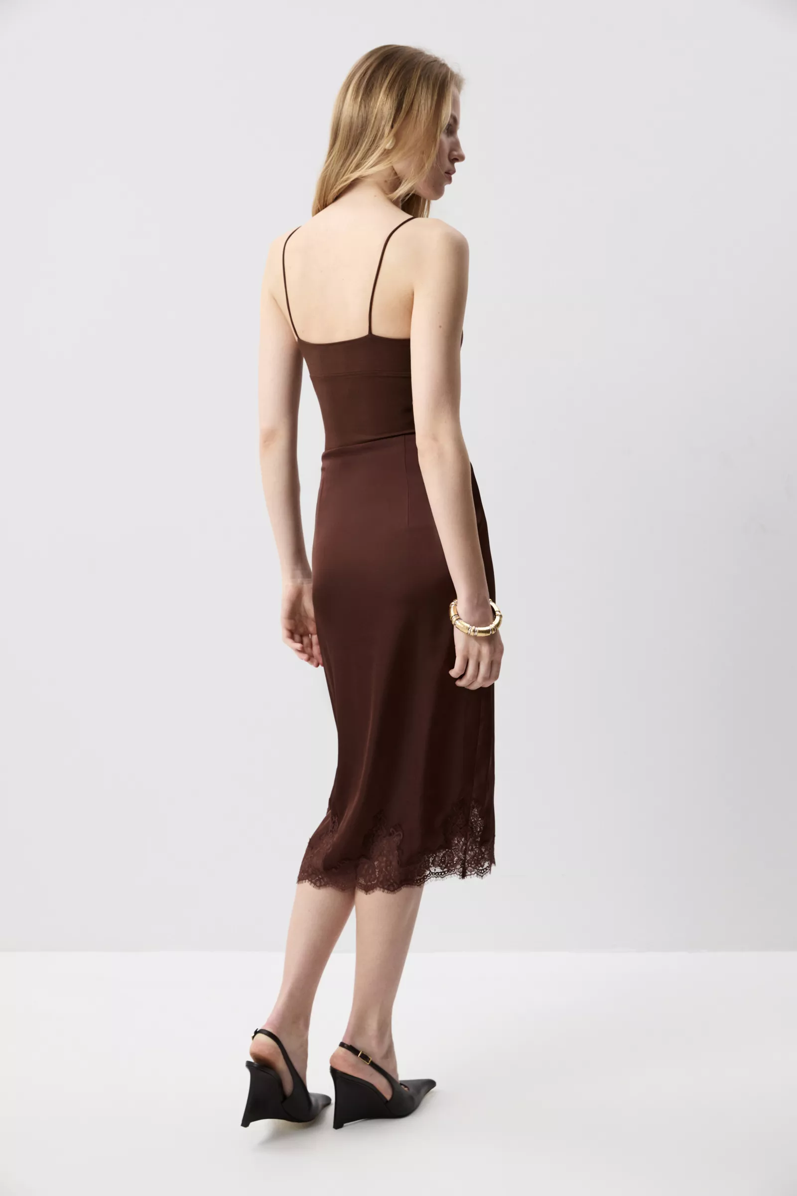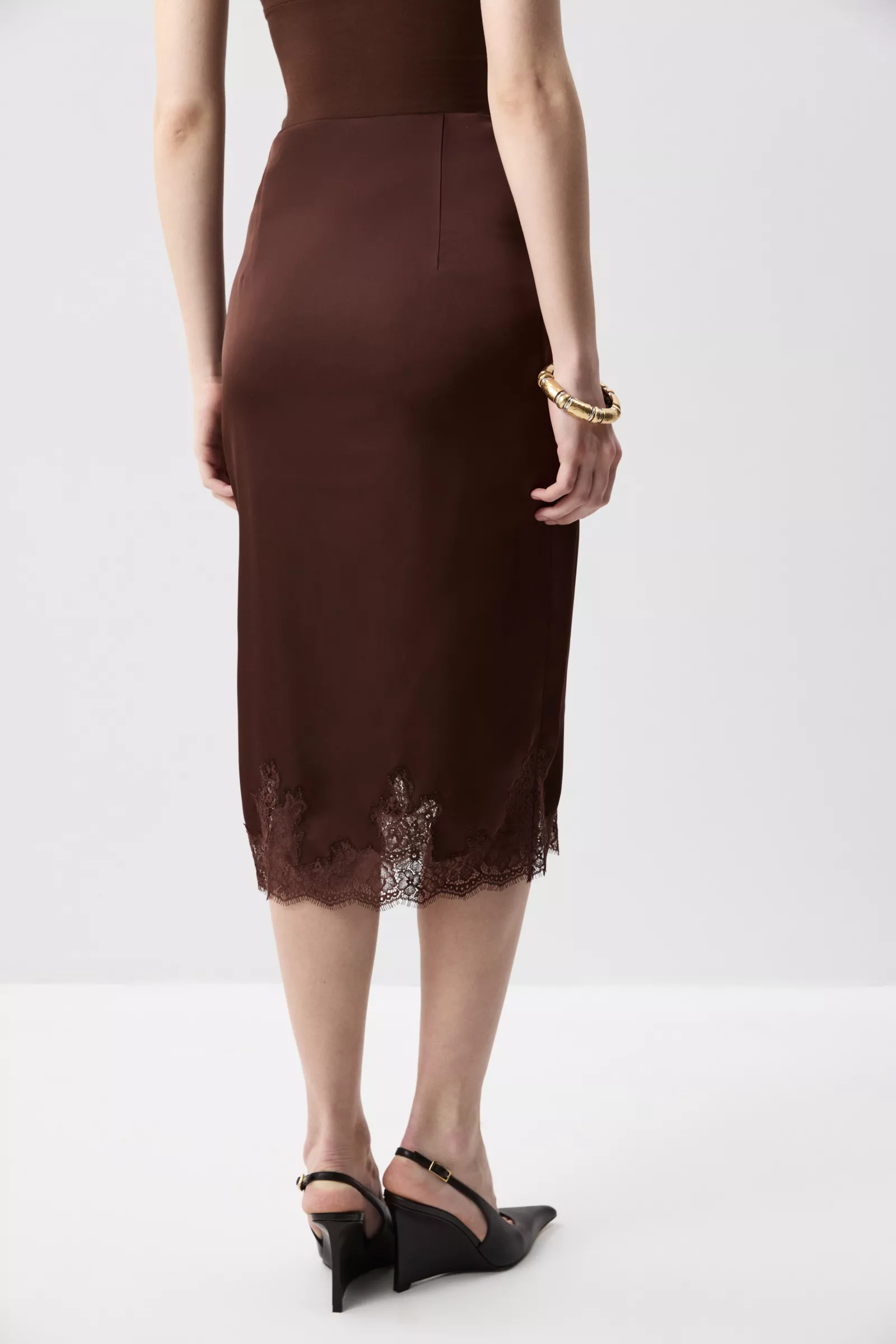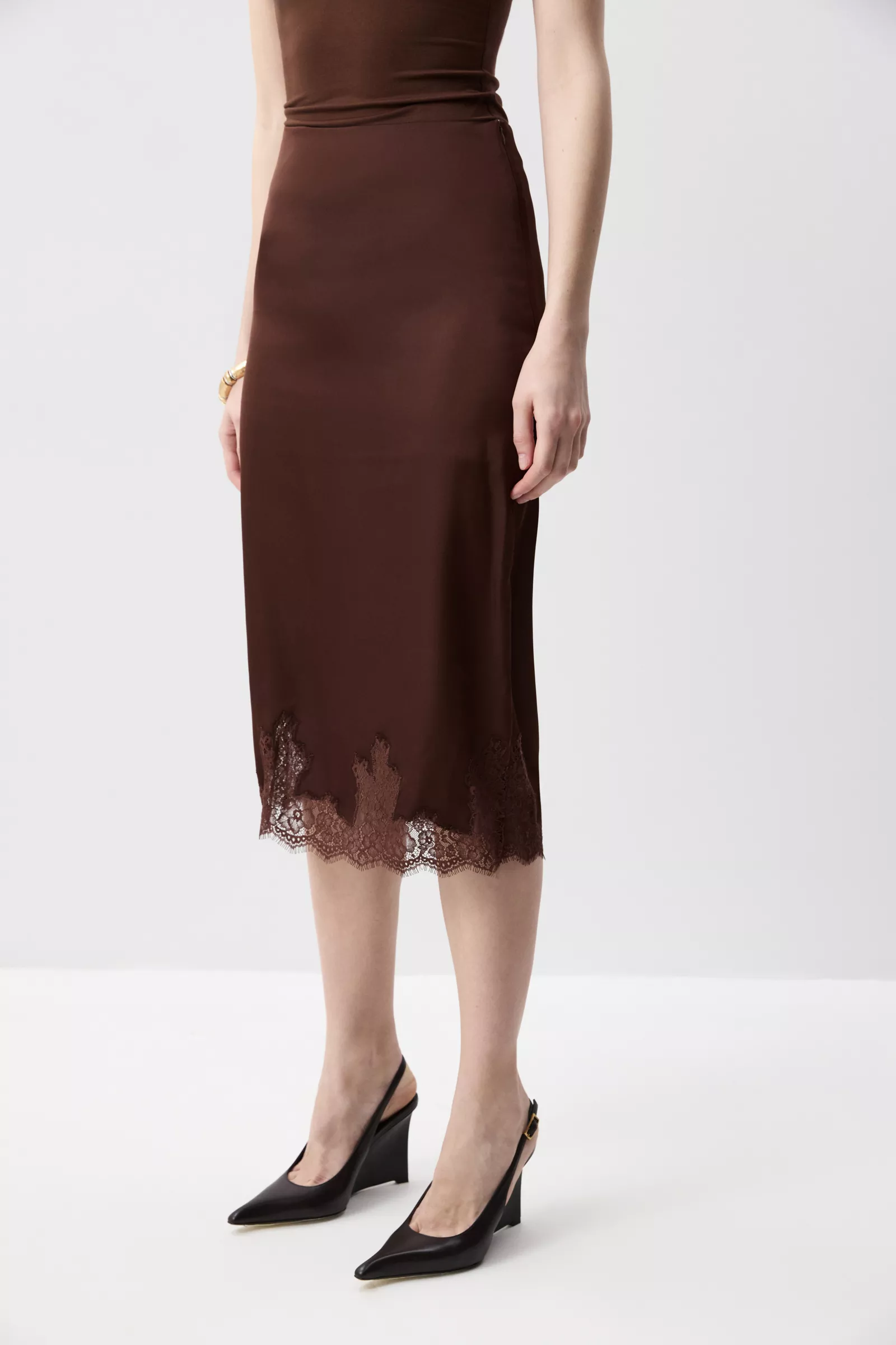 Юбка миди из плотного сатина с деликатным блеском, на подкладке. По низу изделия фигурно настрочено деликатное кружево. Застежка на потайную молнию в боковом шве.