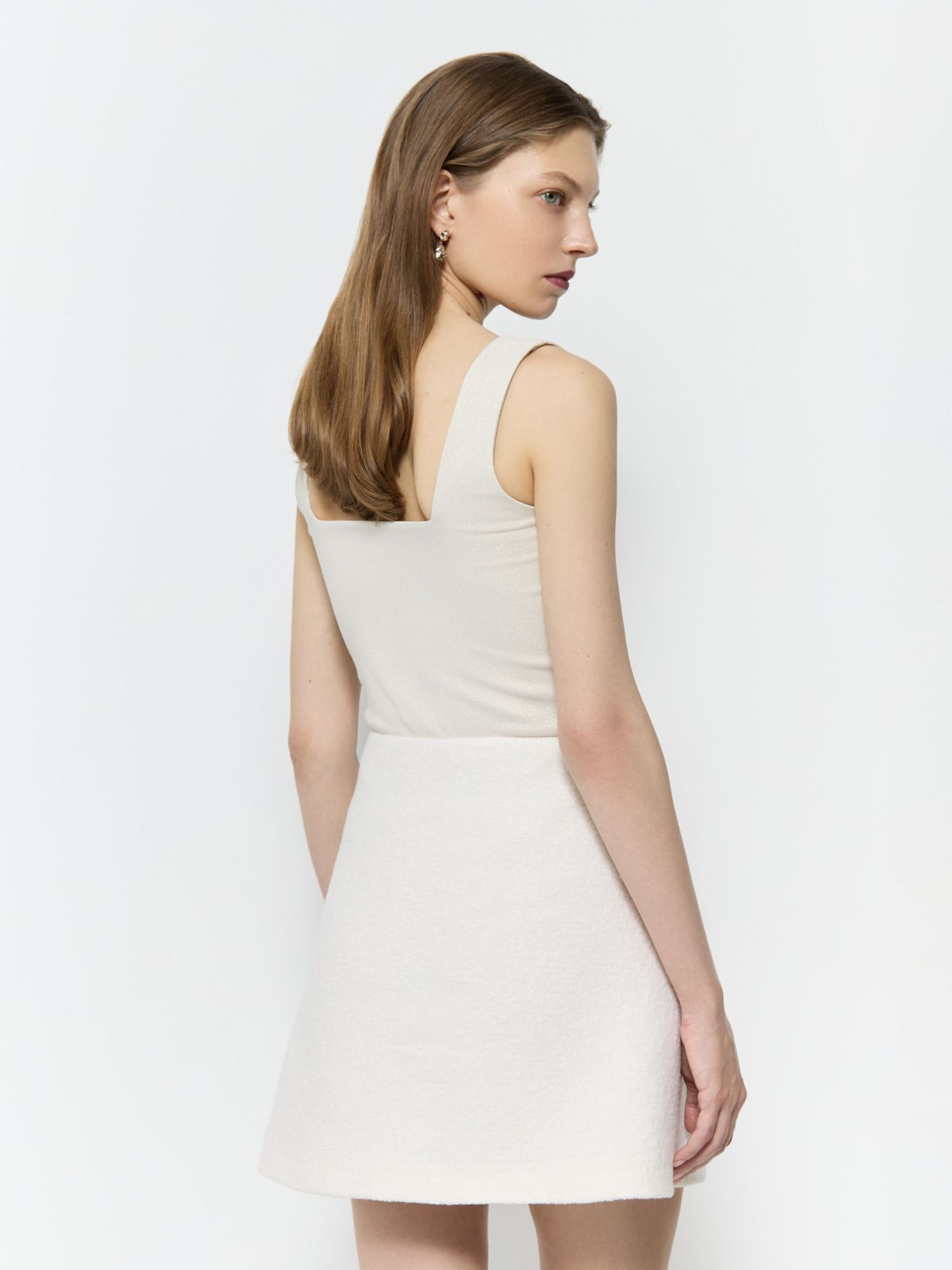 Юбка длиной мини, слегка расширяющаяся к низу, сшита из ткани-букле (вискоза с шерстью); подклад из вискозы. Средняя посадка, застежка на молнию и внутренний крючок.