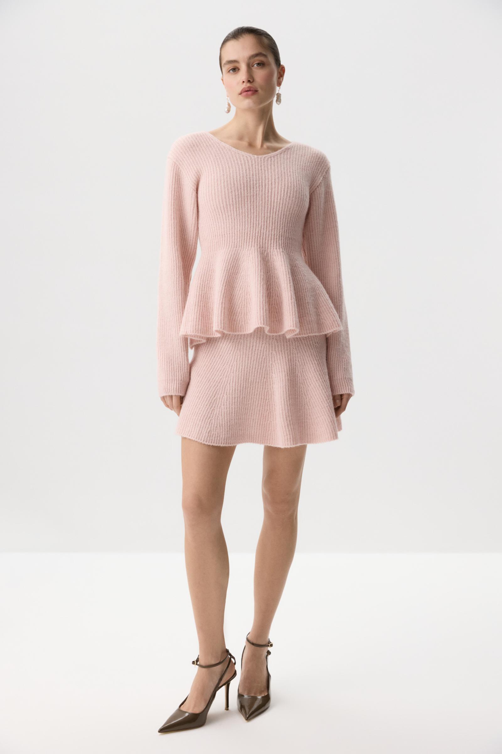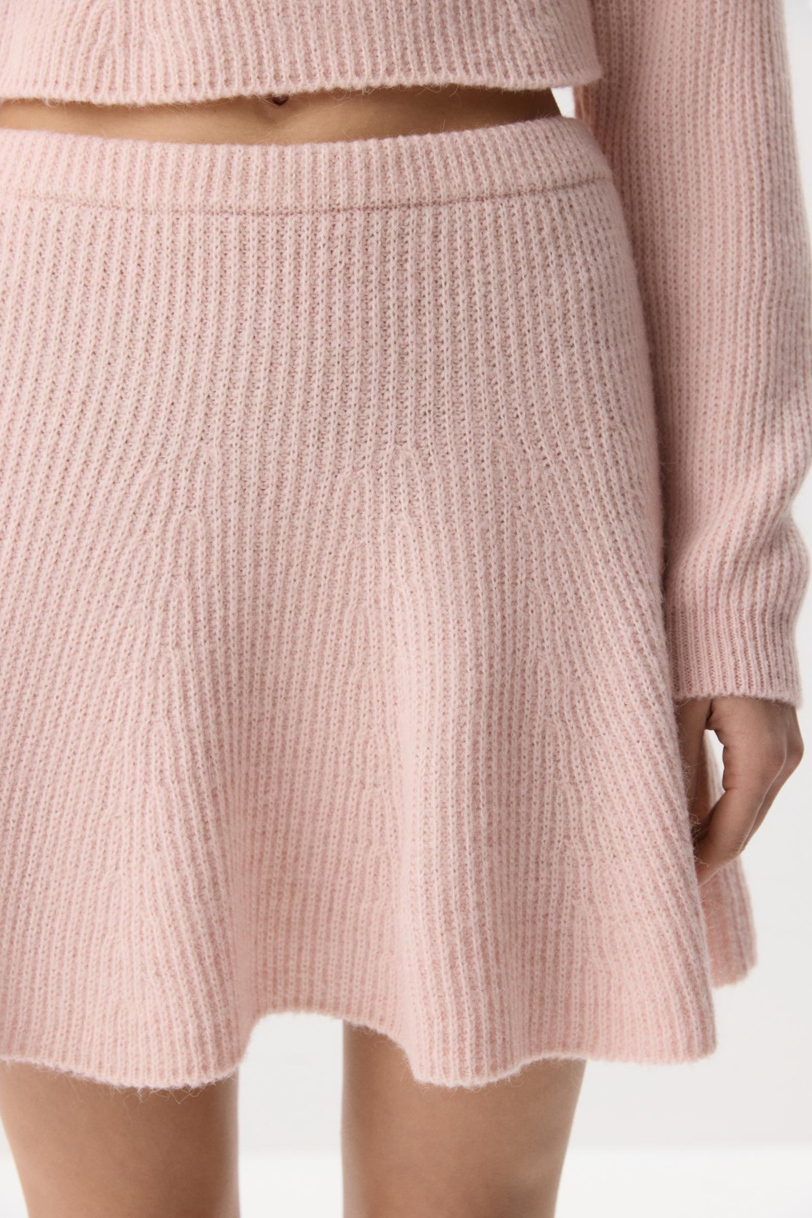 Короткая расклешенная к низу юбка на эластичном поясе — для мягких женственных образов. Выбранная пряжа, в составе которой есть альпака, образует красивые пластичные складки, но в то же время держит форму. У этого изделия низкая пиллингуемость.