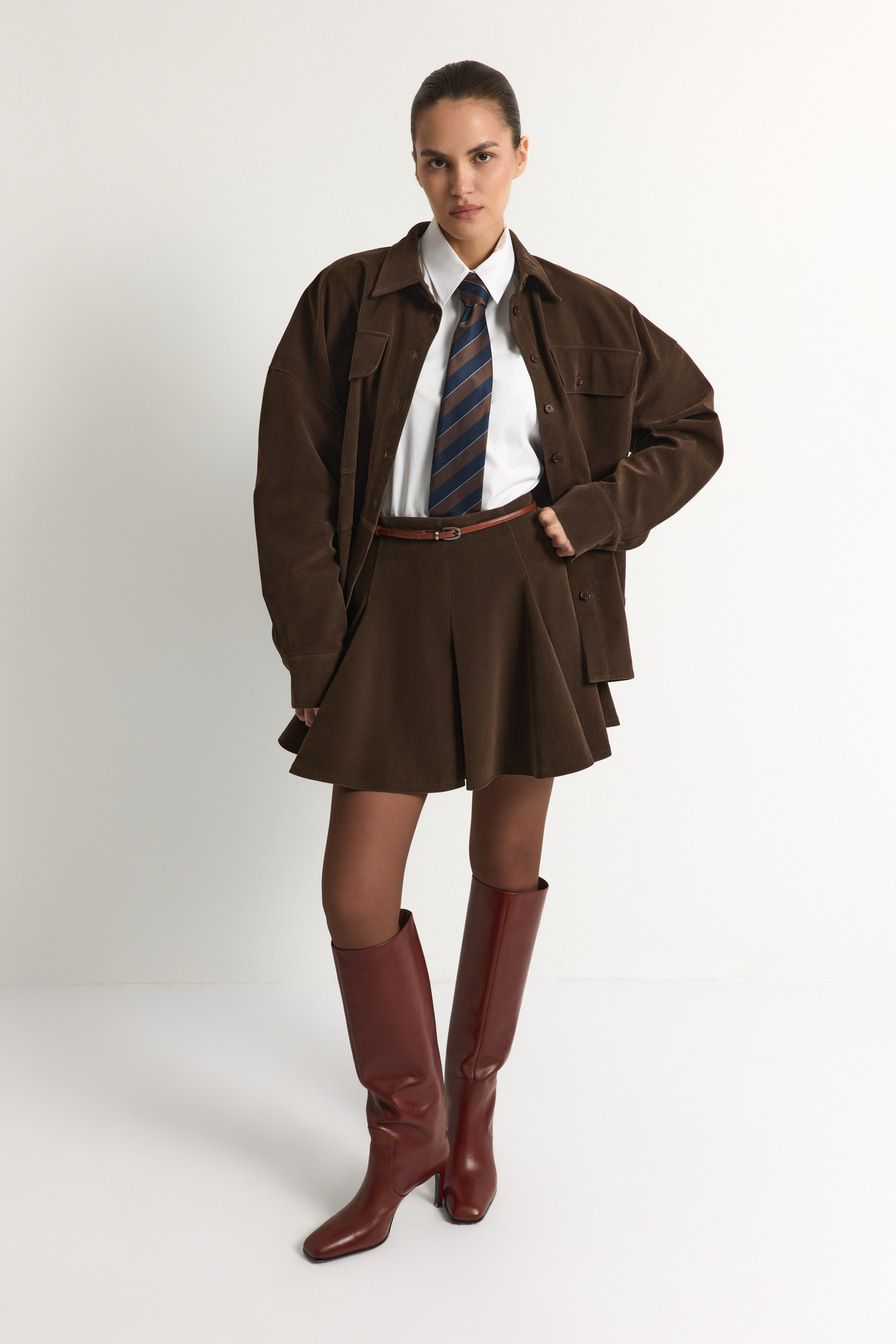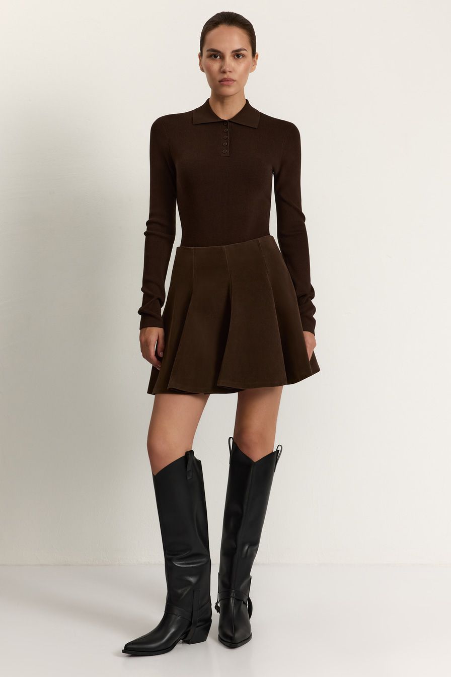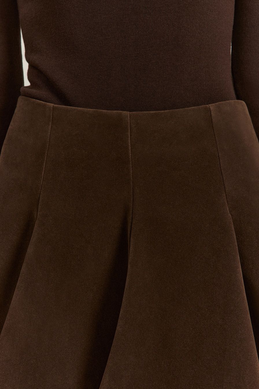 Юбка-мини из экозамши – модель темно-коричневого цвета. Юбка декорирована встречными складками и дополнена застежкой-молнией.