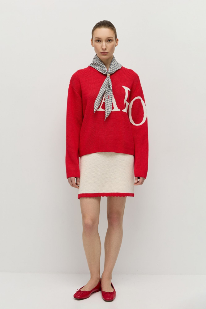 У нее слегка трапецевидная форма, пояс со внутренней резинкой для мягкой комфортной посадки. По низу юбки вывязаны фестоны.