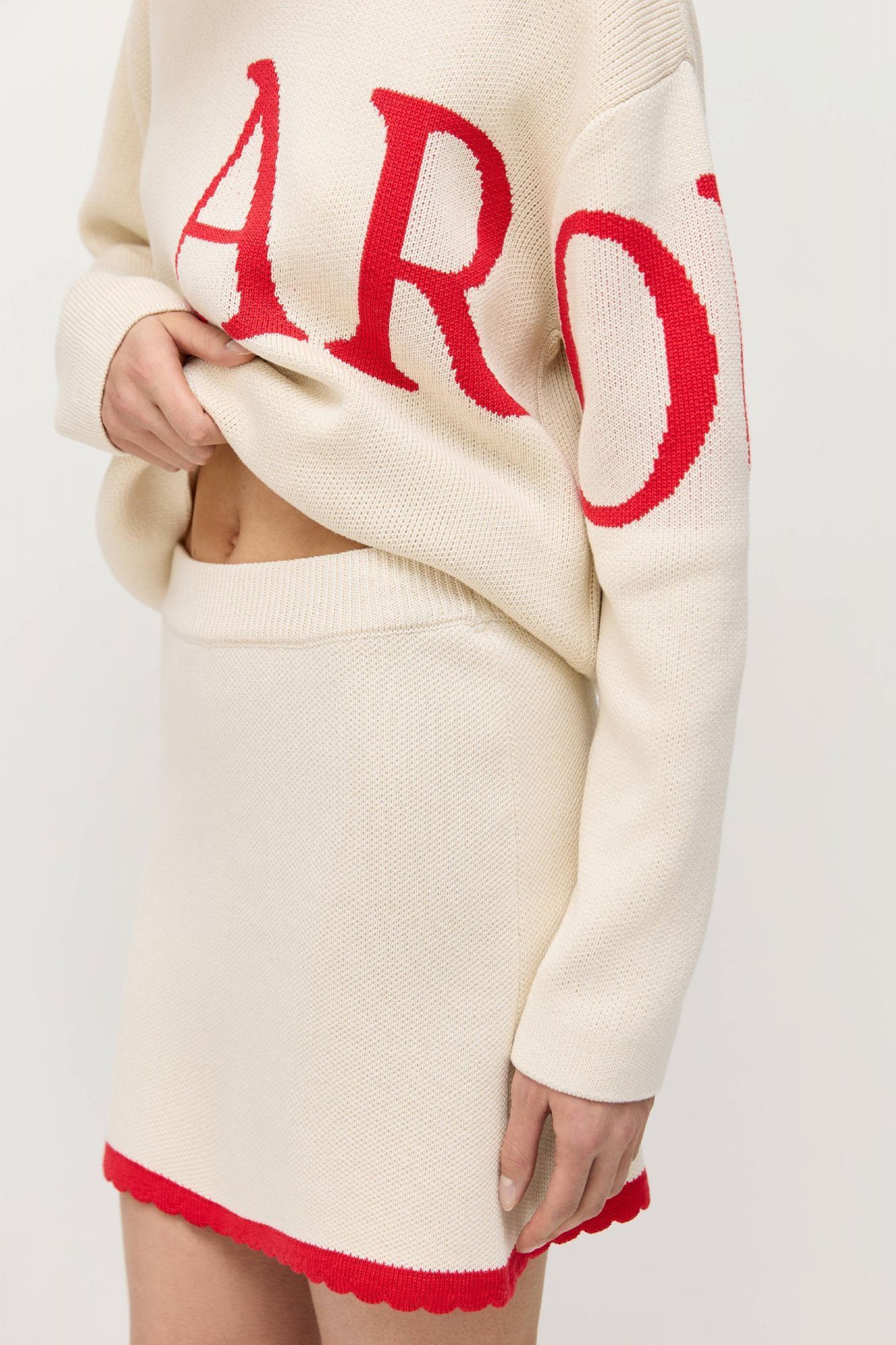 Юбка-мини связана из натурального хлопка с легкой примесью акрила для стабильности и долговечности.