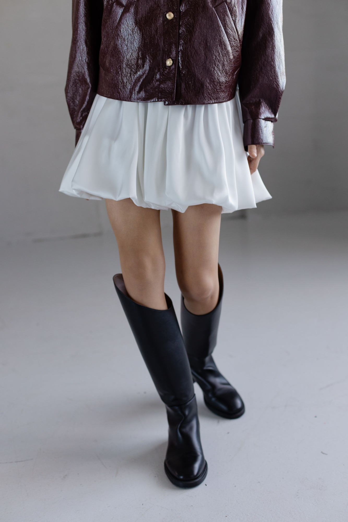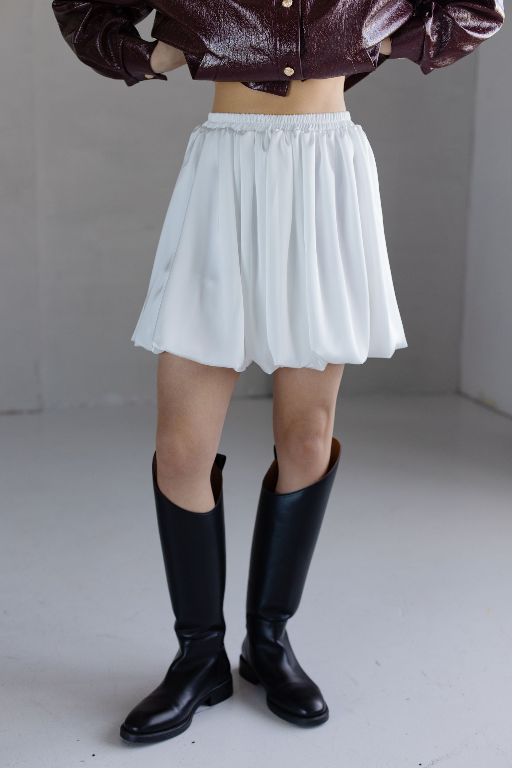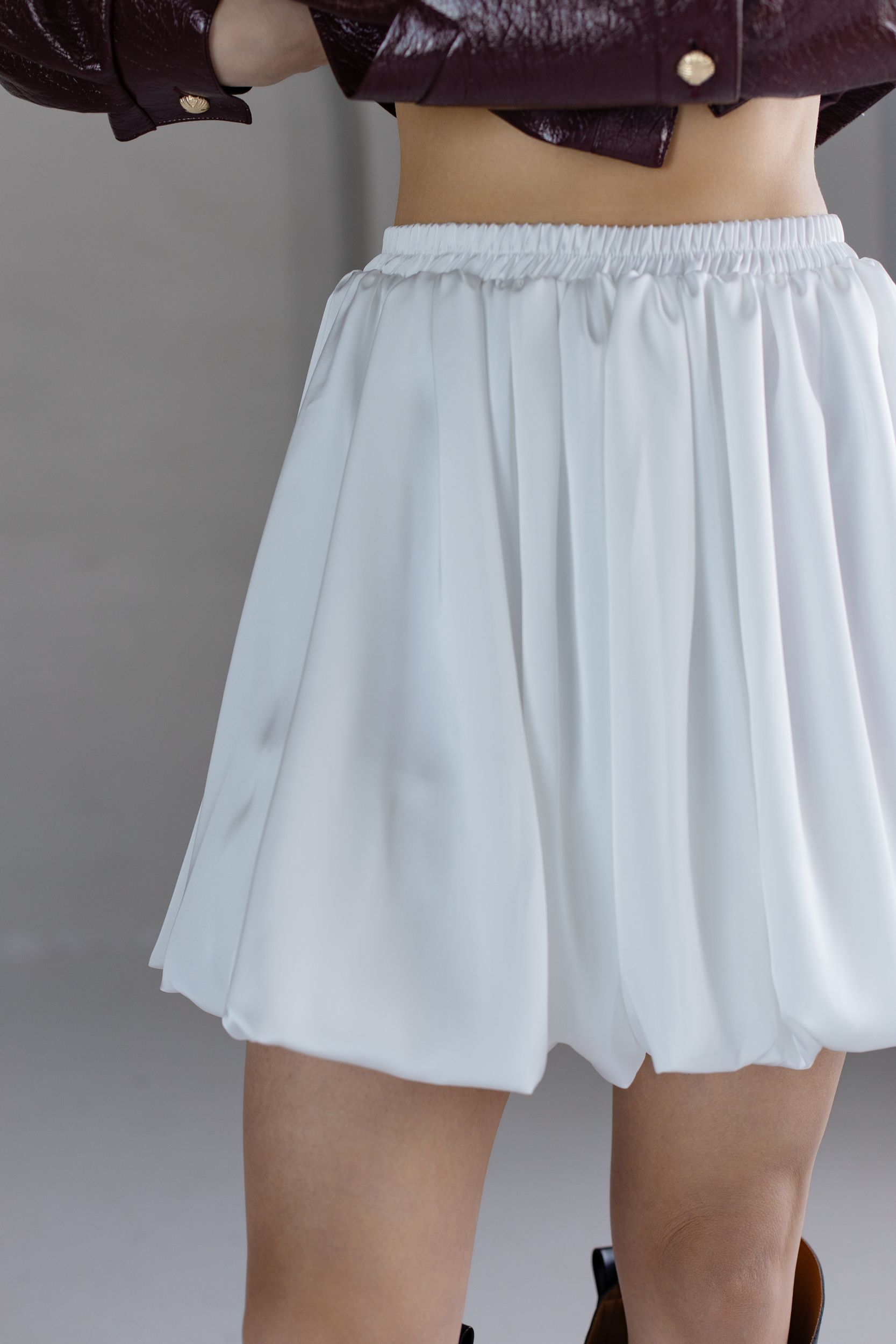 Объемная юбка из струящейся ткани в молочном цвете.