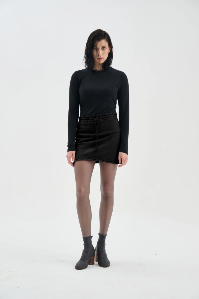 Мини юбка из плотного черного футера Зимняя классика от UNKE: утепленная ткань, посадка на талии, открытые срезы сверху и снизу для создания непринужденного образа. Пояс-резинка и дополнительный шнур для регулировки объема. Изнаночная сторона подола усилена хлопковой лентой.