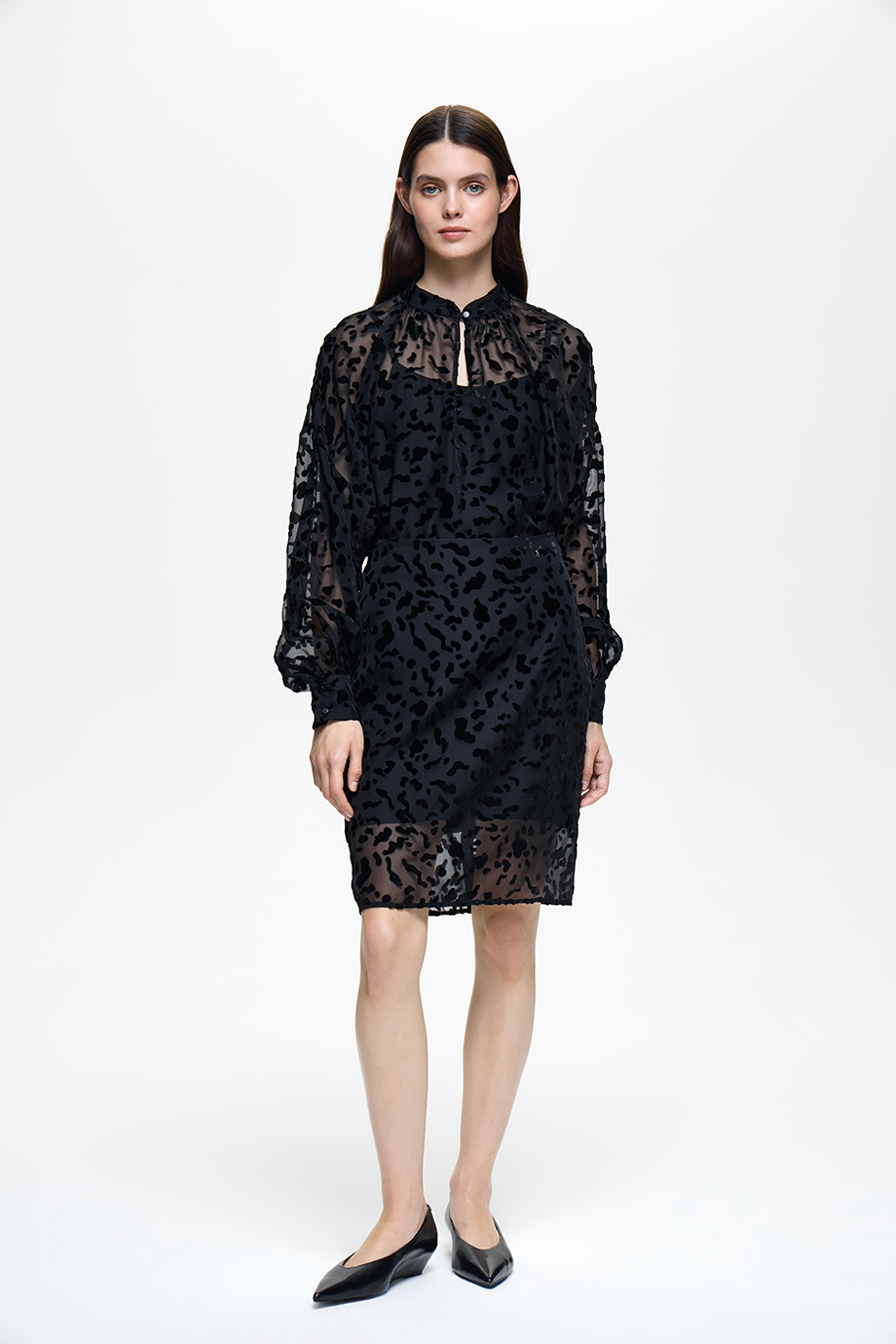 Чёрная юбка из деворе — стильный и элегантный элемент гардероба. Она отличается особой текстурой и придаст вашему образу изысканность. Идеально подходит для создания разнообразных ансамблей, от повседневных до более формальных.