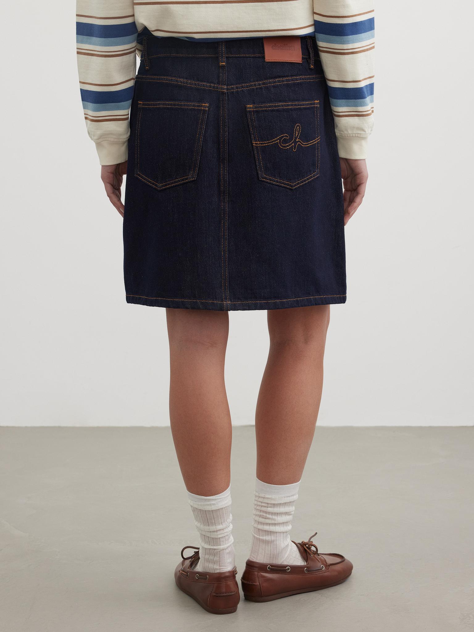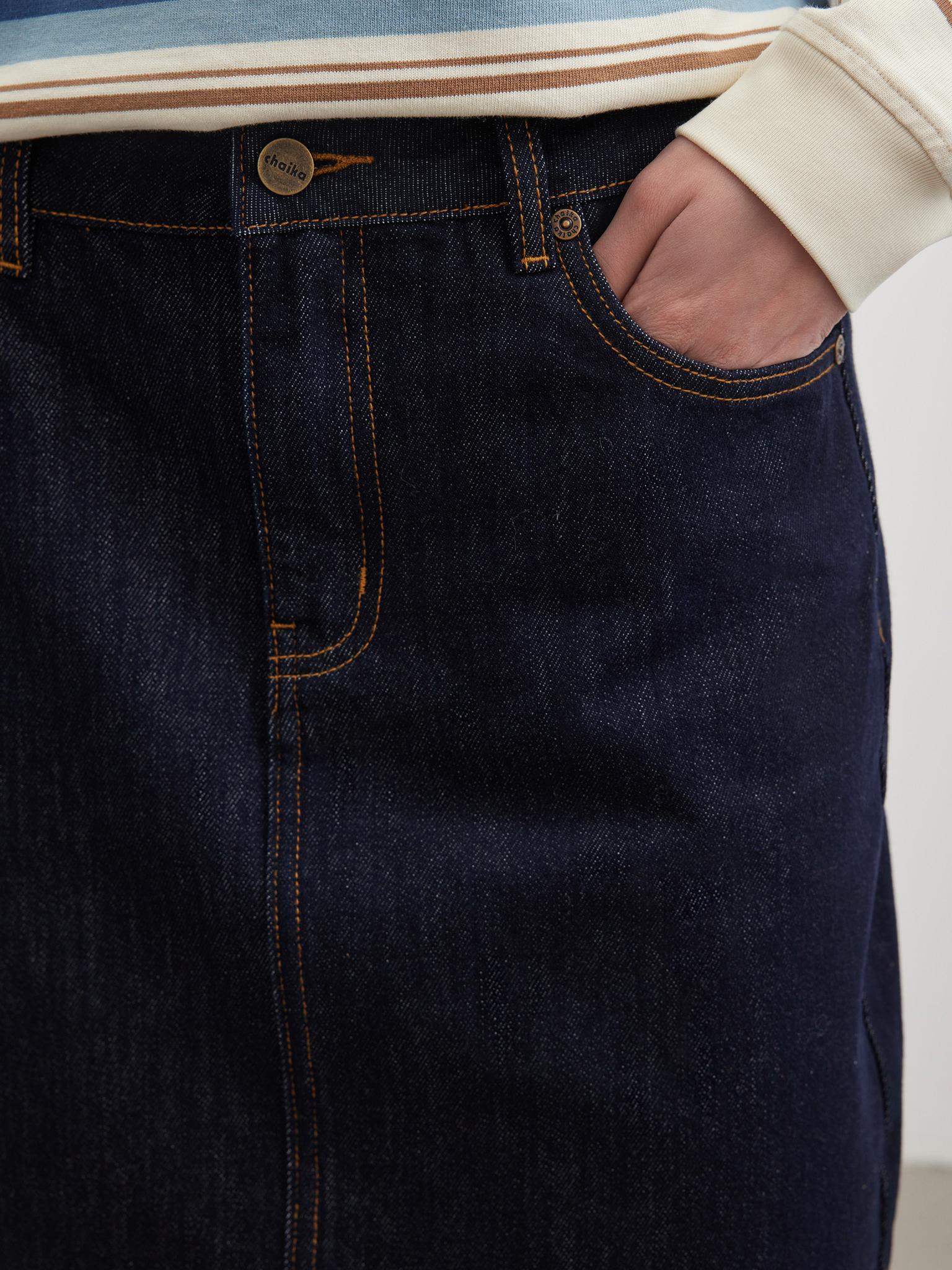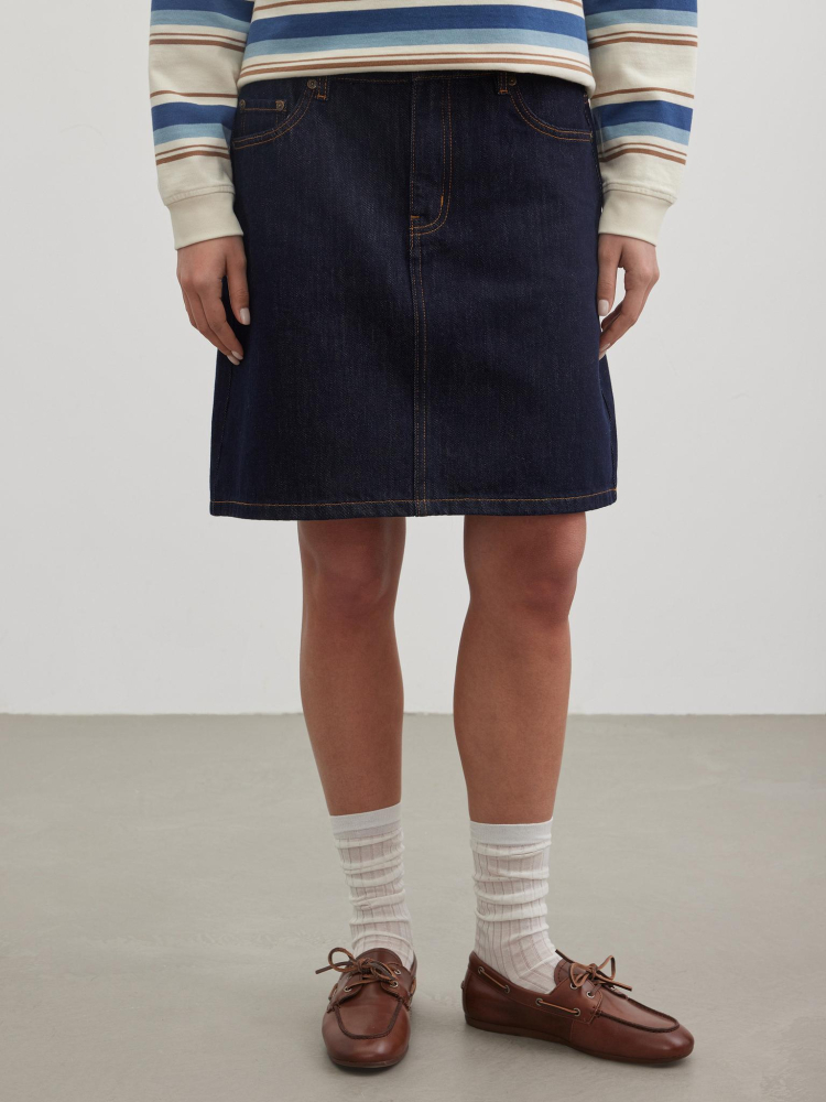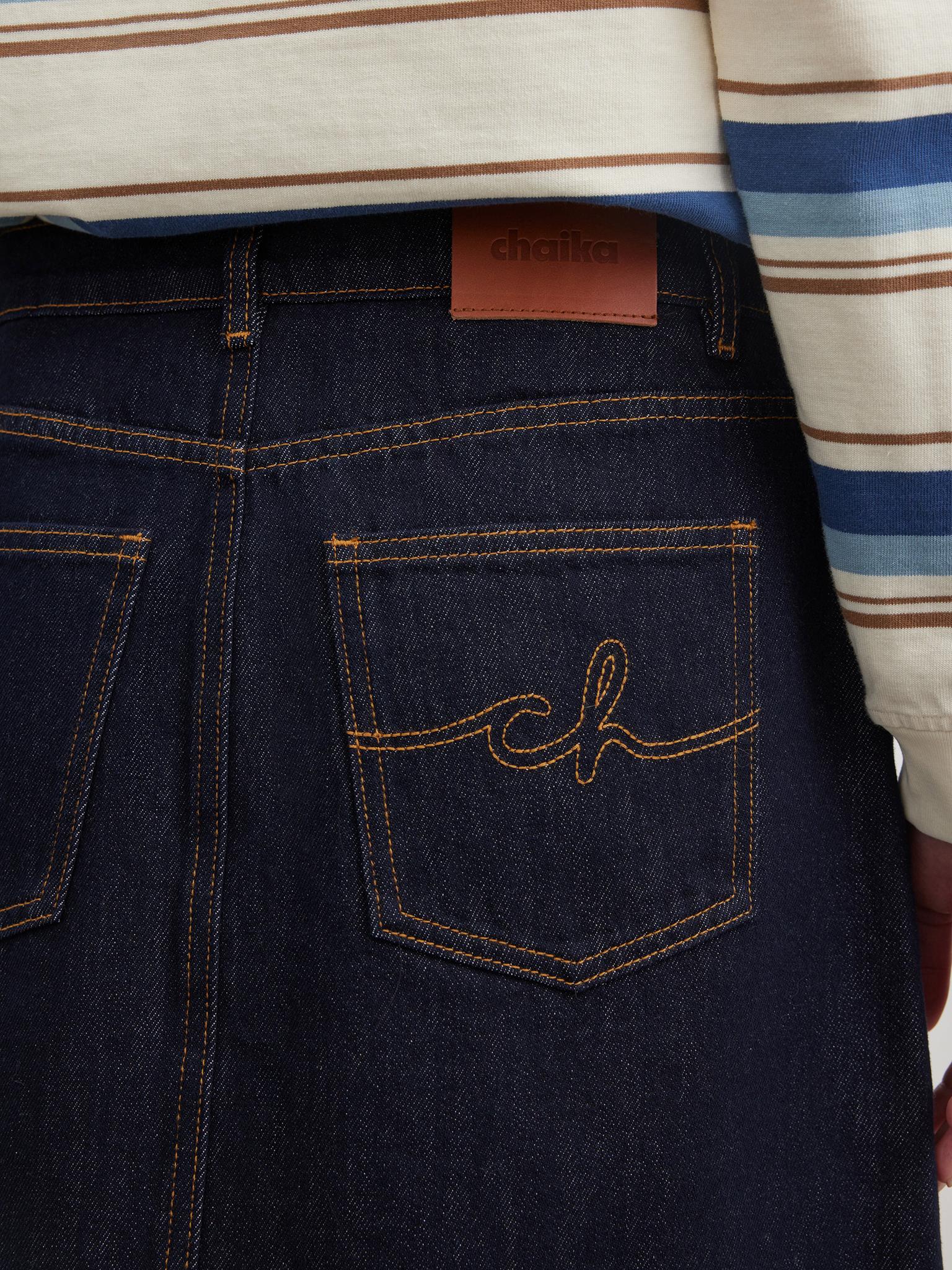 Юбка прямого силуэта, вдохновленная классикой азиатского синего денима, который ценят во всем мире за качество и уникальную текстуру.