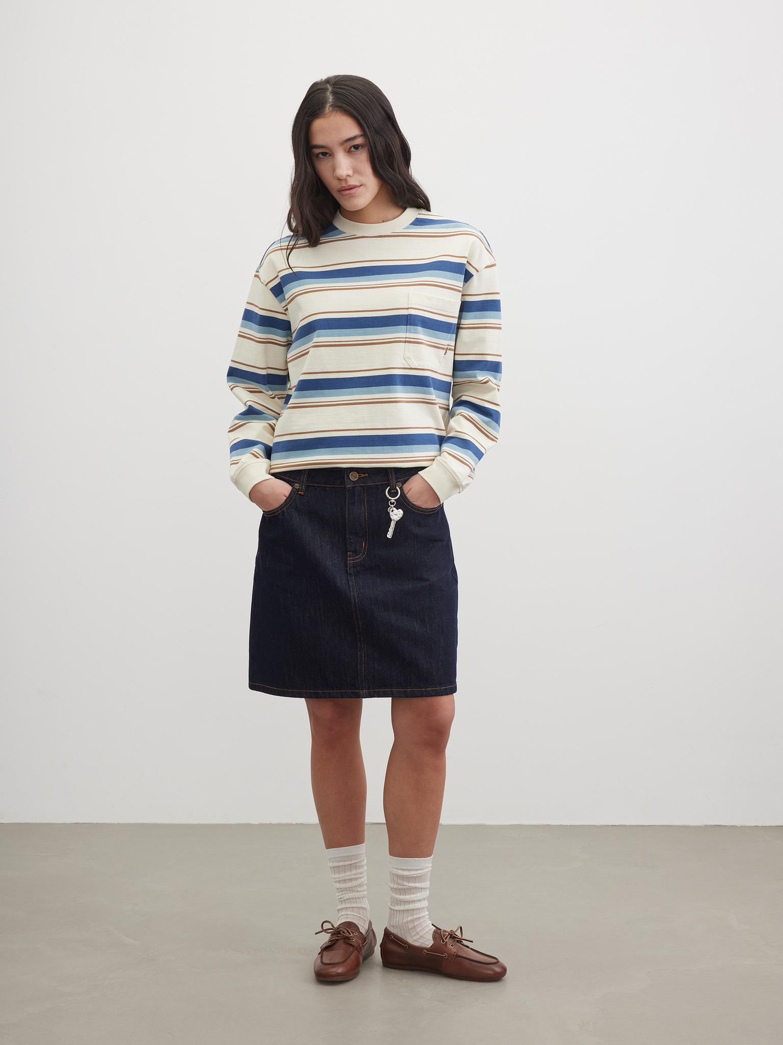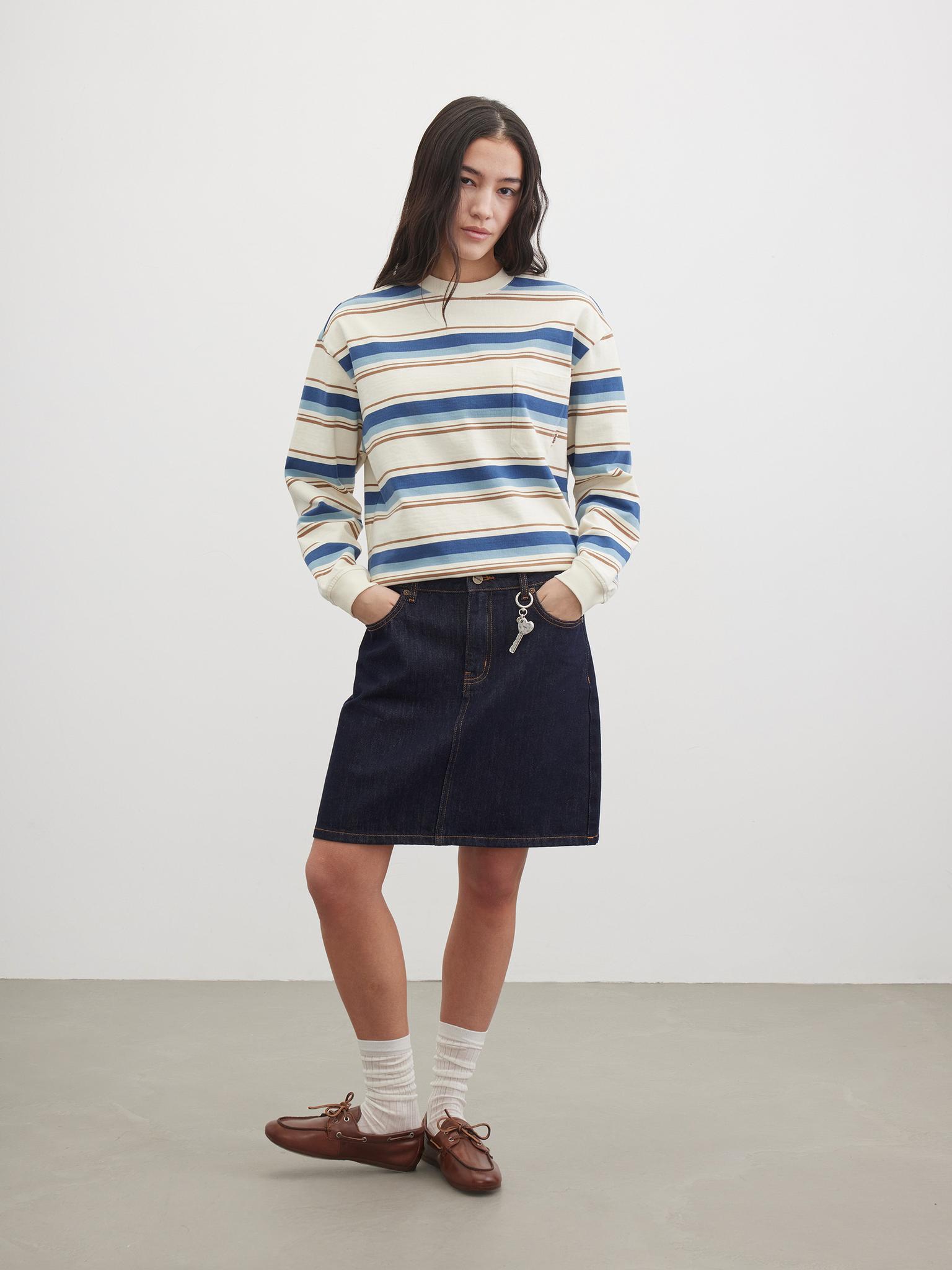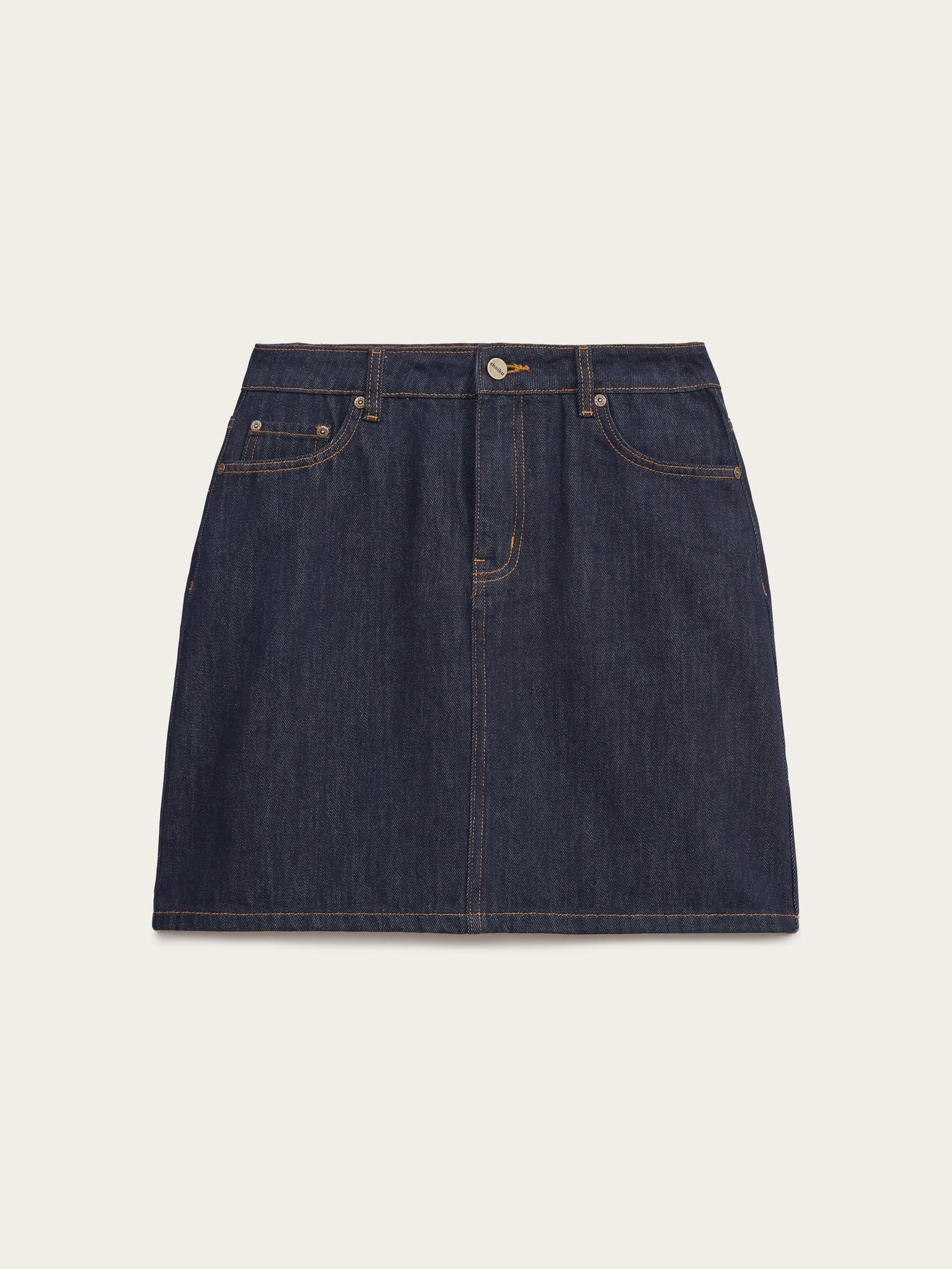 Юбка прямого силуэта, вдохновленная классикой азиатского синего денима, который ценят во всем мире за качество и уникальную текстуру.