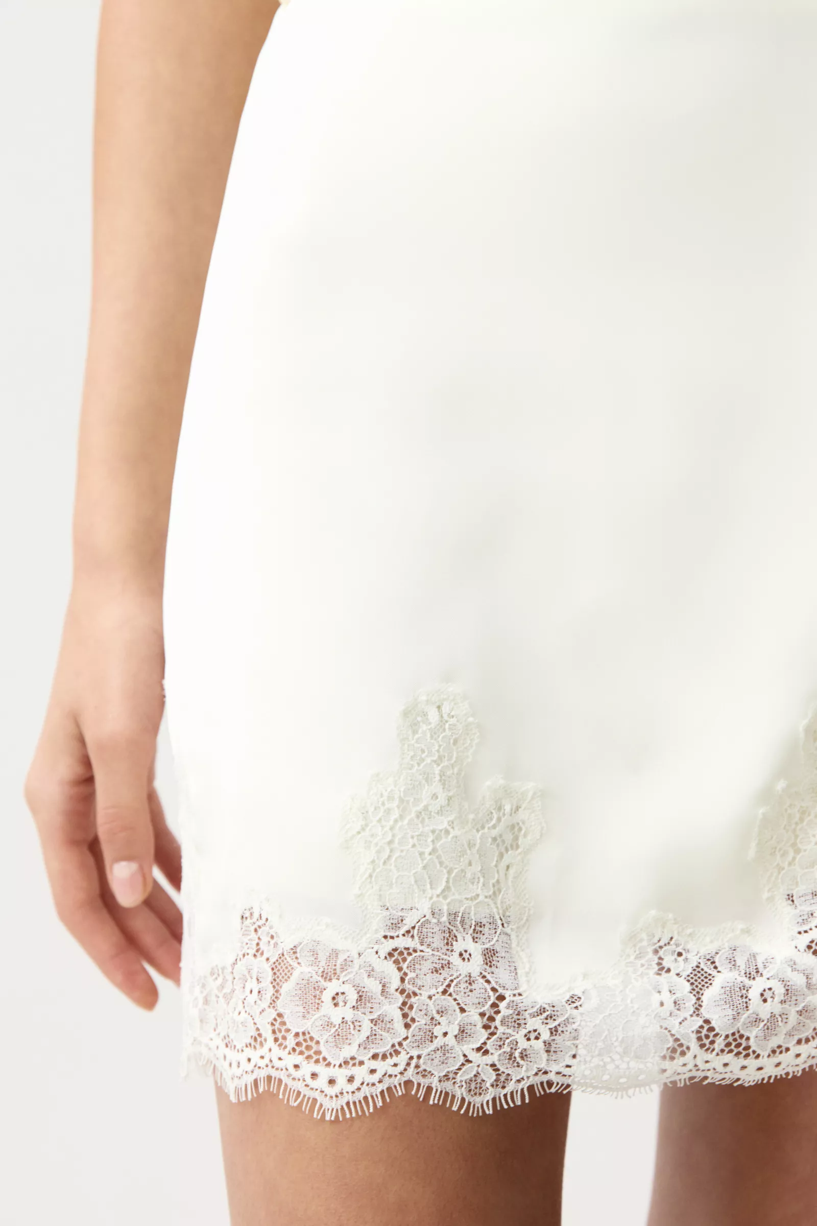 Юбка мини из плотного сатина с деликатным блеском, на подкладке. По низу изделия фигурно настрочено деликатное кружево. Застежка на потайную тесьму молнию в боковом шве.