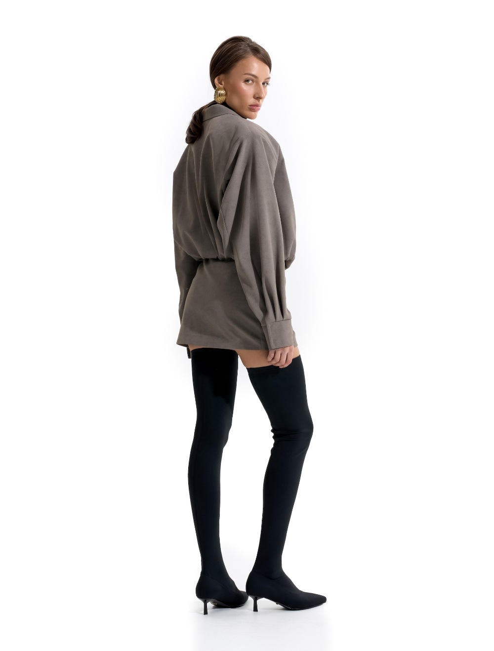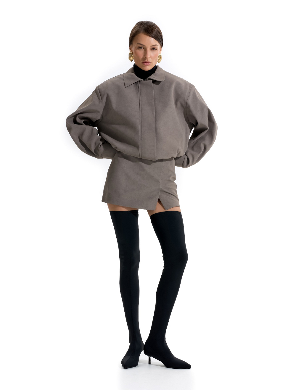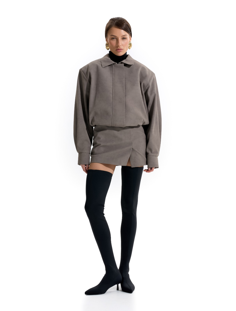 Юбка из мягкой и плотной искусственной замши в базовом оттенке. Длина модели — «мини», спереди расположен небольшой элегантный разрез для свободы движения. Эта юбка создаёт эффектный образ, сочетая тактильную привлекательность материала с лаконичным дизайном.