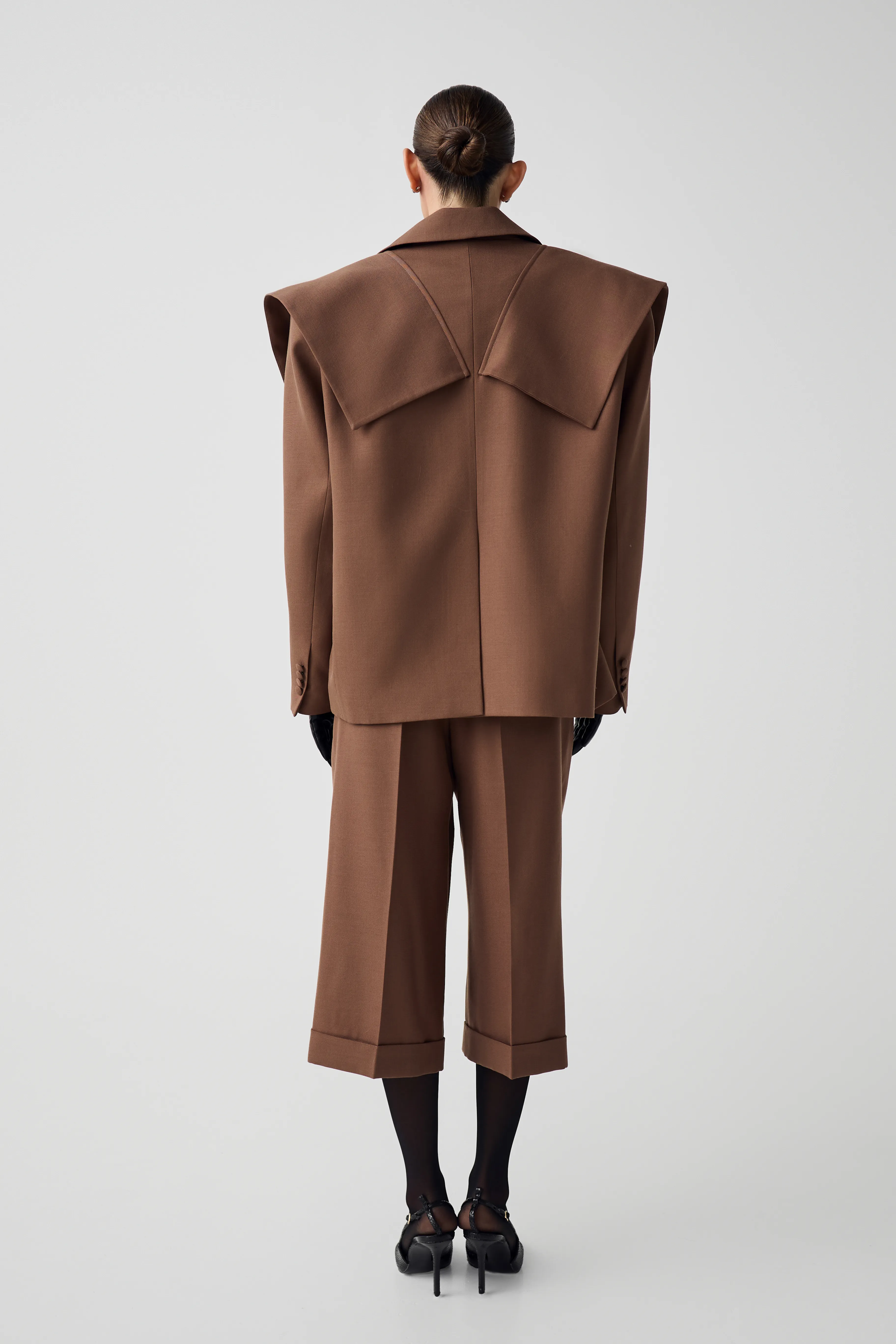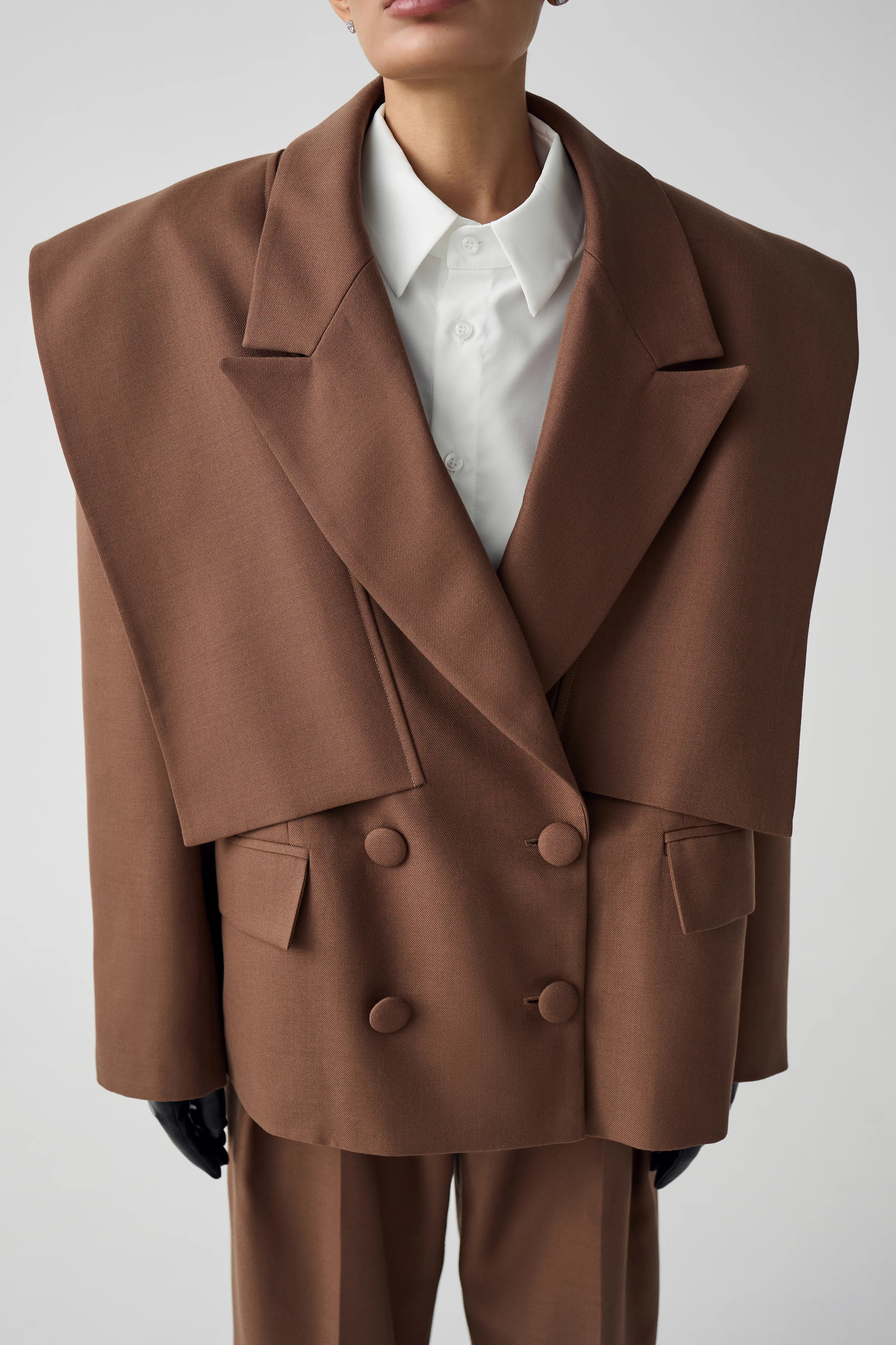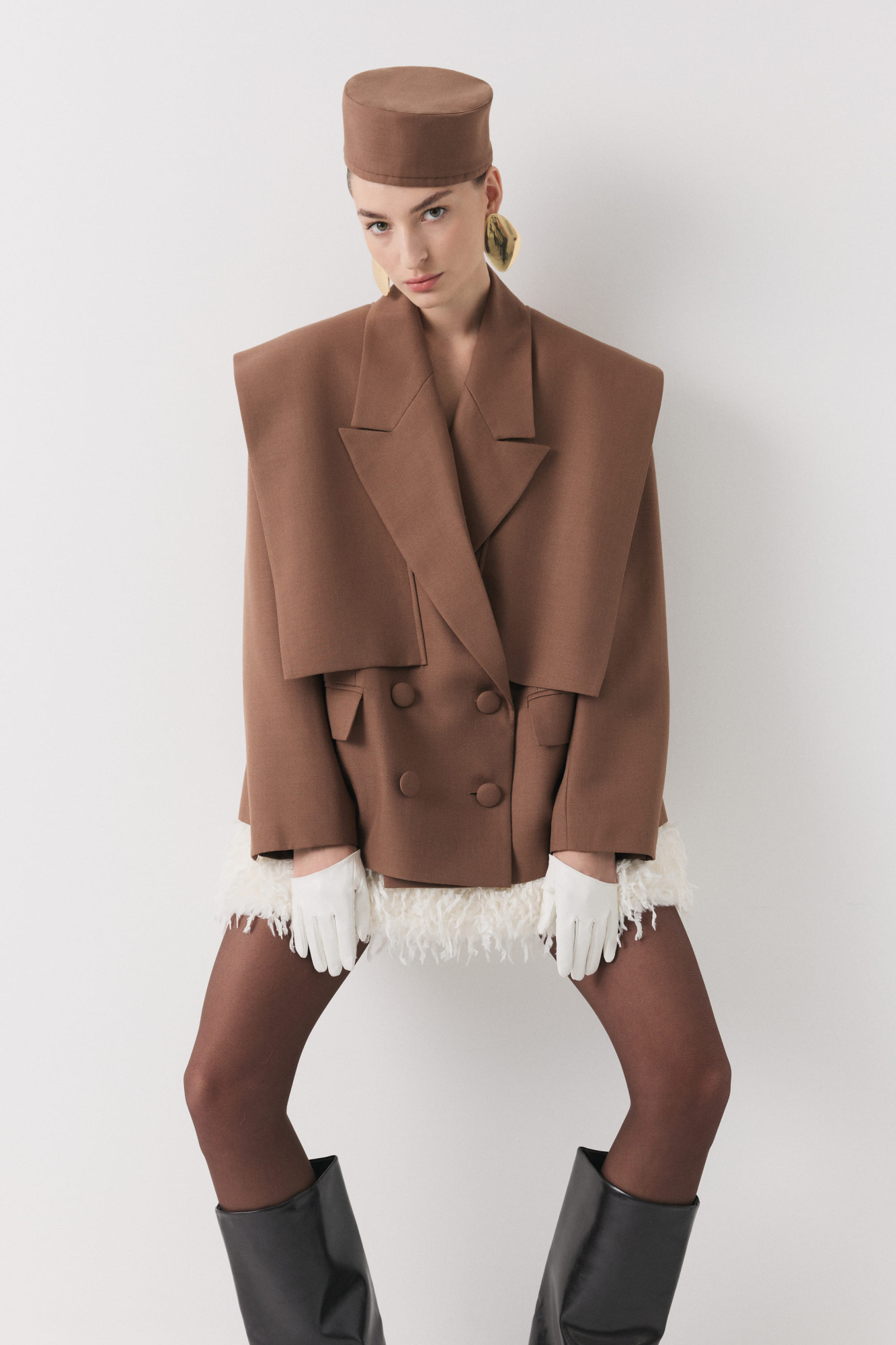 Жакет из шерсти свободного кроя. Массивные плечи придают акцент образу.