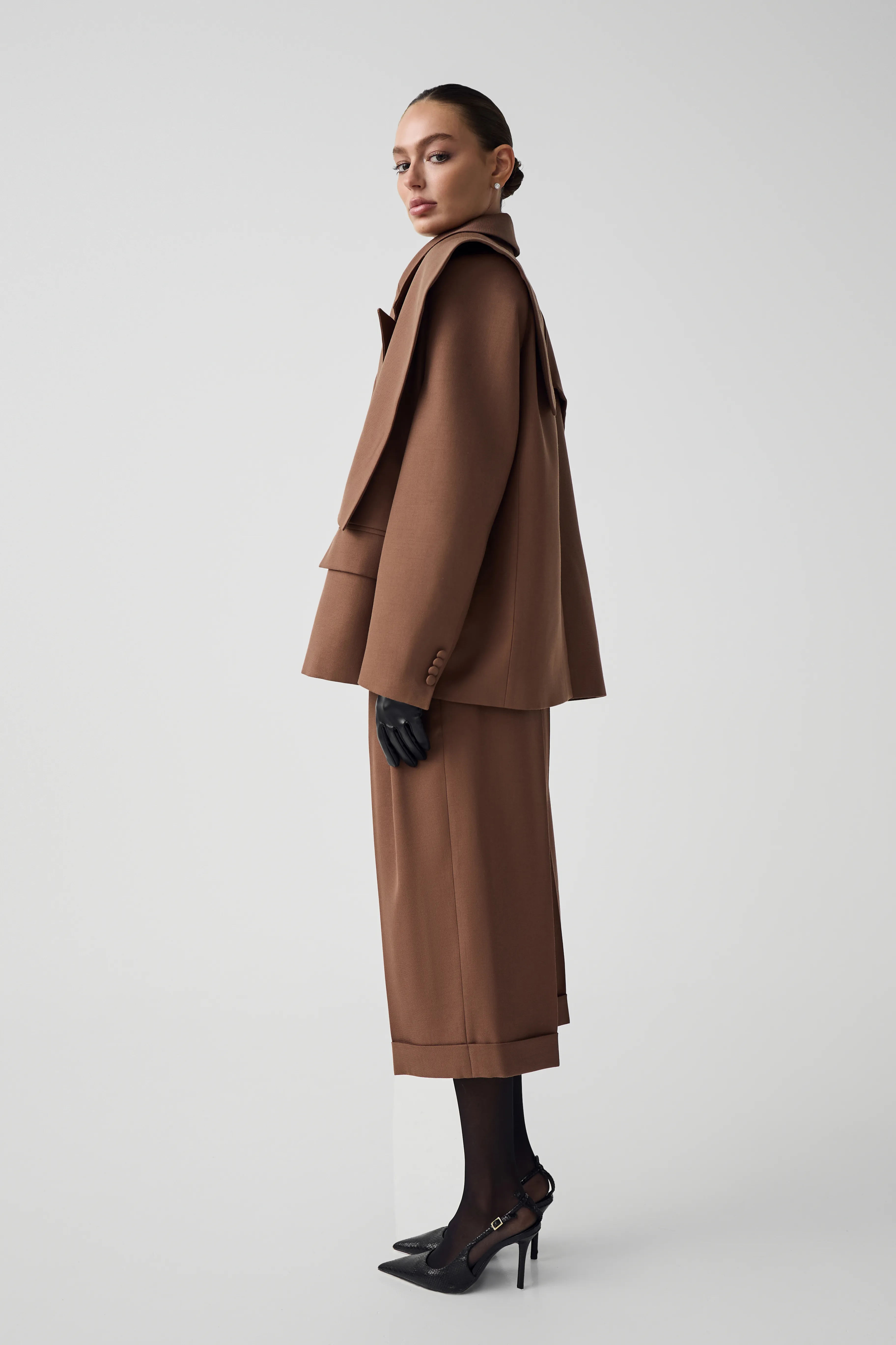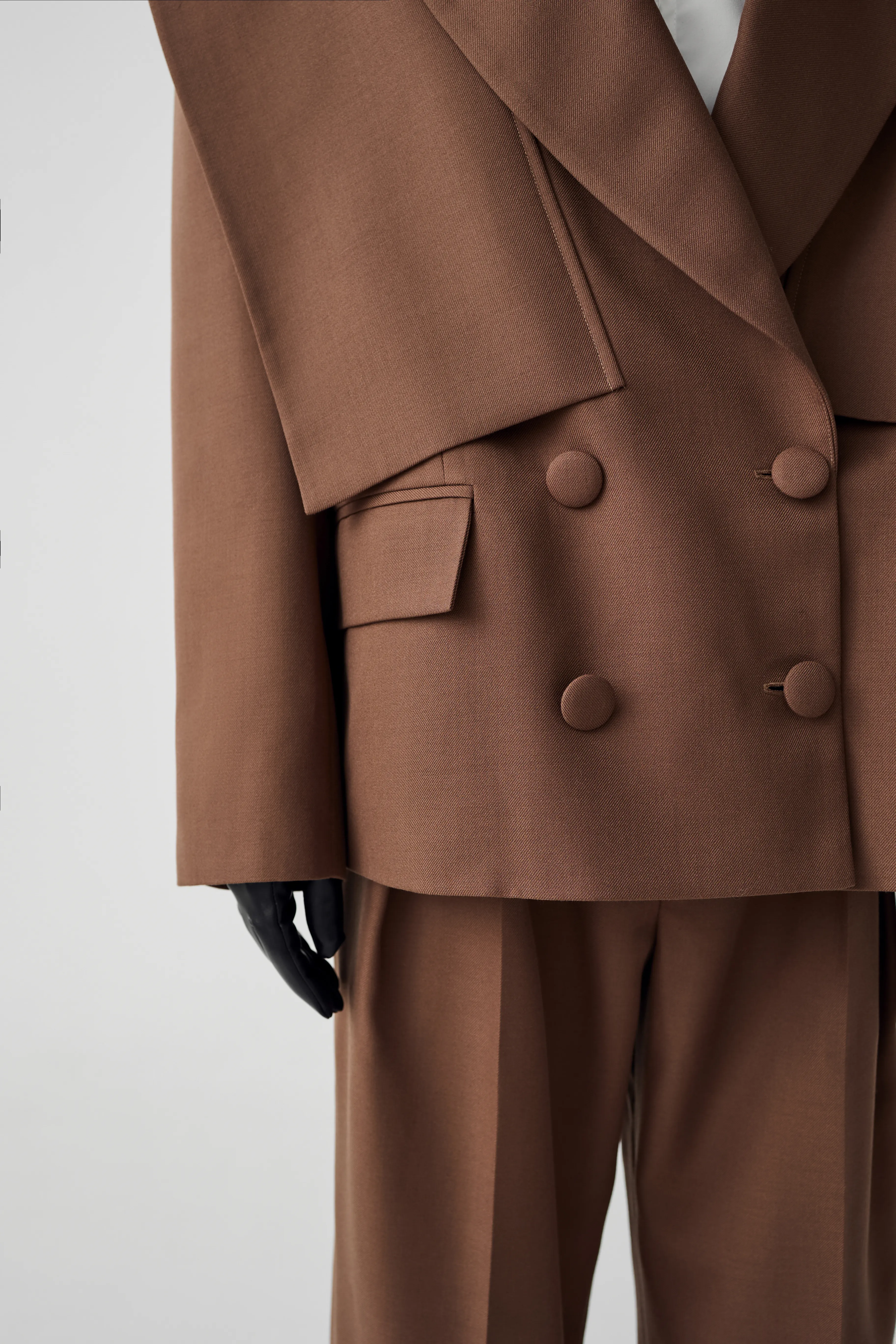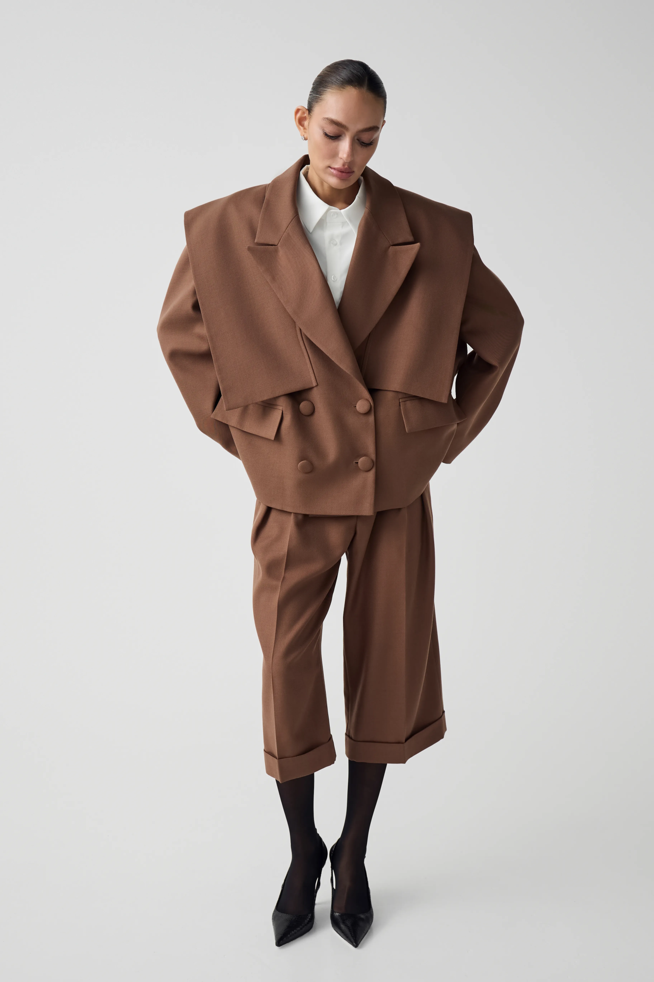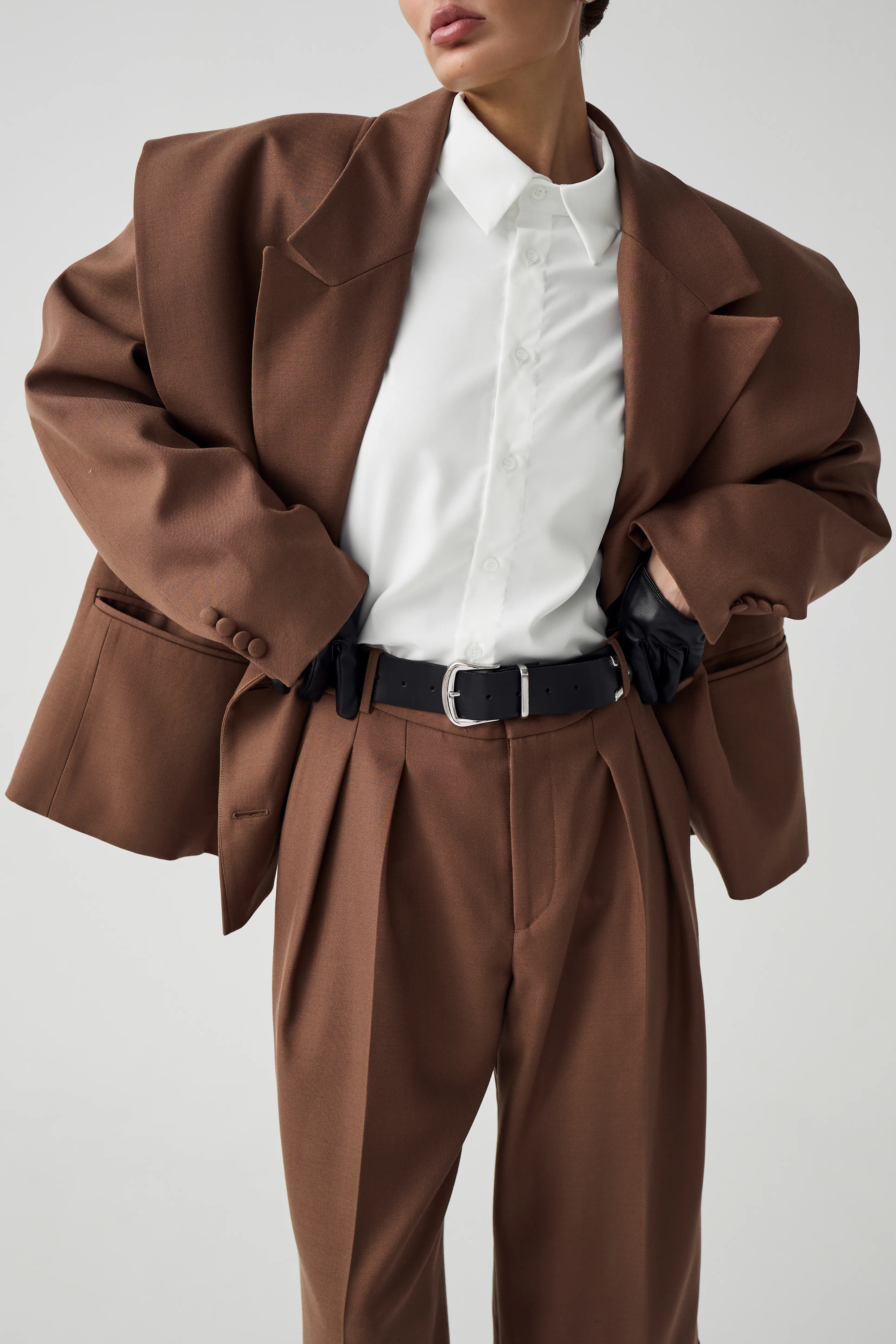 Жакет из шерсти свободного кроя. Массивные плечи придают акцент образу.