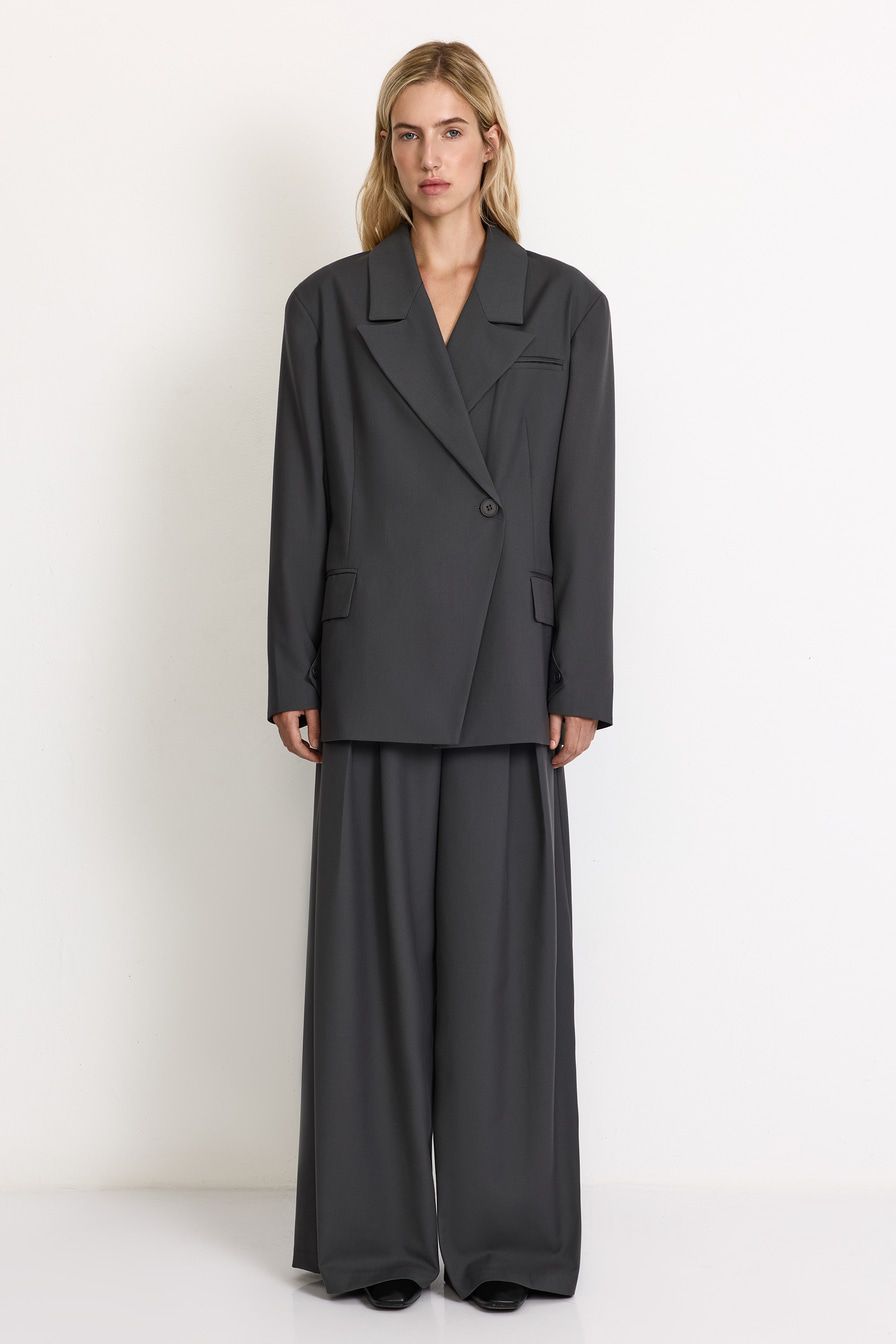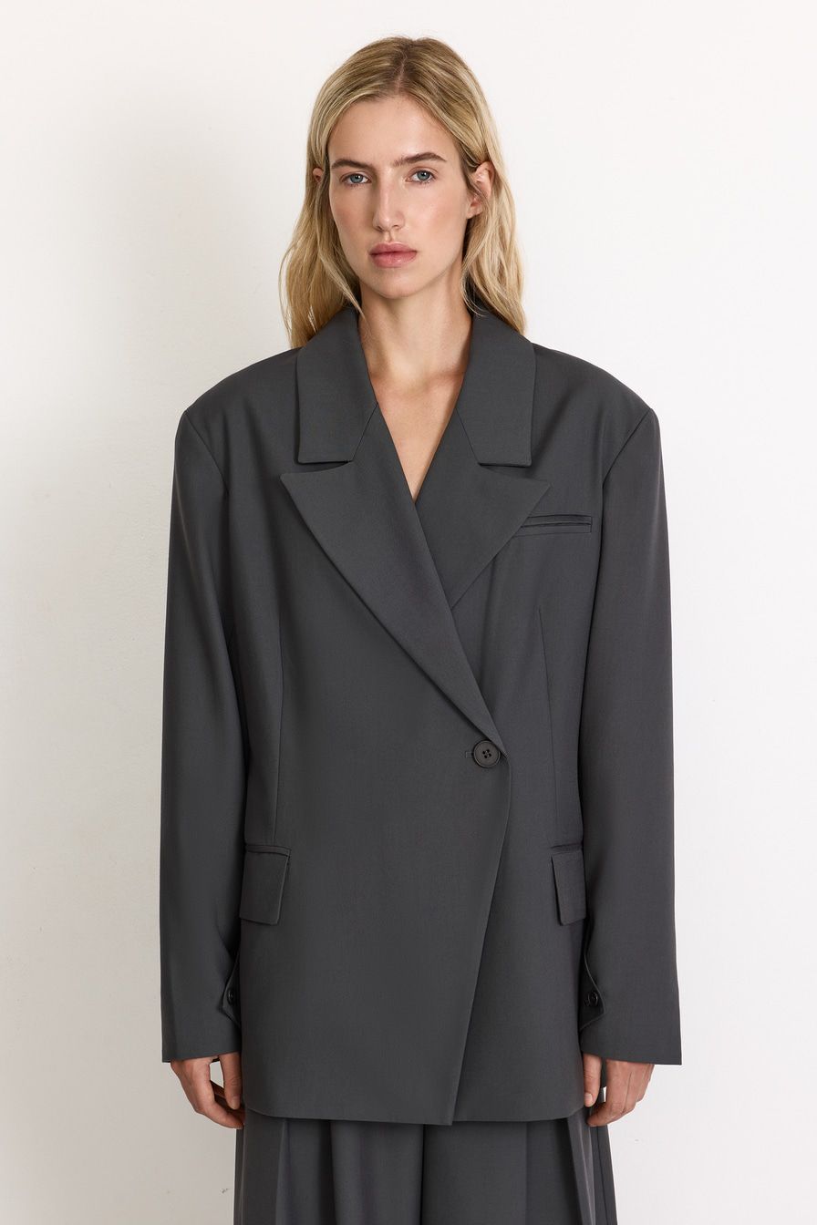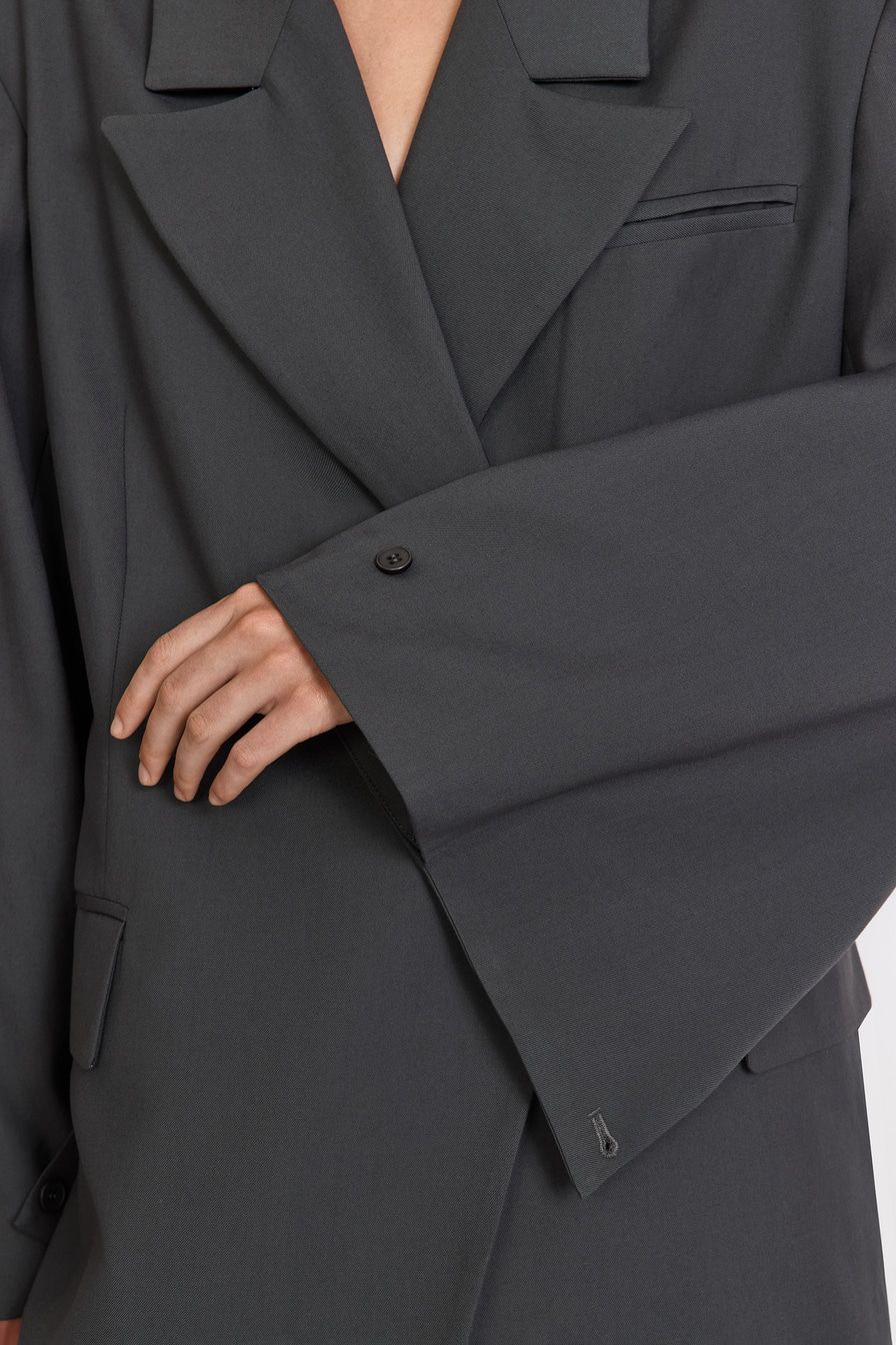 Темно-серый жакет с фигурным запа́хом выполнен из смесовой ткани с добавлением вискозы. Модель дополнена широкими складками с запа́хом на рукавах.