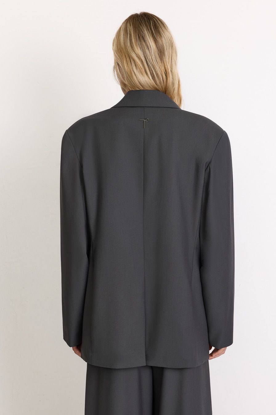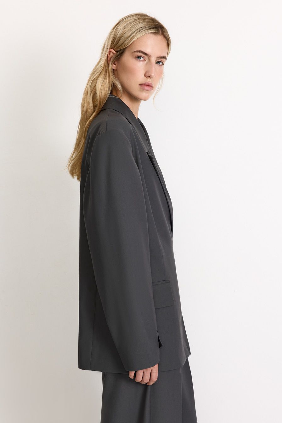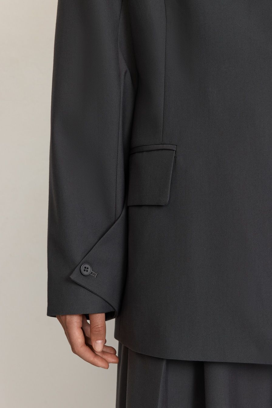 Темно-серый жакет с фигурным запа́хом выполнен из смесовой ткани с добавлением вискозы. Модель дополнена широкими складками с запа́хом на рукавах.