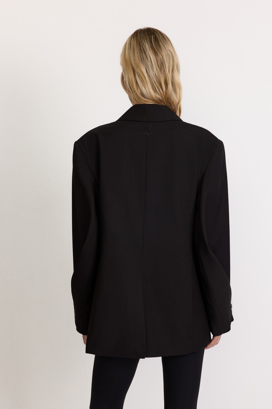 Черный жакет с фигурным запа́хом выполнен из смесовой ткани с добавлением вискозы. Модель дополнена широкими складками с запа́хом на рукавах.
