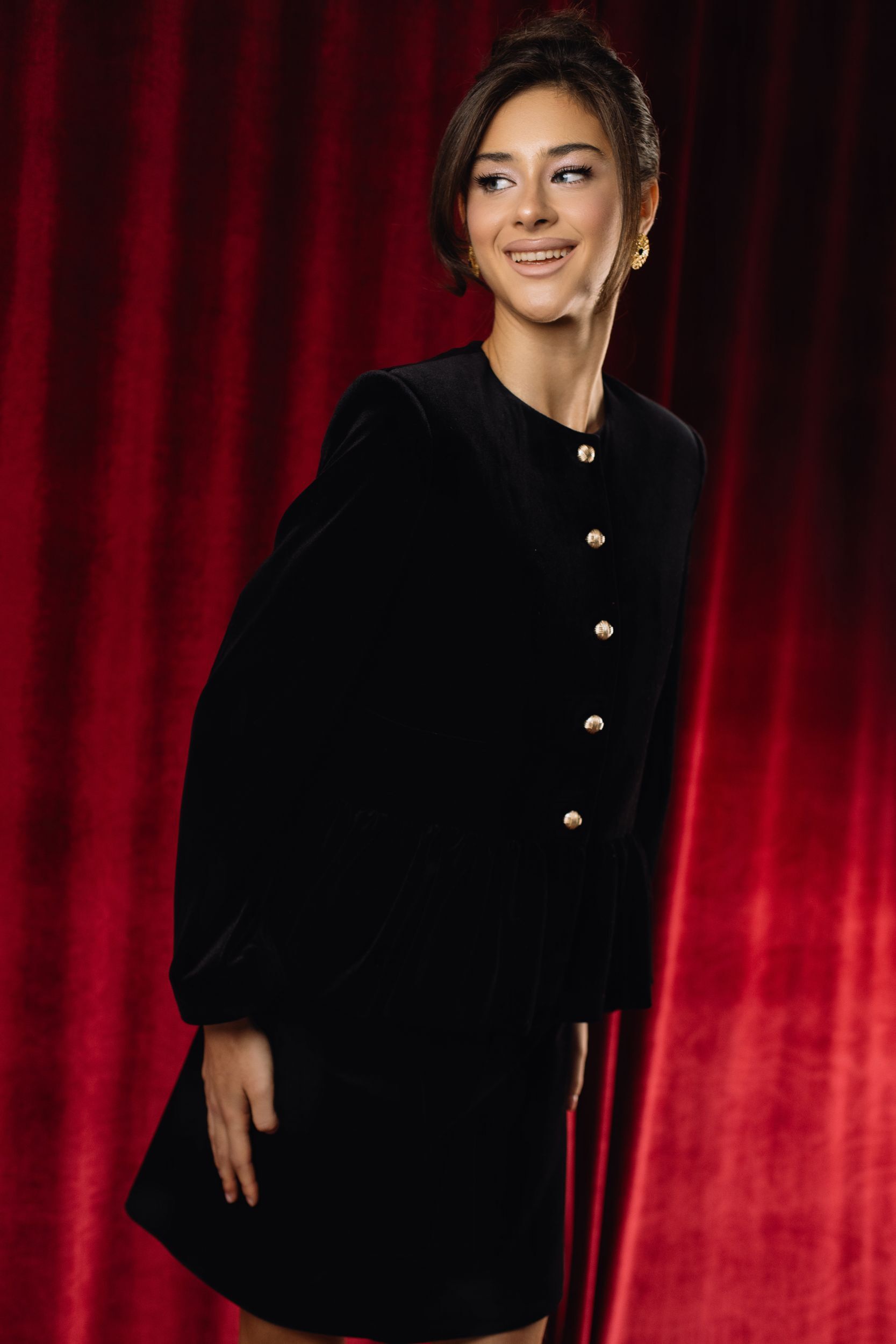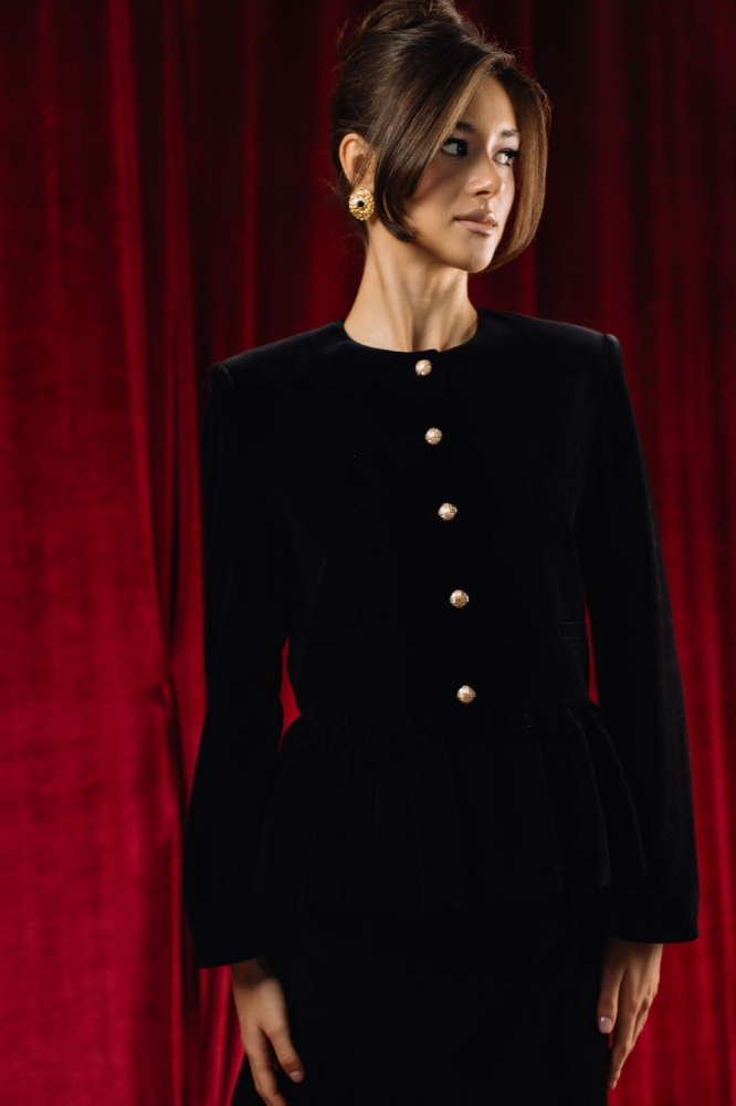 Прямой жакет из бархата в черном оттенке с объемной баской.