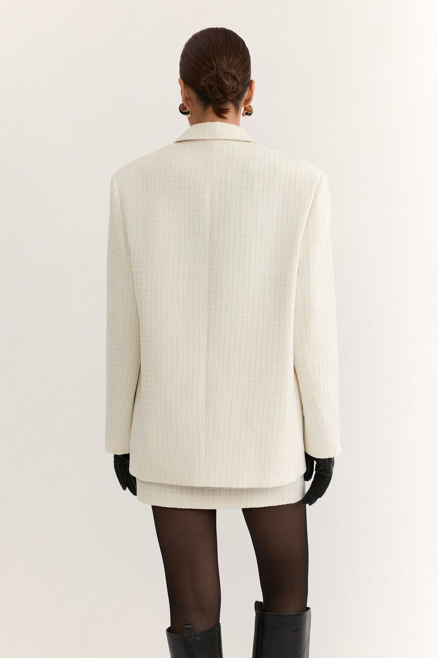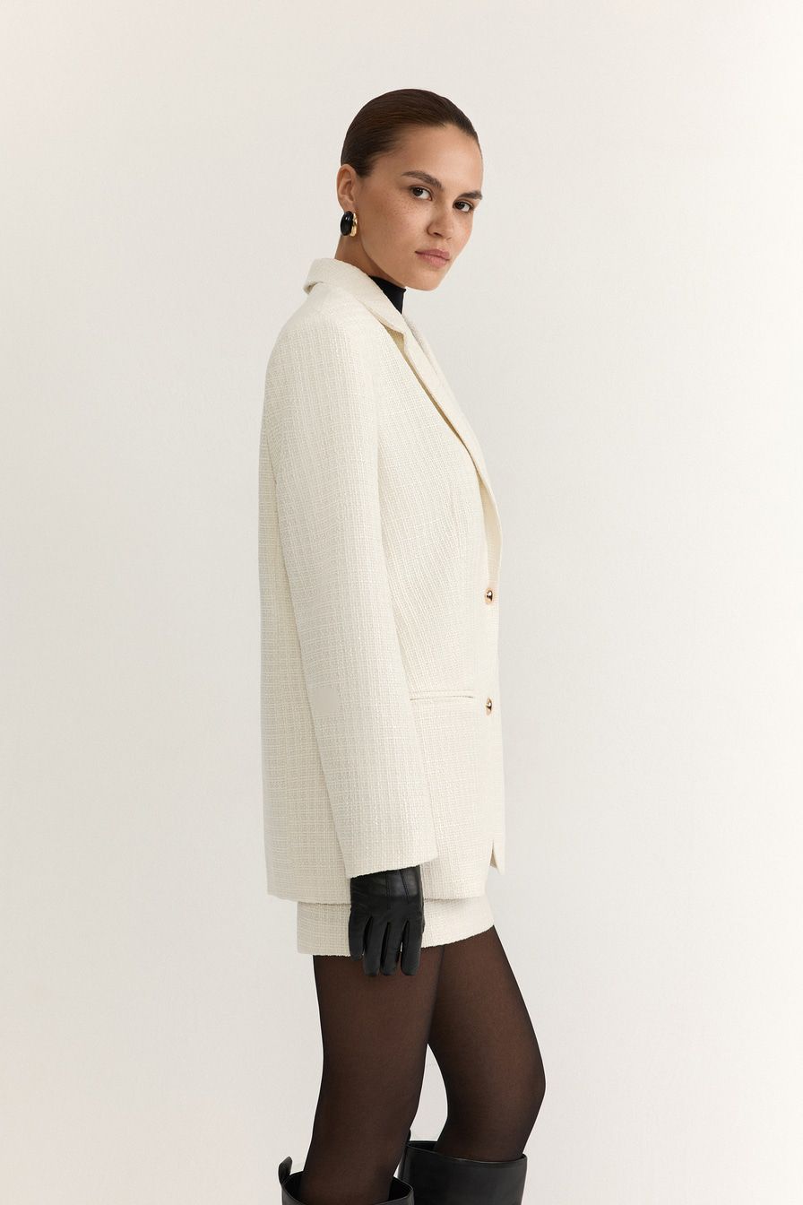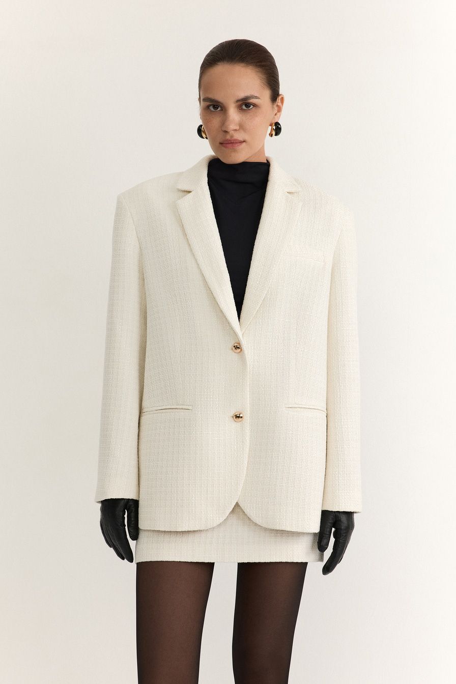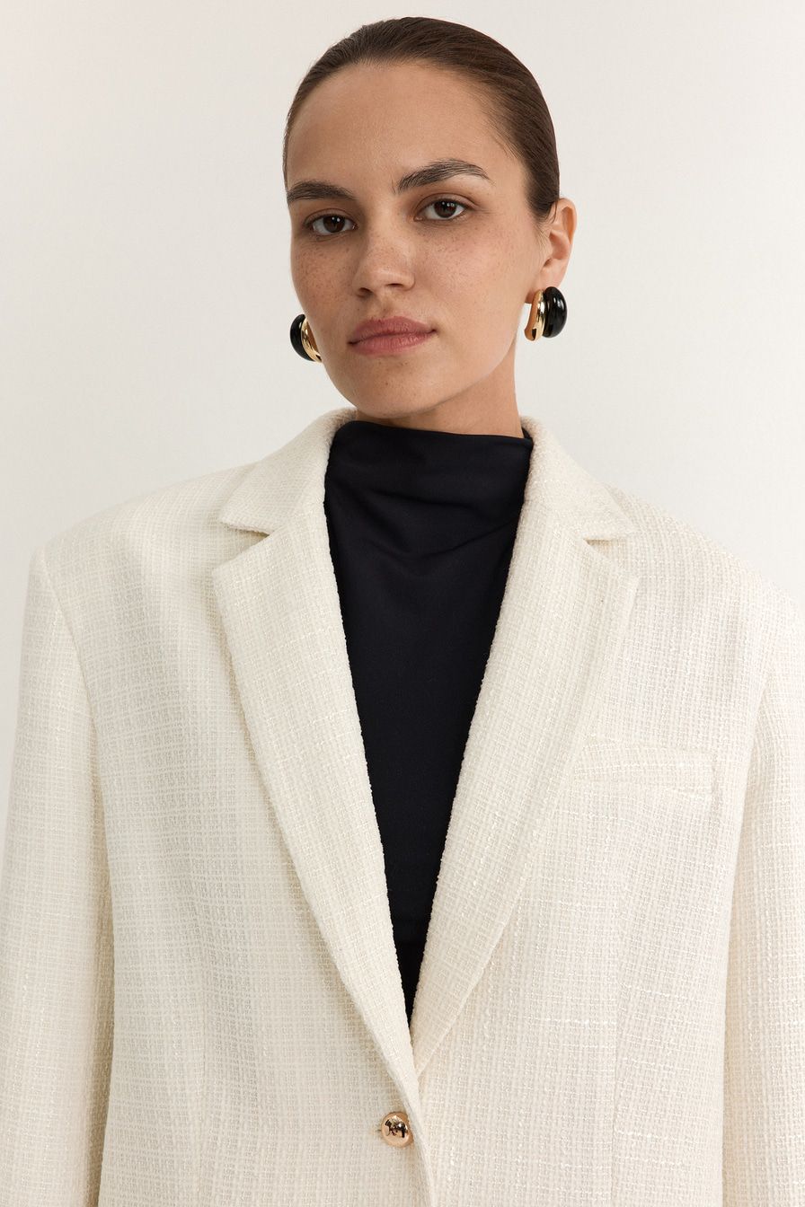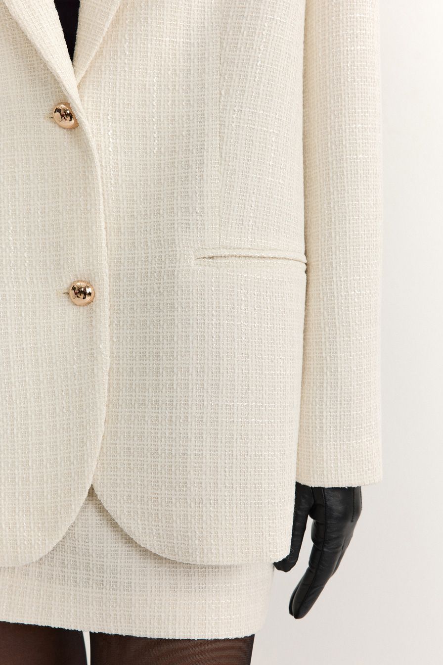 Молочный твидовый жакет из смесовой вискозы – модель прямого однобортного кроя. Жакет дополнен боковыми карманами и золотистыми пуговицами.