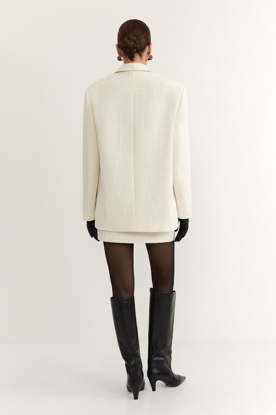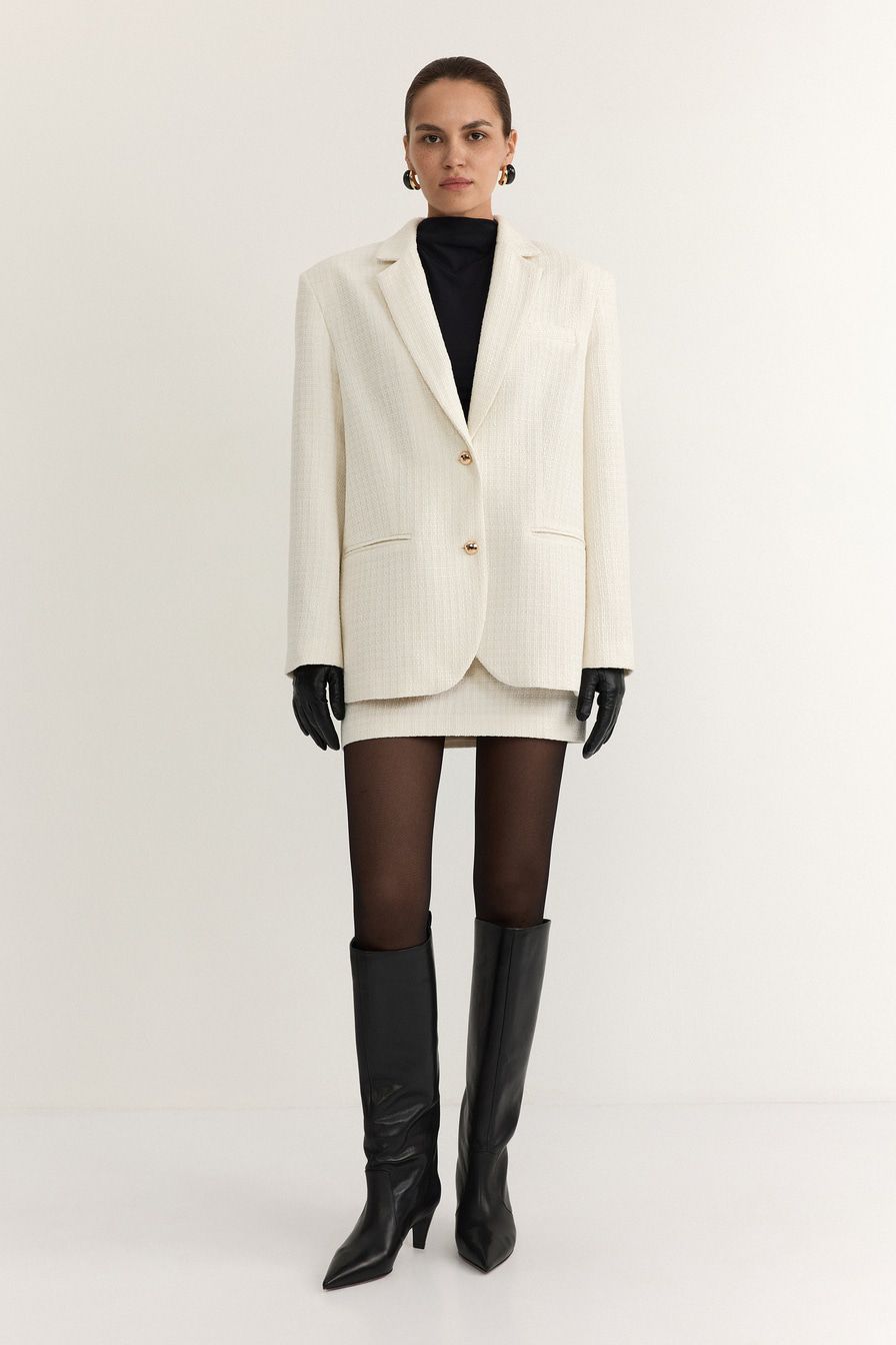 «Для бранча с подругами сочетайте жакет с тонкой черной водолазкой, твидовой юбкой из комплекта и ботфортами на высоком каблуке».