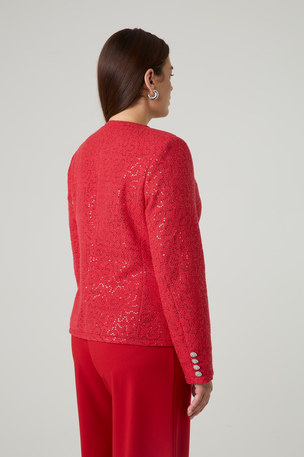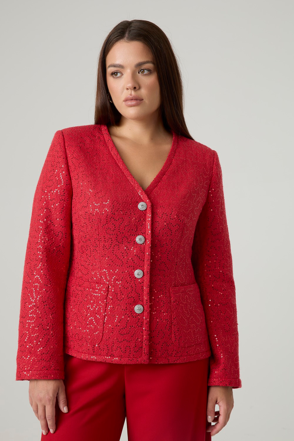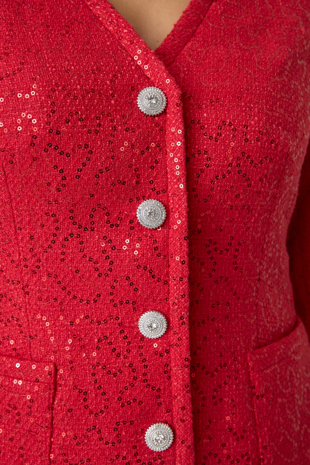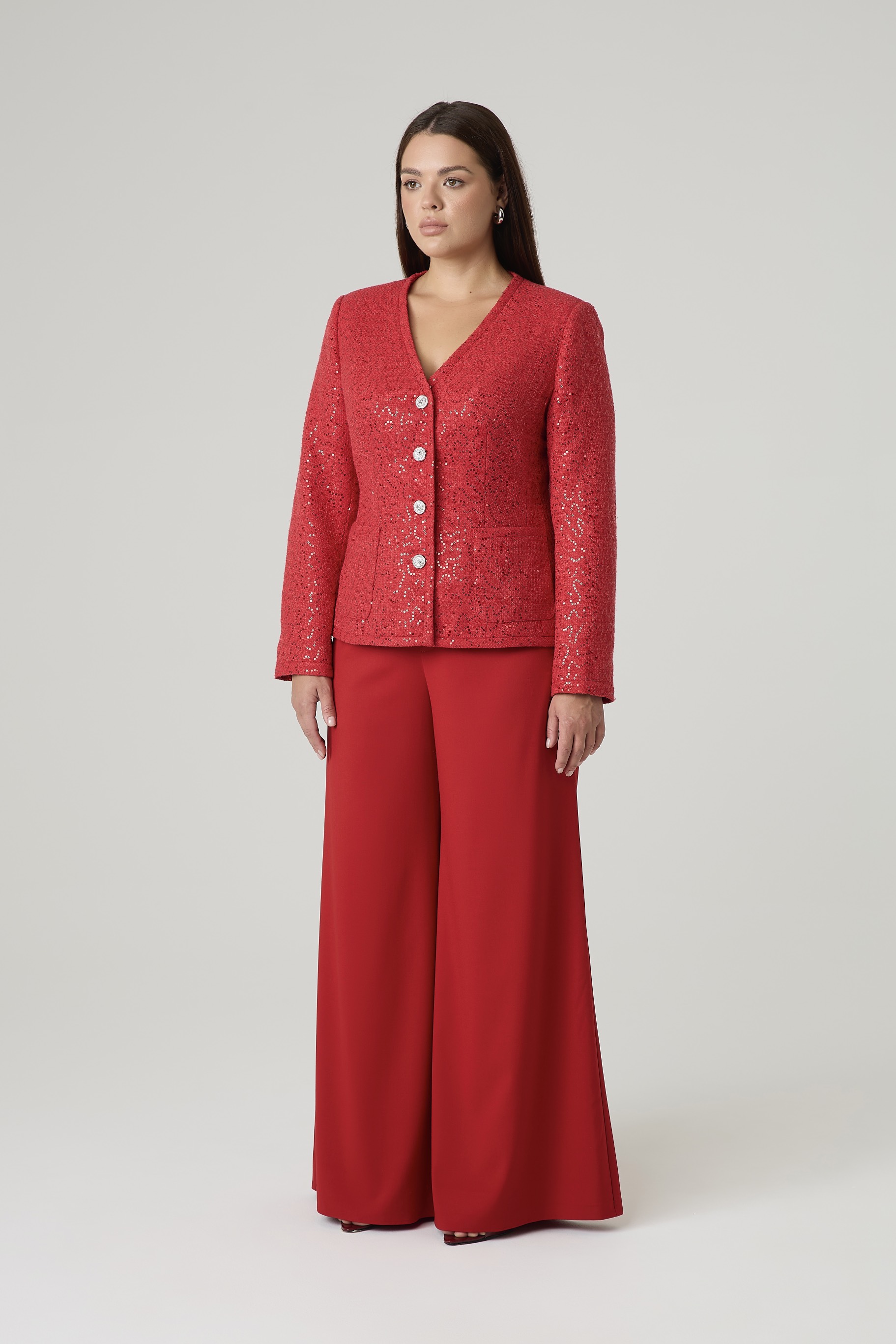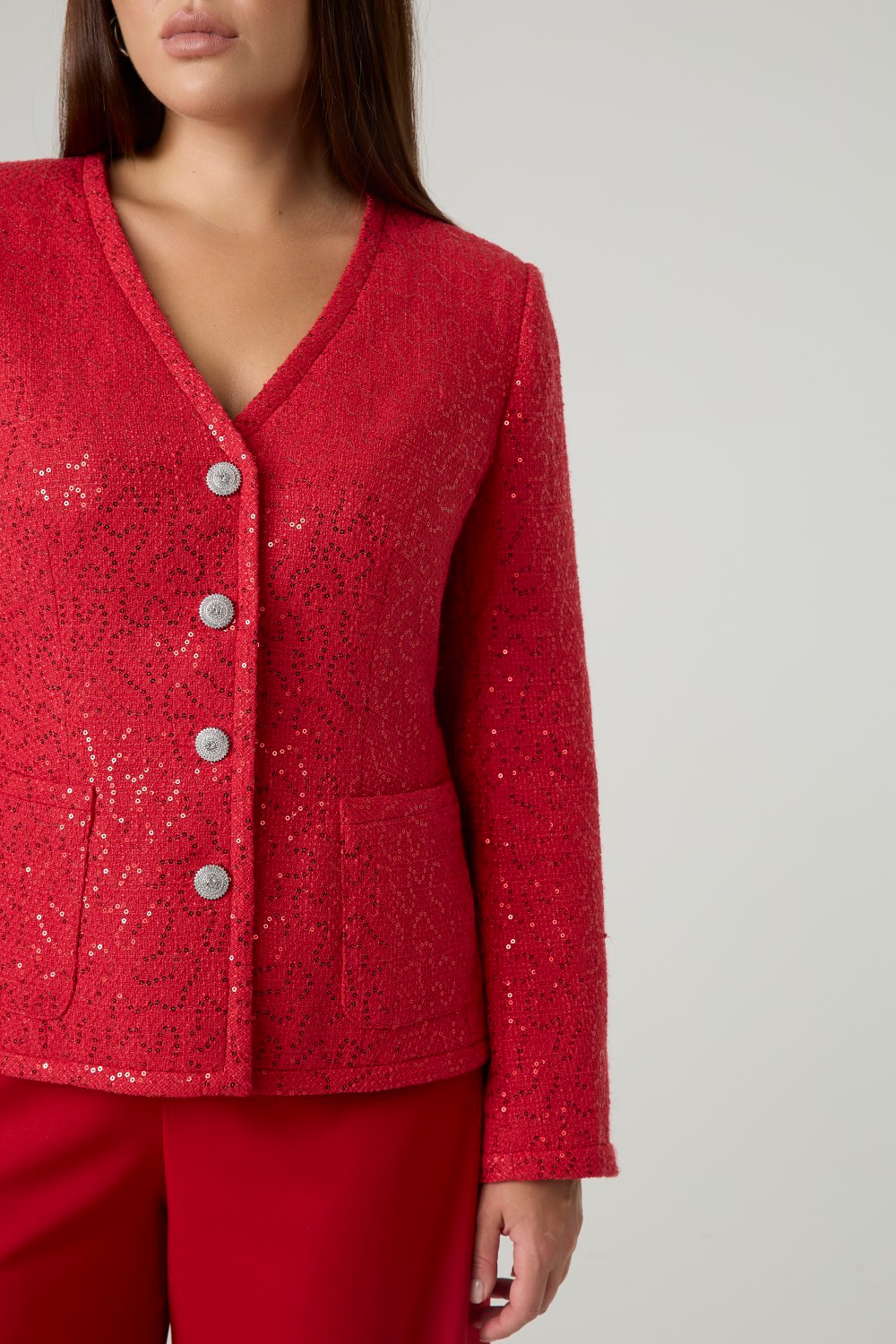 Элегантный твидовый жакет, декорированный пайетками. Однобортная застежка на акцентные пуговицы. Два нашивных кармана спереди. V-образный вырез горловины эффектно подчеркивает шею и удлиняет ее. Твид преобразит любой образ, добавив ему лоска и благородности.