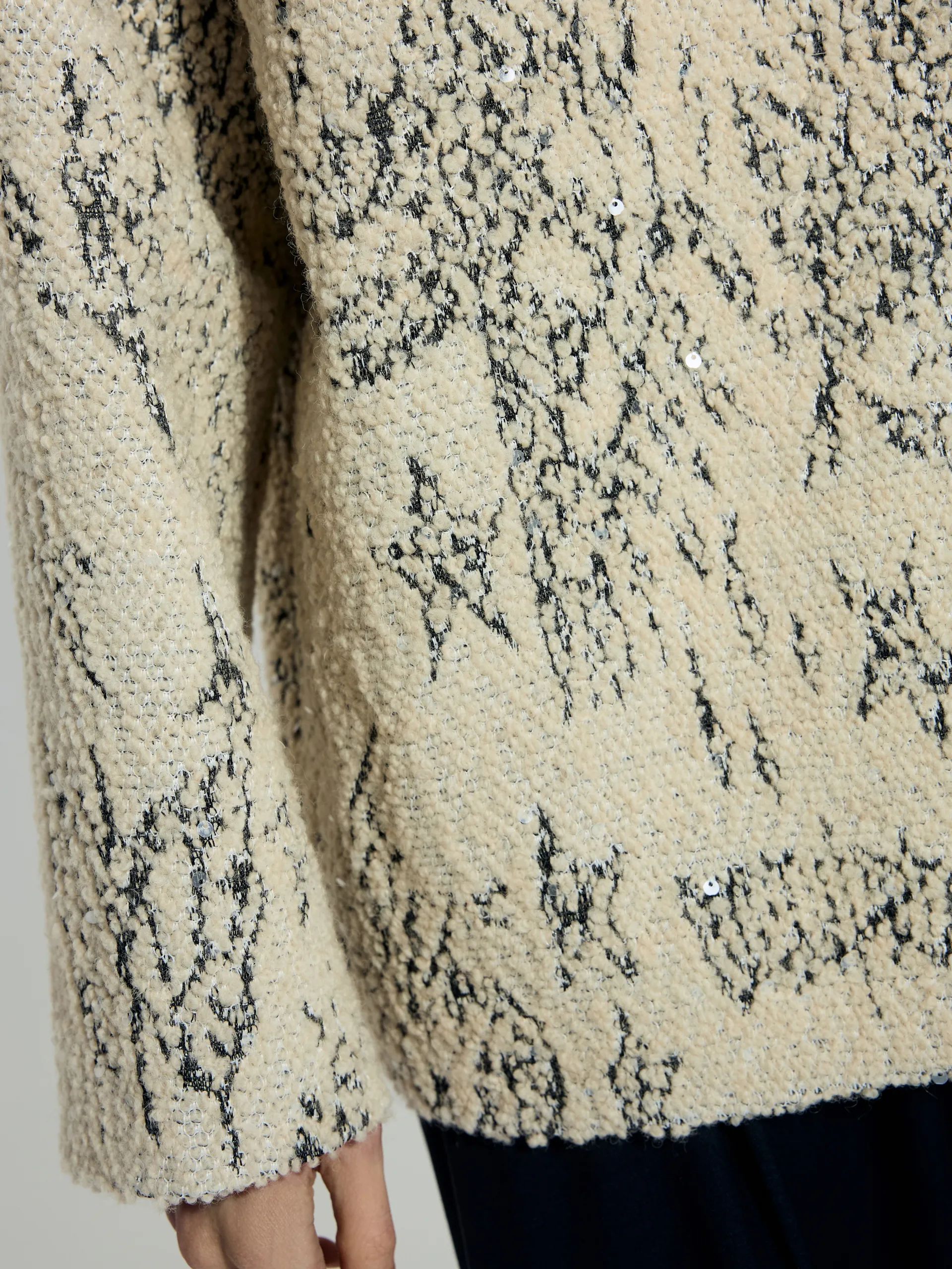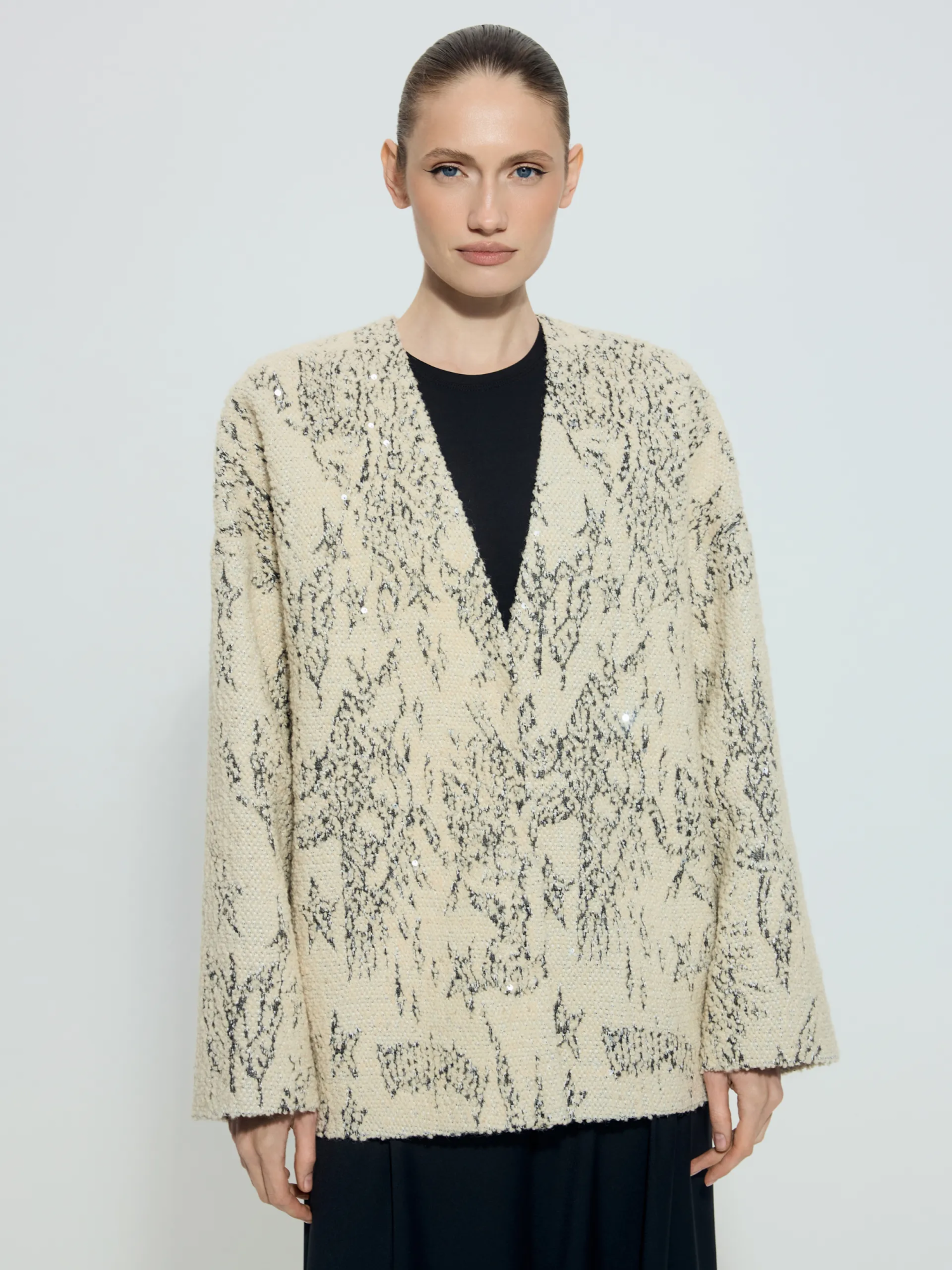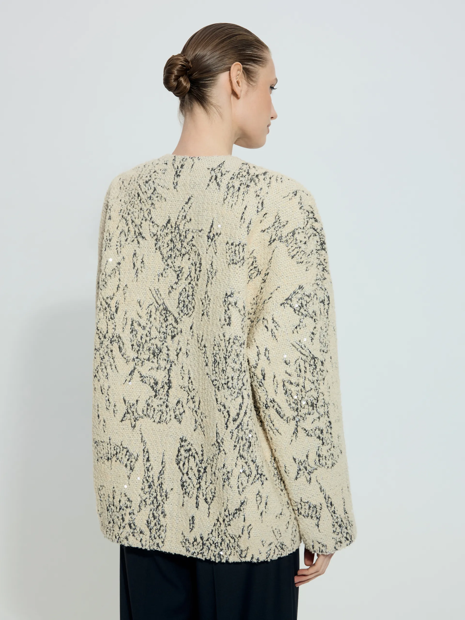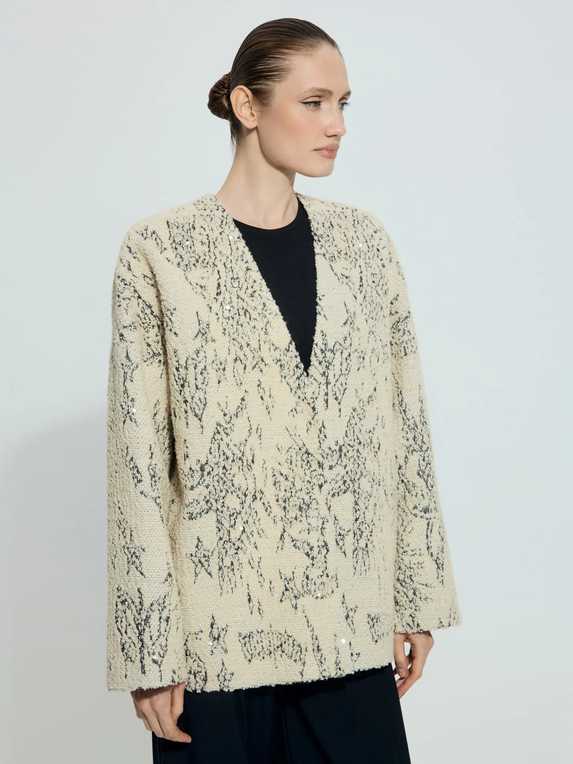 Кардиган Villar из фактурного твида с прозрачными пайетками — универсальная и акцентная модель в благородном кремовом оттенке. Мягкий трикотажный материал и свободный силуэт делают его комфортным для повседневной носки, а рандомно пришитые пайетки добавляют деликатный блеск и создают лёгкий праздничный эффект без излишней выразительности. Спущенная линия плеч делает образ более расслабленным, сохраняя при этом аккуратный и собранный вид. Кардиган легко сочетать с костюмными брюками, денимом, юбками миди и хлопковыми топами. Чтобы подчеркнуть талию и придать образу структуру, рекомендуем добавить тонкий пояс. Благодаря универсальному оттенку модель органично интегрируется в любой гардероб — от базового до более нарядного.