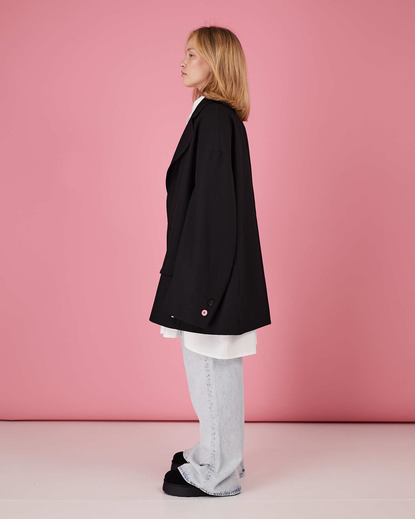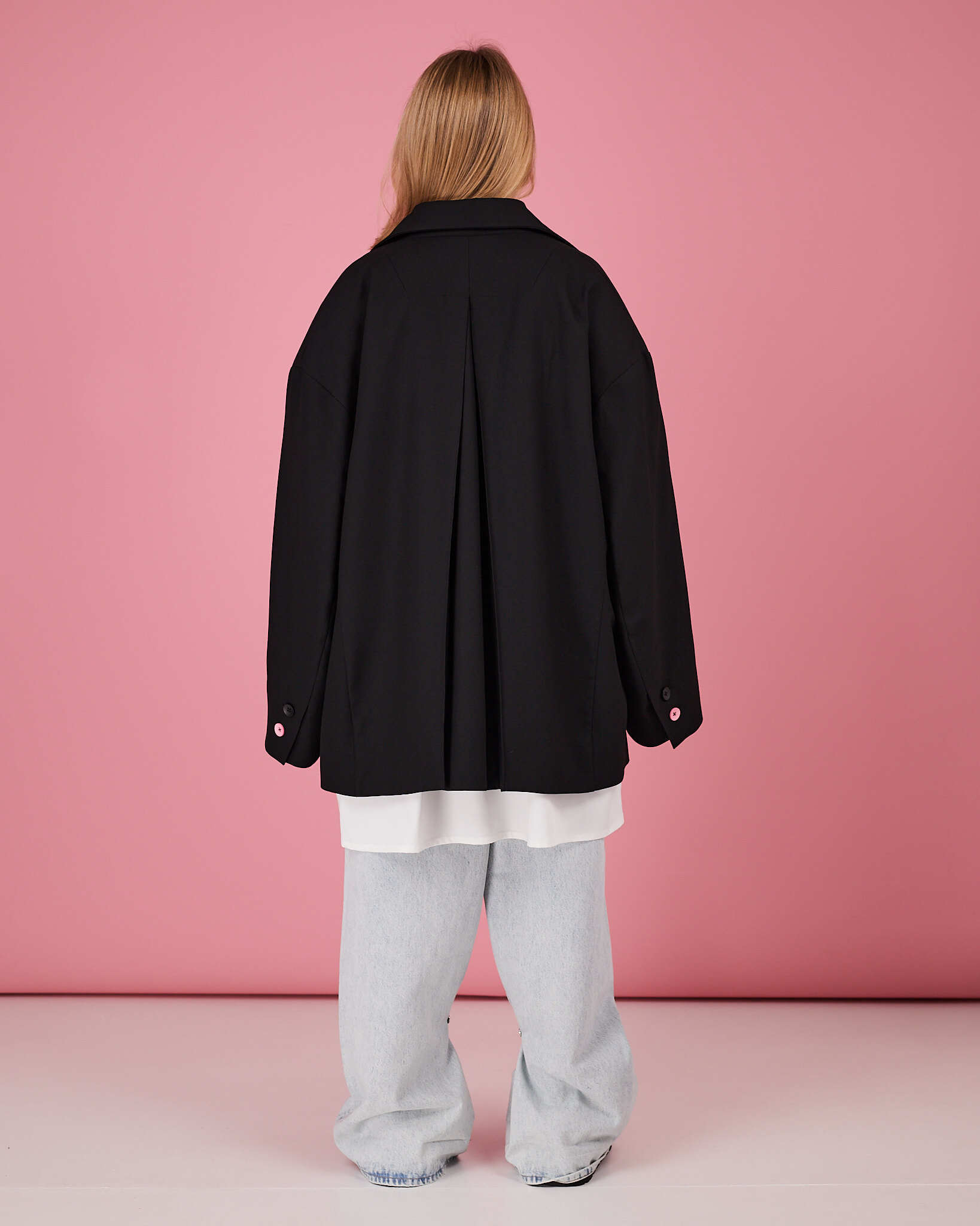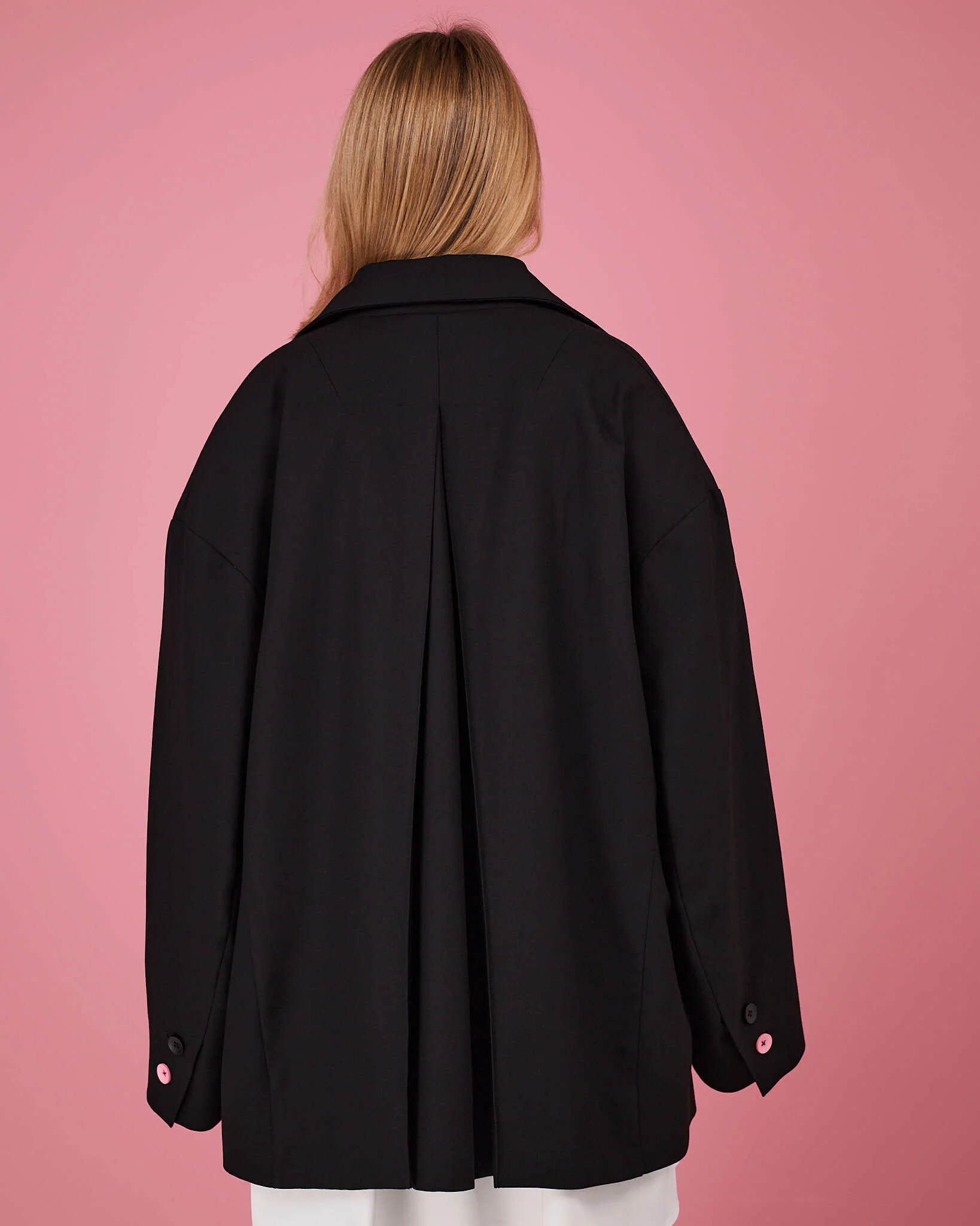 По две пуговицы на манжетах, одна из которых контрастная - розовая.