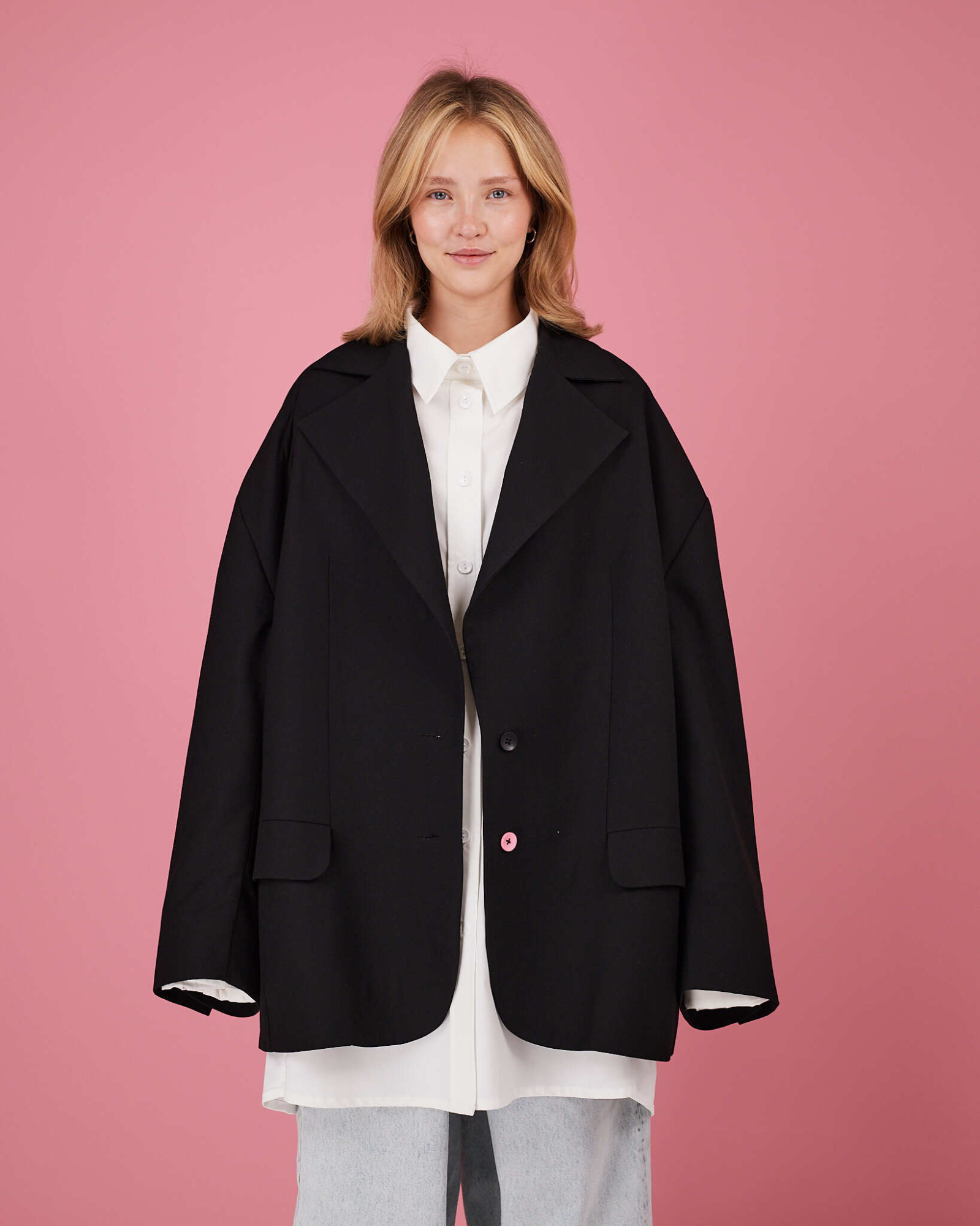 Две пуговицы спереди, одна из которых контрастная - розовая.