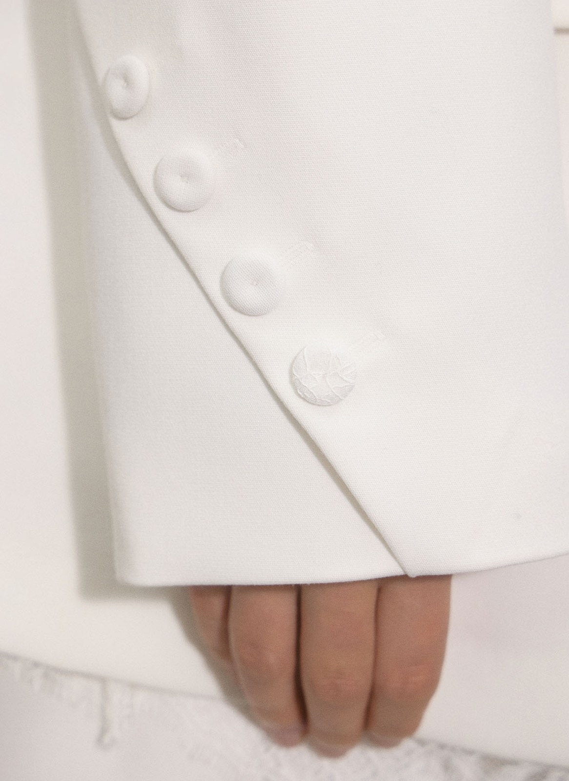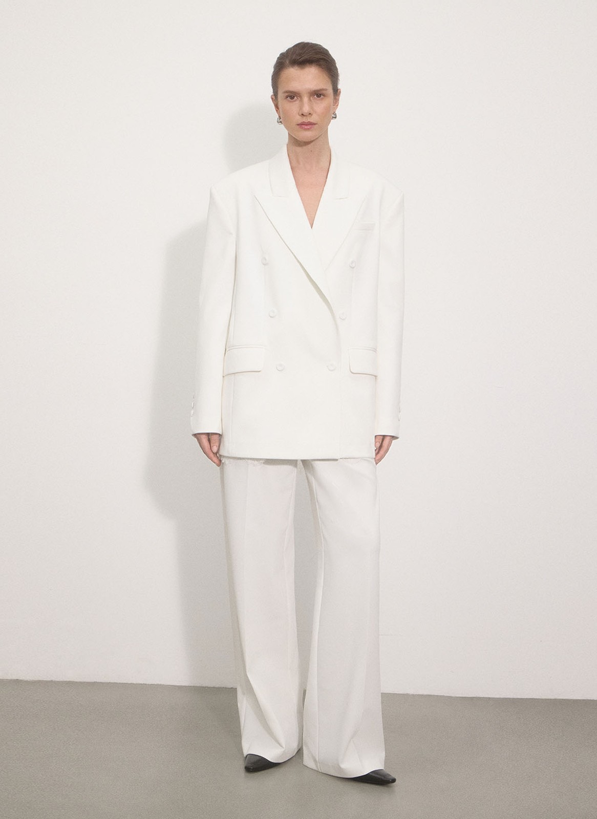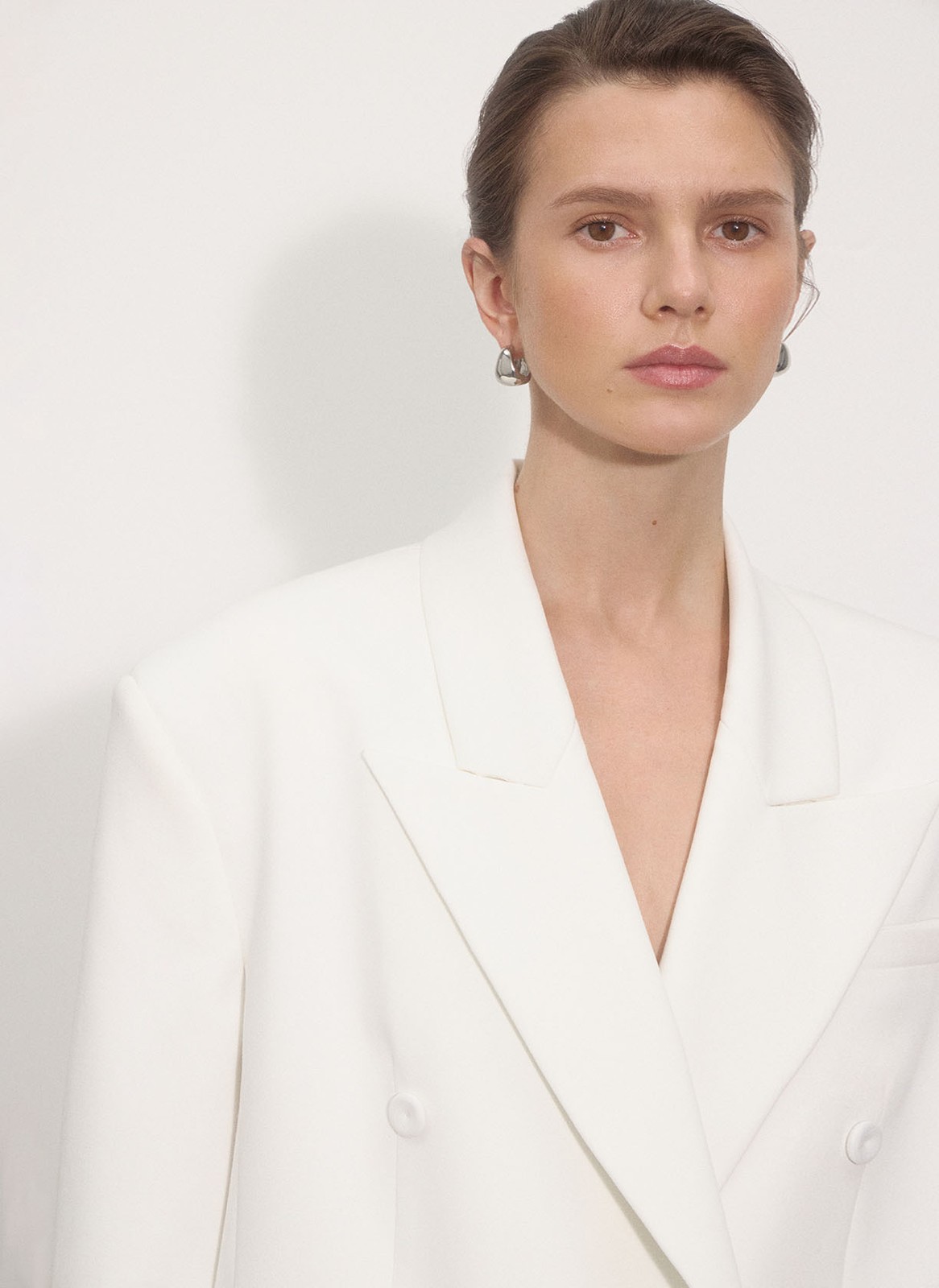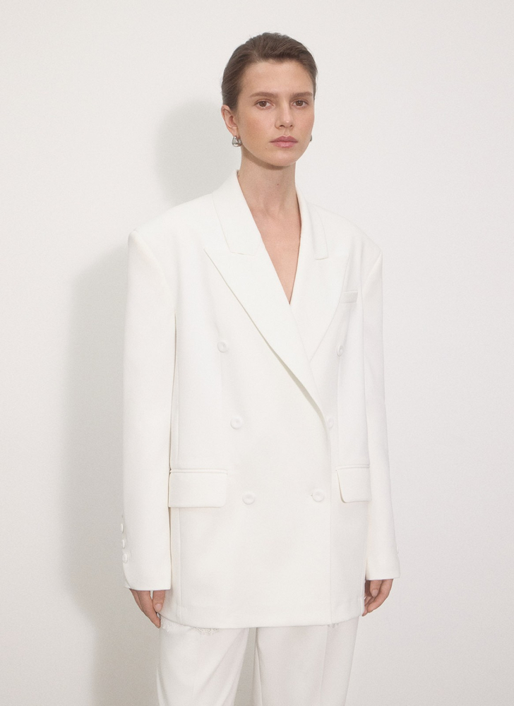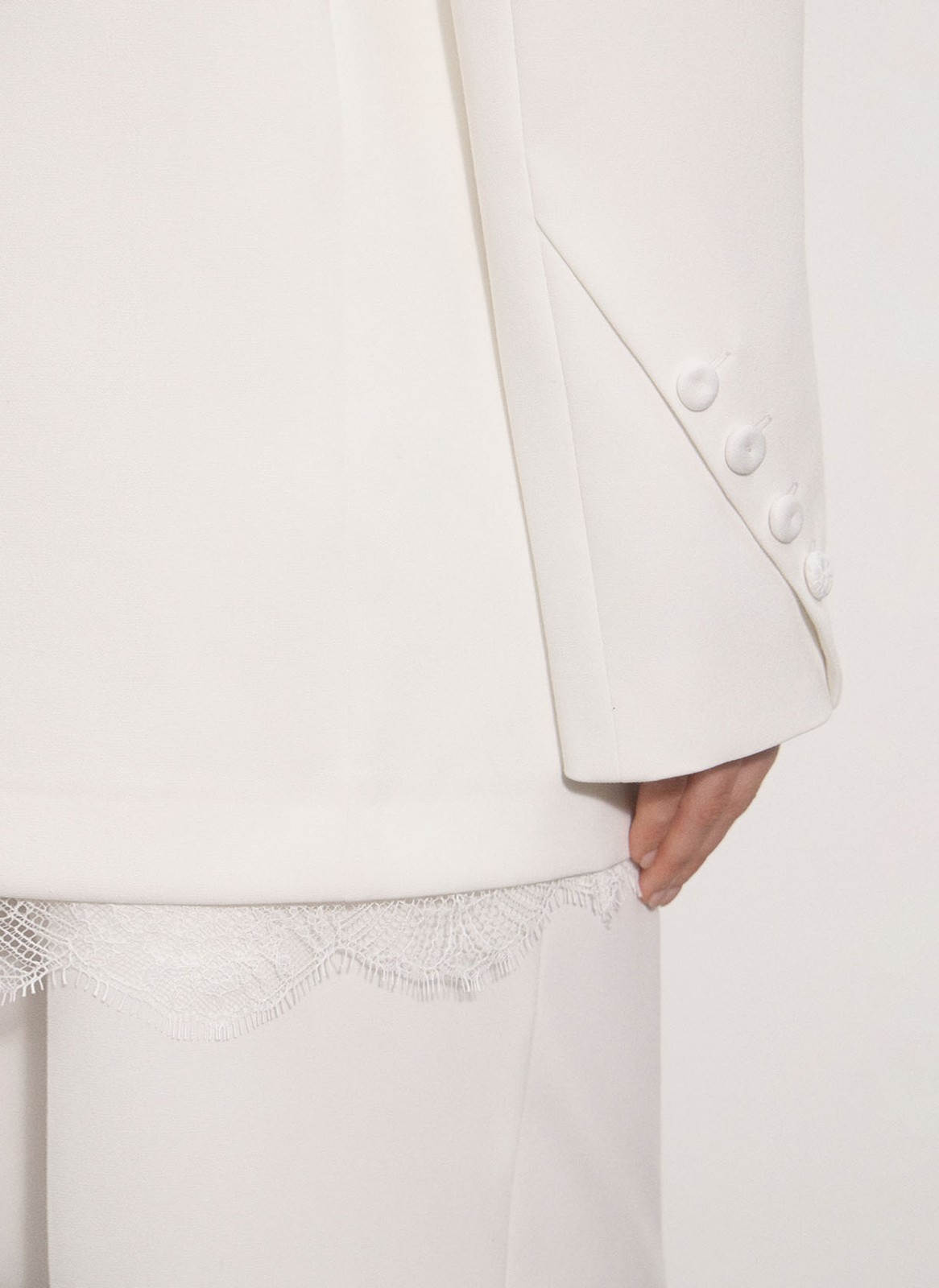Свободный двубортный жакет со слегка расширенной линией плеч создаёт современный образ. Длина ниже бедра, подкладка из тонкого кружева в тон изделия, а также кружевные элементы в отделке воротника и пуговиц придают жакету неповторимое очарование и добавляет изысканности.