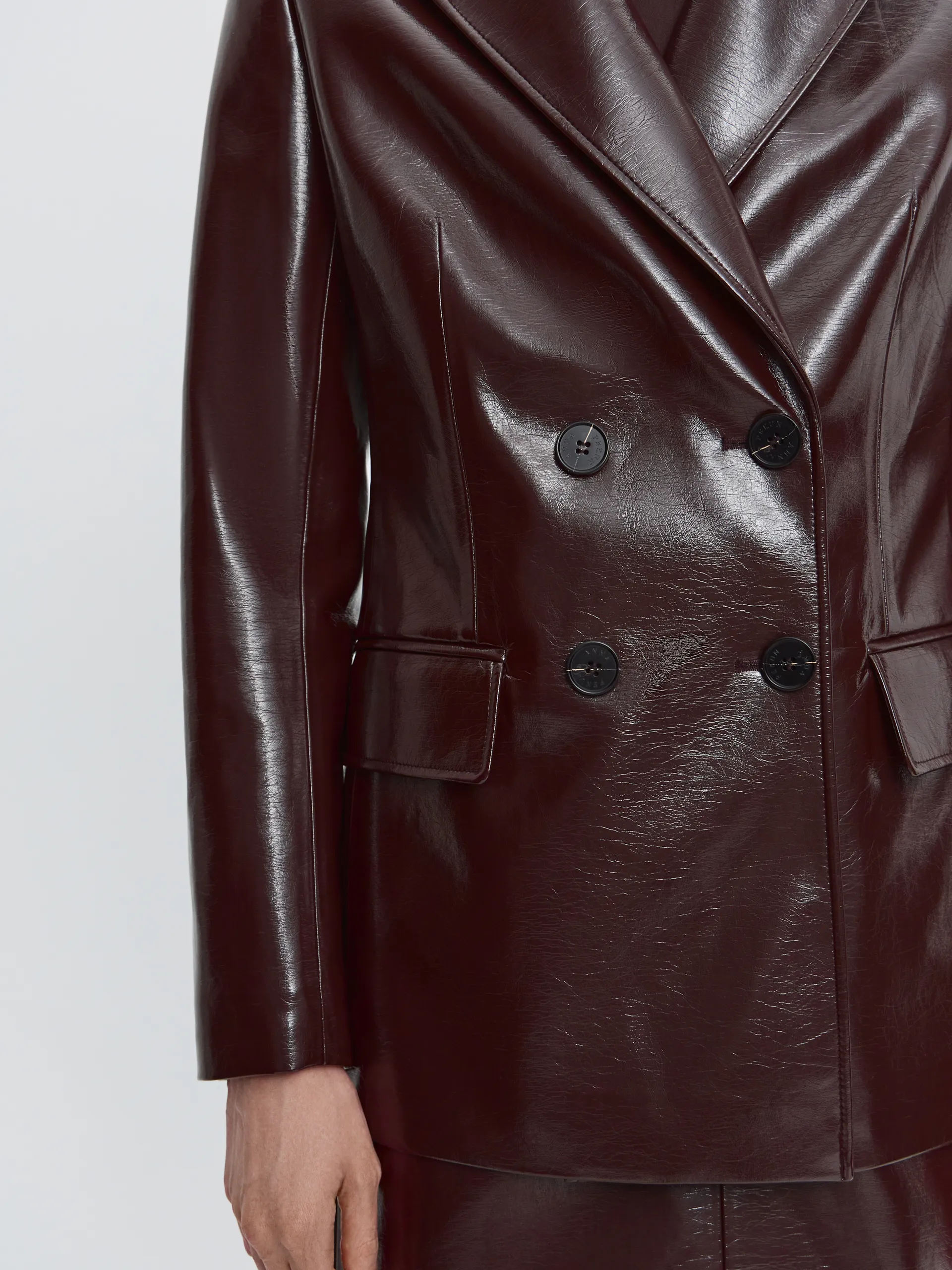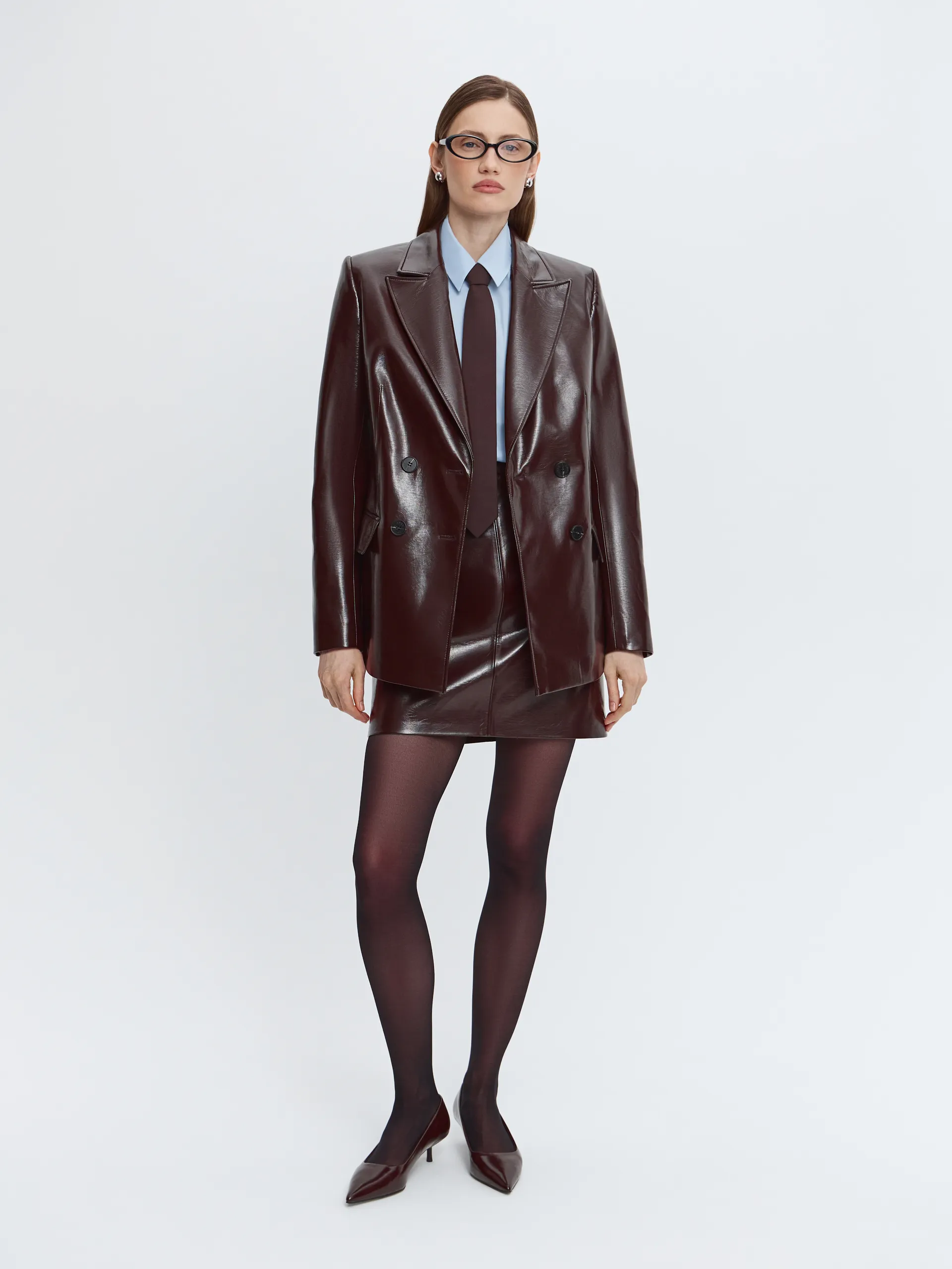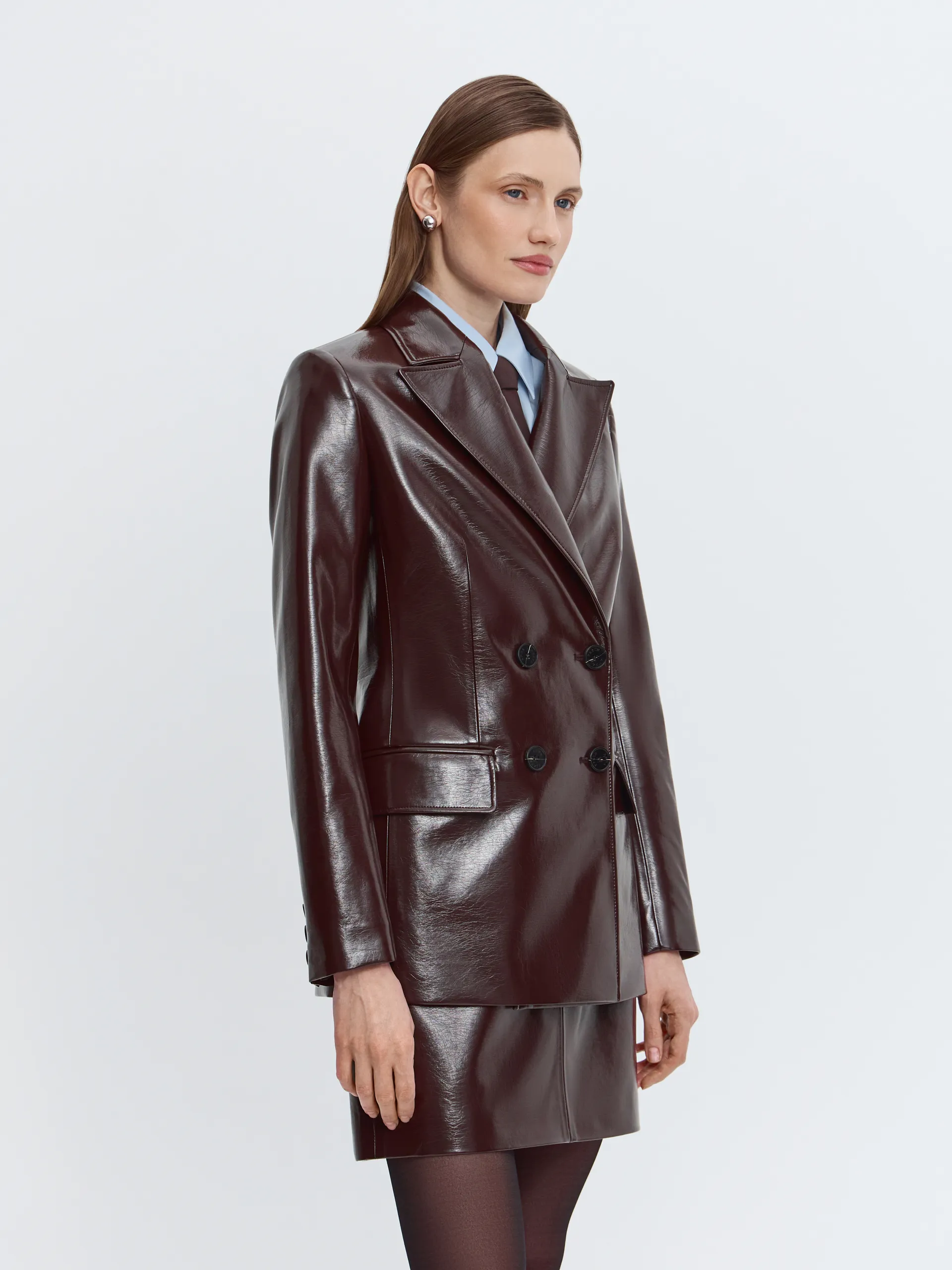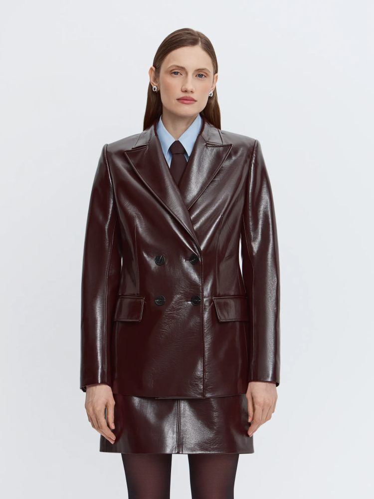Двубортный жакет Merlo. Модель выполнена из лакированной экокожи в оттенке тёмный шоколад — деликатный блеск подчёркивает выразительную фактуру, близкую к натуральной коже. Увеличенная линия плеча и широкие лацканы формируют сильный, собранный силуэт и добавляют образу актуальности. Внимание к деталям читается в премиальной обработке и контрастном канте на внутренней стороне жакета. Жакет легко носить комплектом с юбкой Merlo или сочетать с чёрными брюками и белой рубашкой для более сдержанного образа.