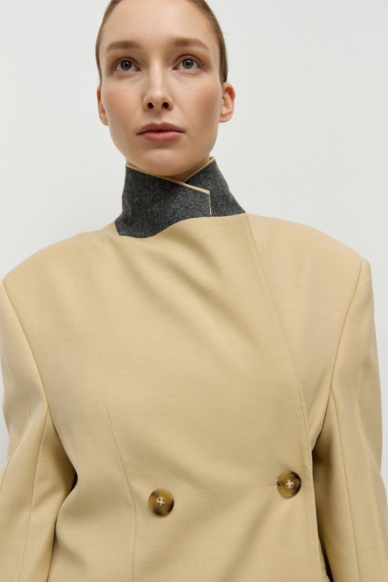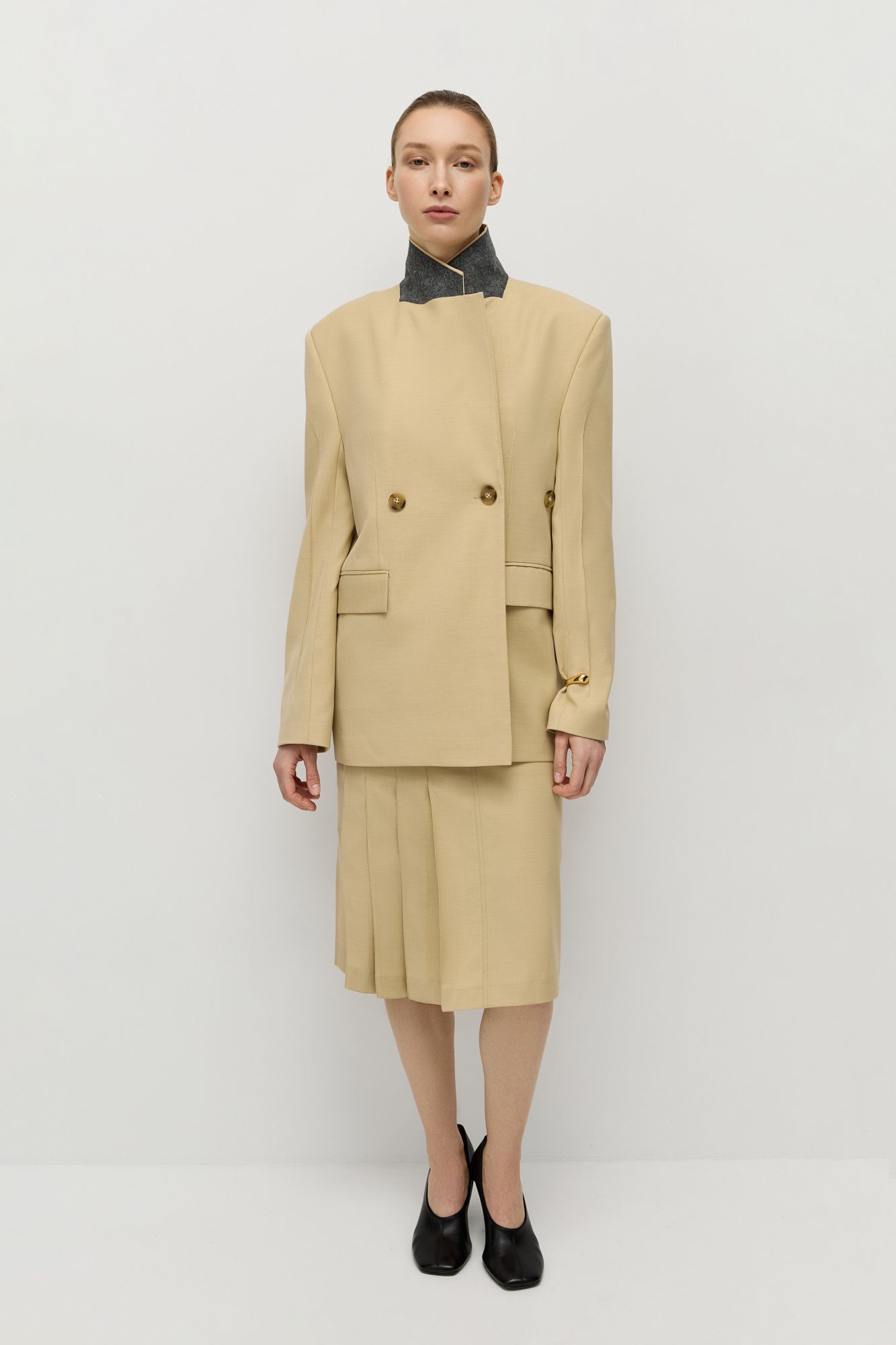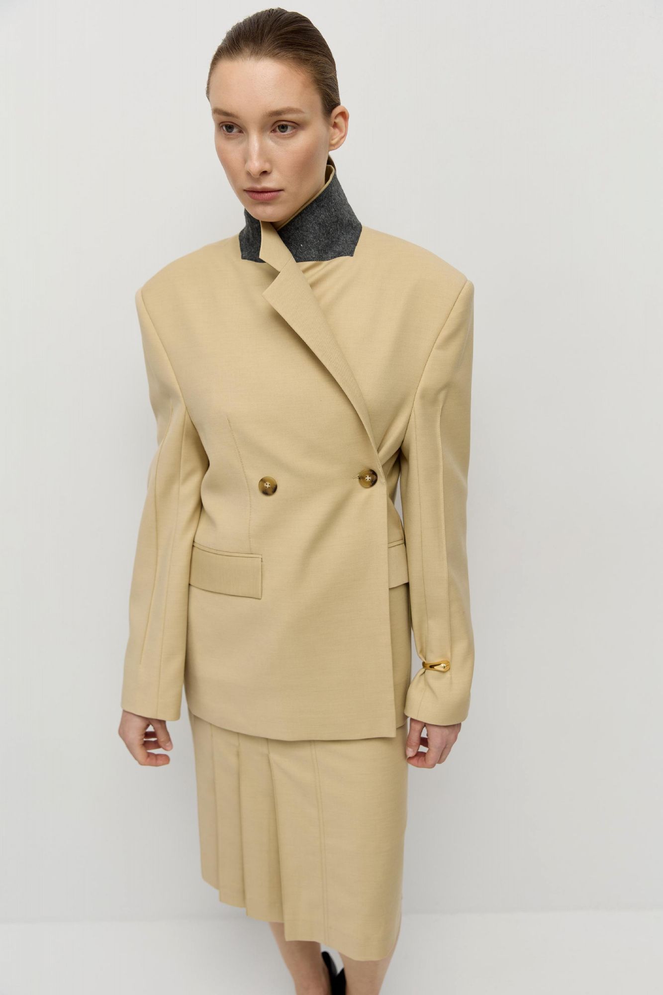 Двубортный жакет прямого кроя с небычным расположением пуговиц, позволяющих сделать более приталенный силуэт изделия.