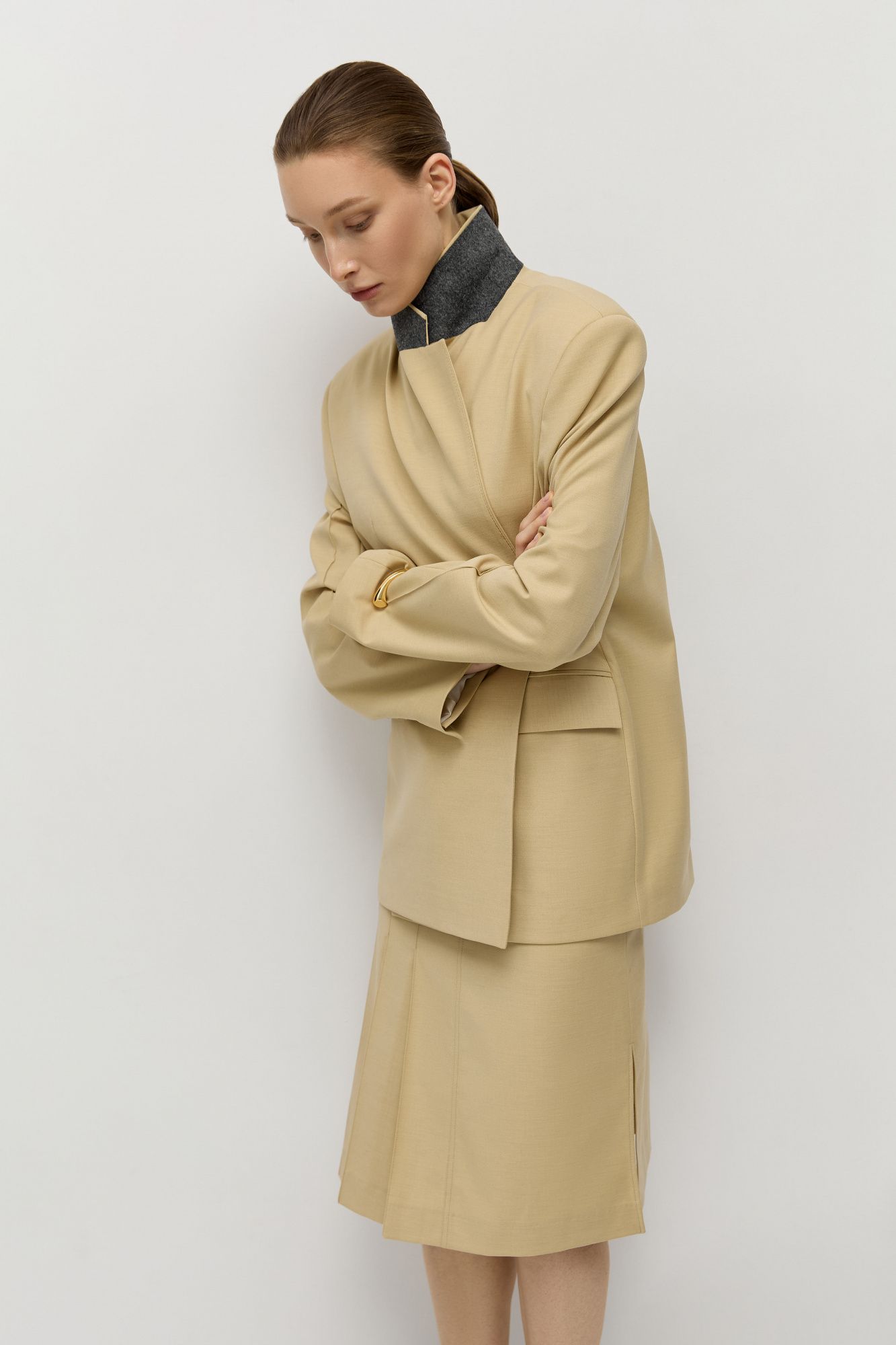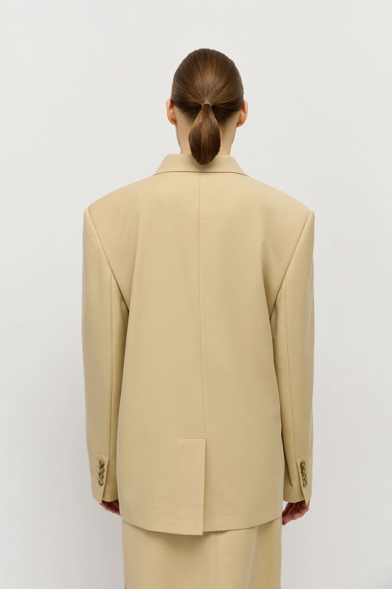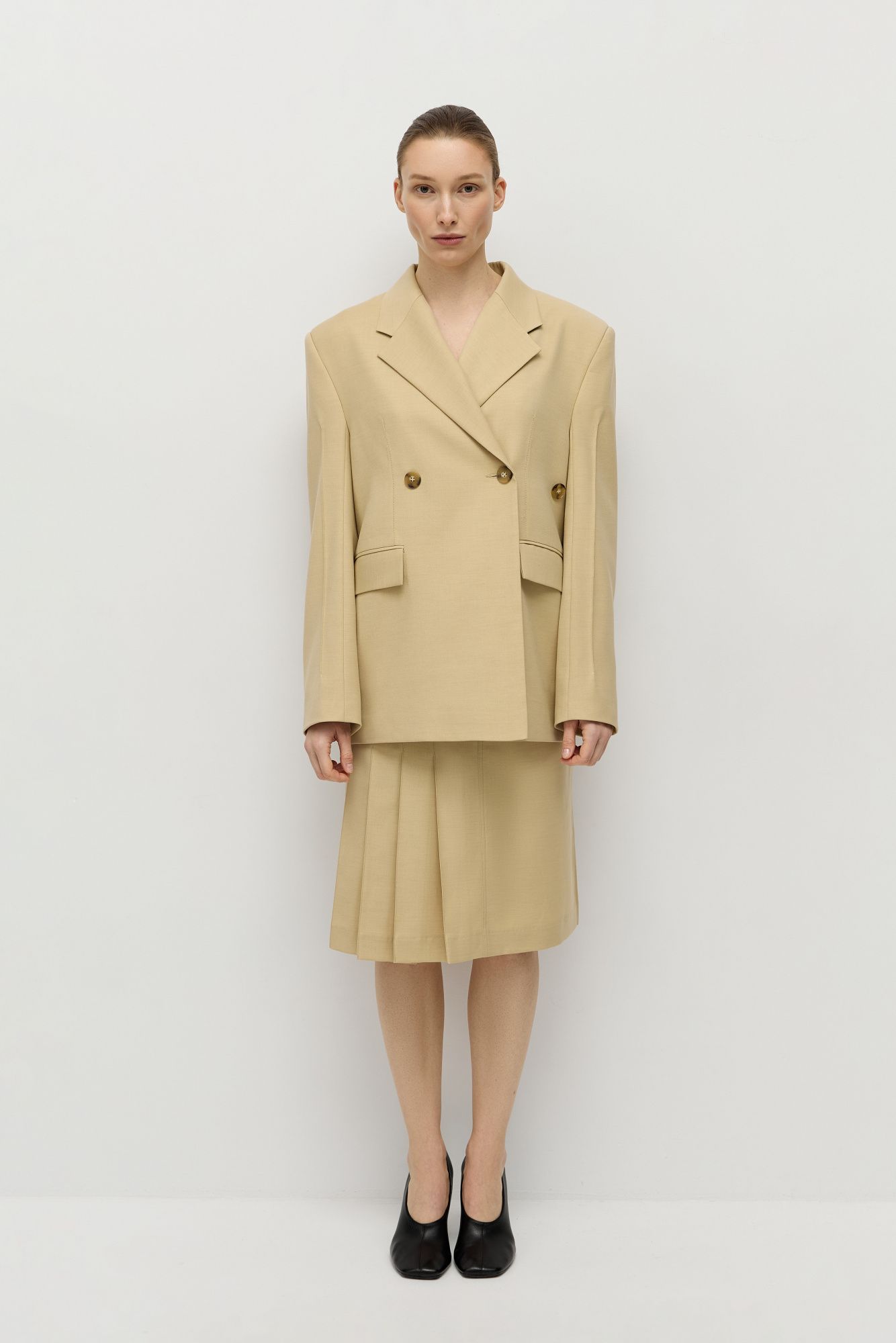 Двубортный жакет прямого кроя с небычным расположением пуговиц, позволяющих сделать более приталенный силуэт изделия.