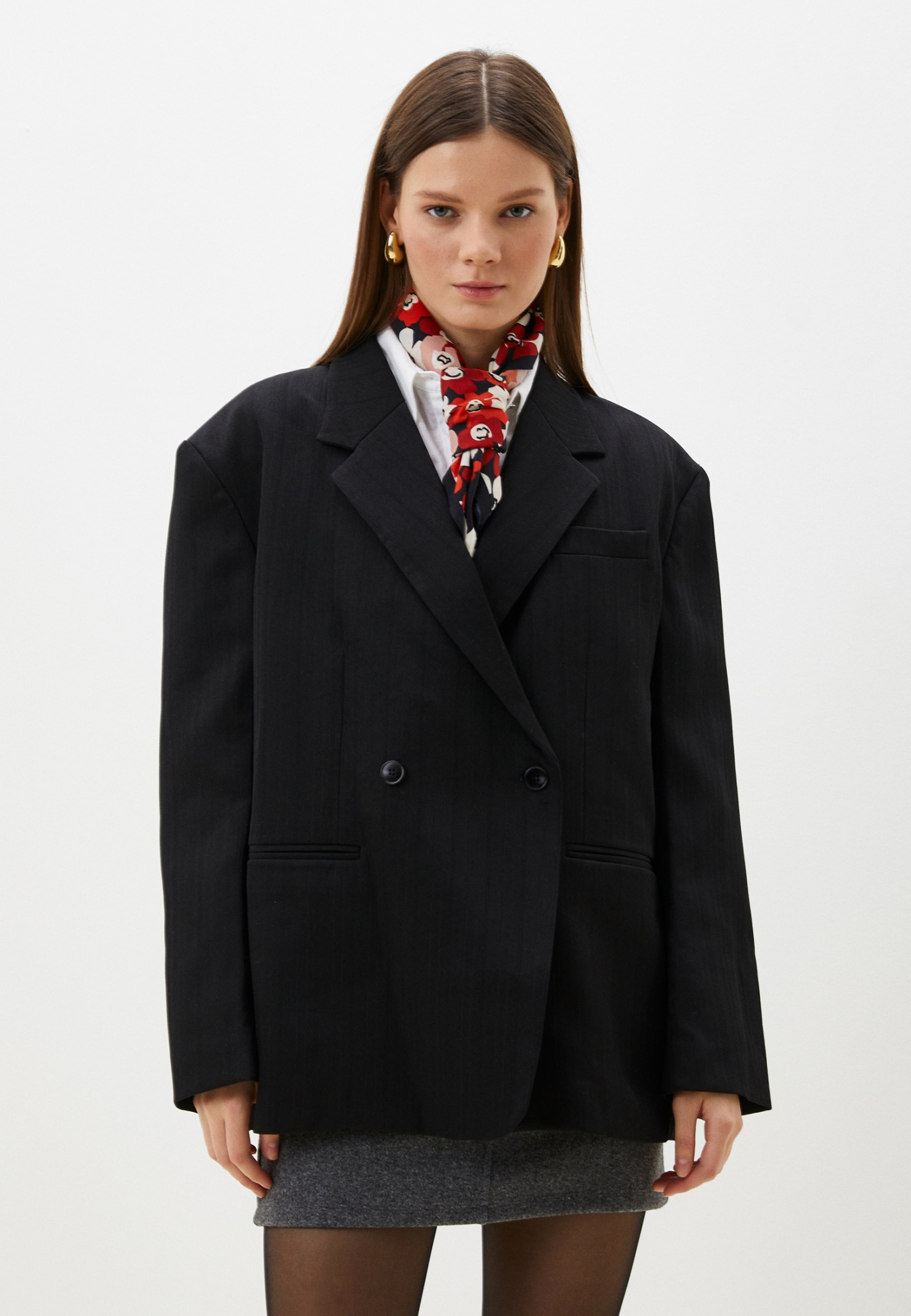 Двубортный пиджак в тонкую полоску — стильный элемент гардероба, который подойдёт для создания элегантного образа. Отлично впишется в деловые и вечерние наряды, добавляя изысканности и шарма.