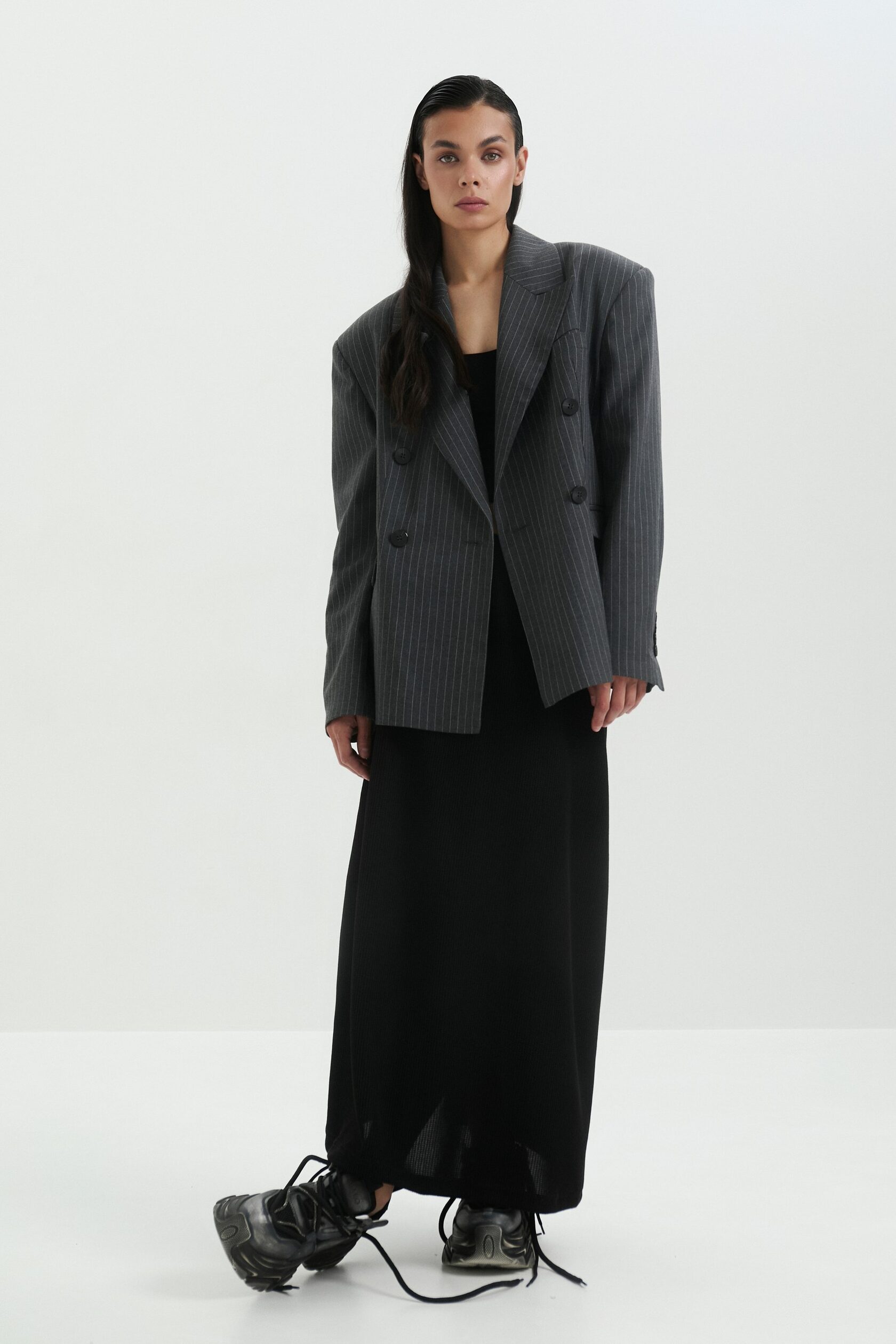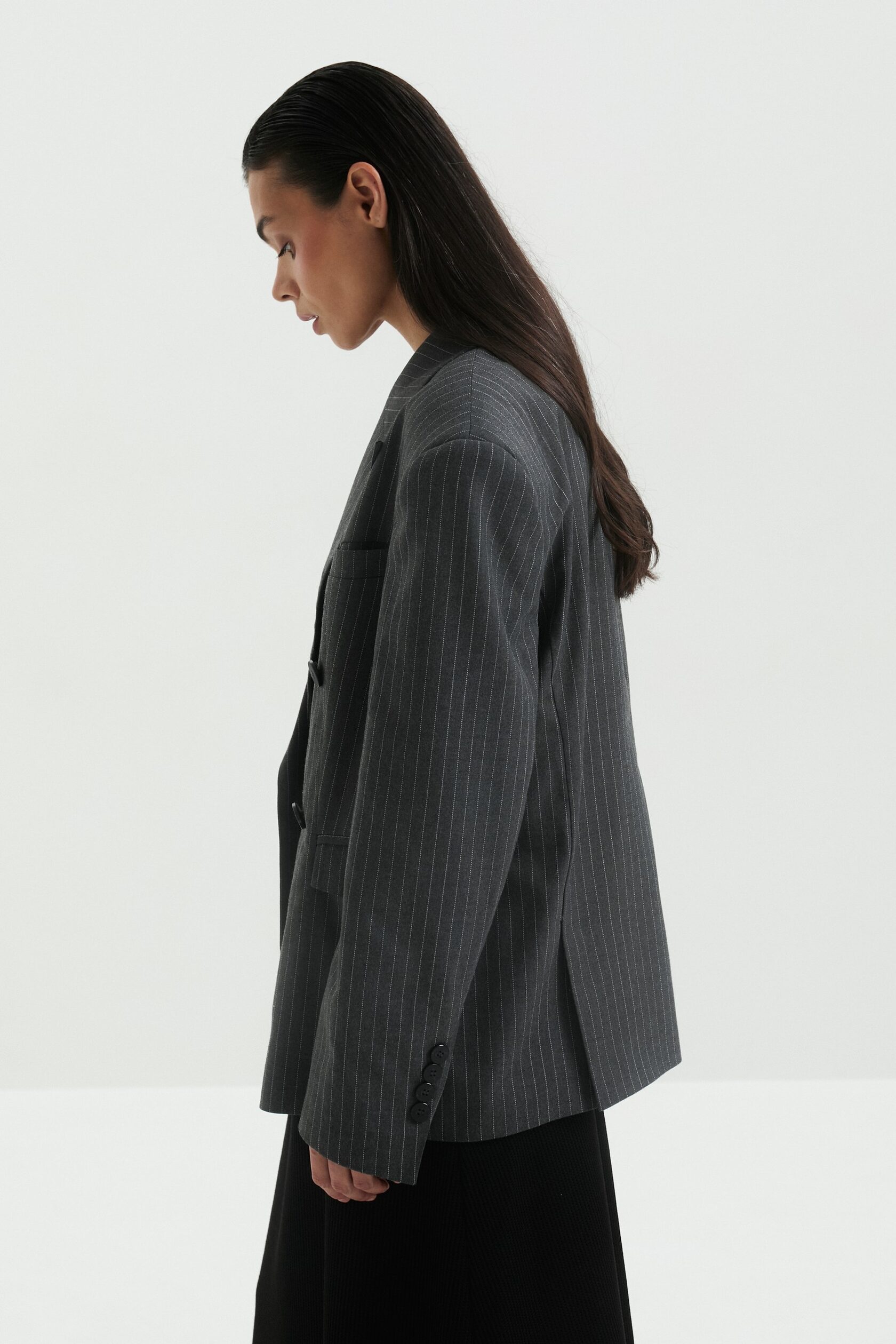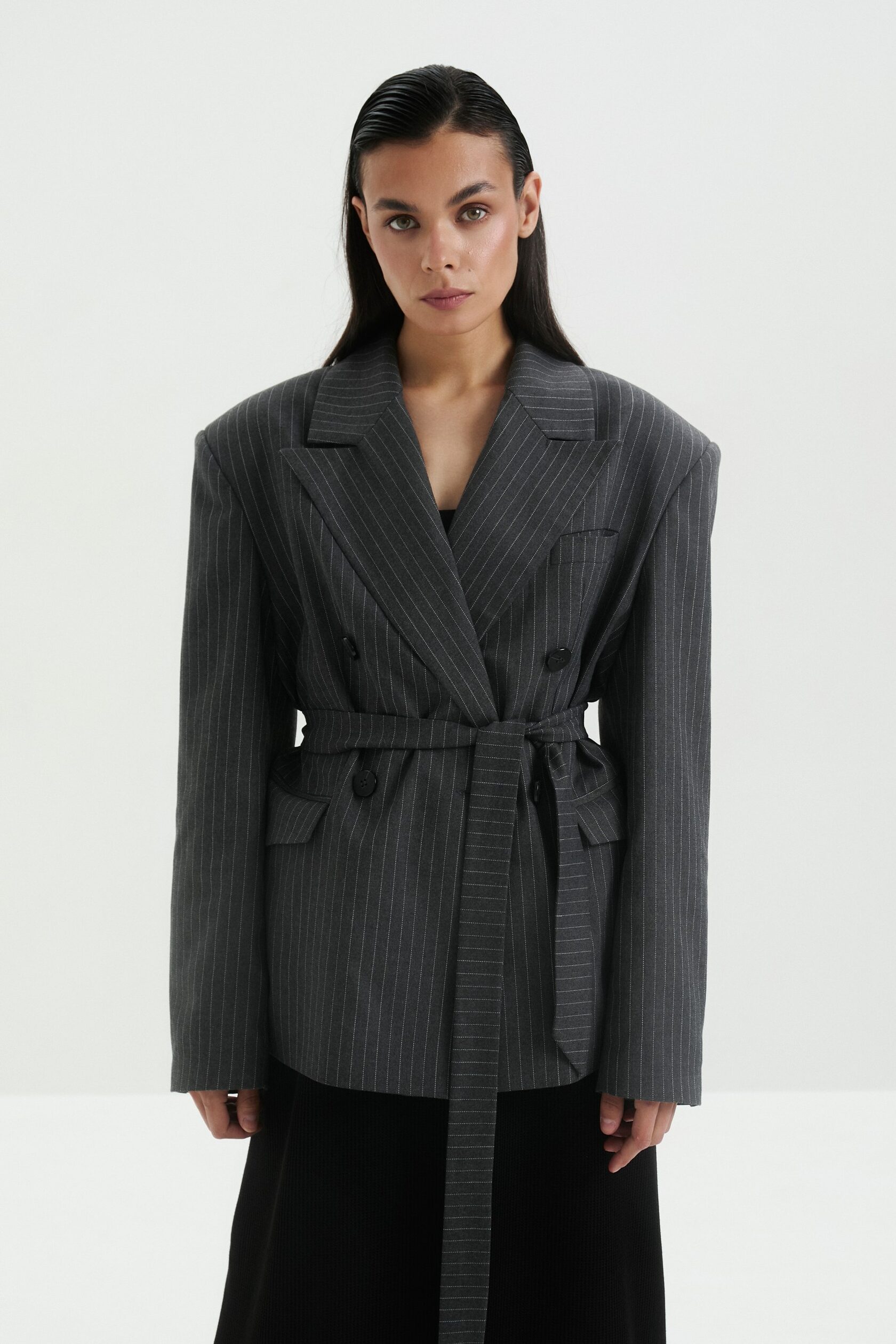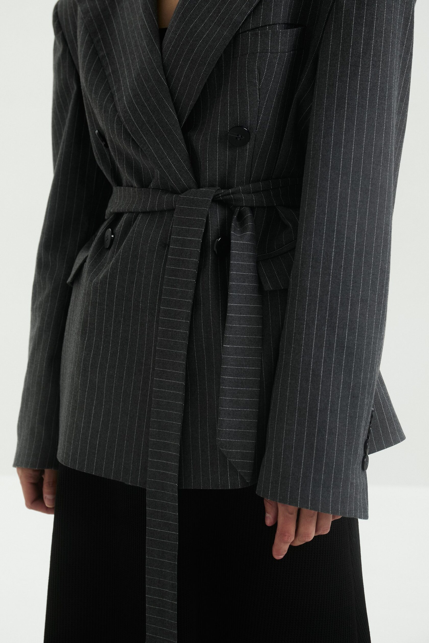 Жакет сочетающий в себе элегантность и непринужденность. Тонкая полоска, двубортный крой, мягкое плечо и широкие лацканы делают его идеальным выбором для любого случая. Подчеркните талию с помощью пояса, чтобы создать более приталенный силуэт.