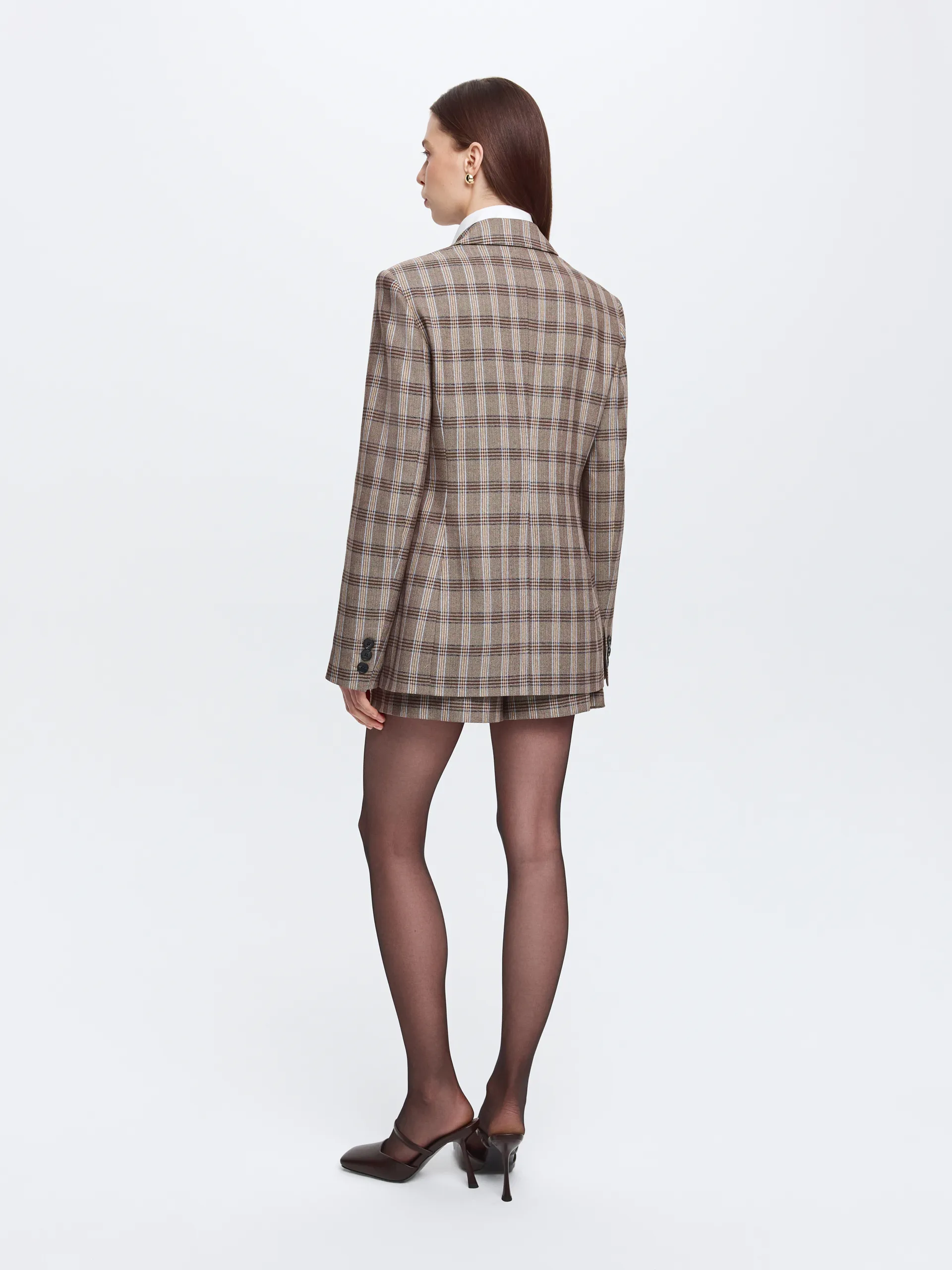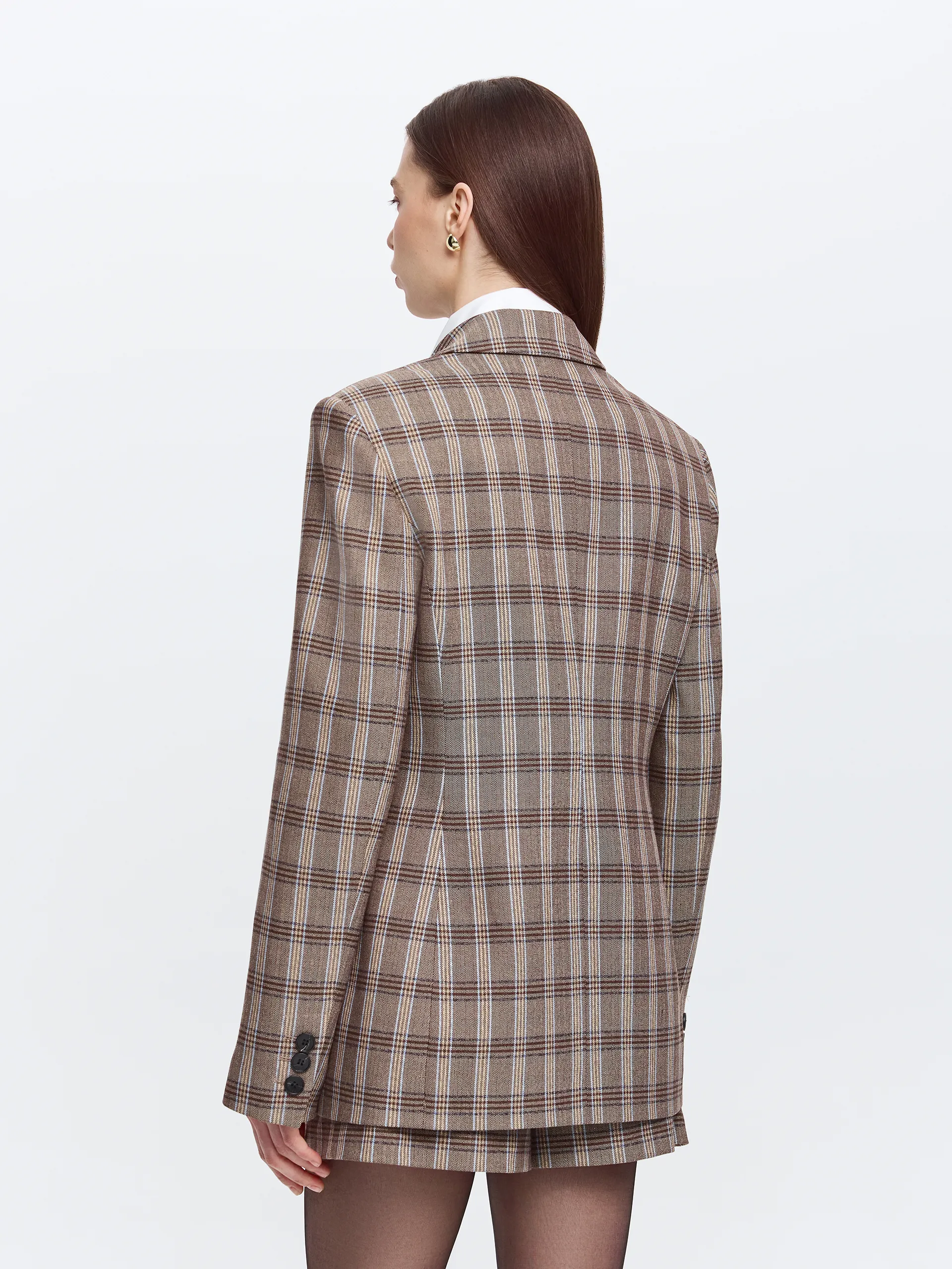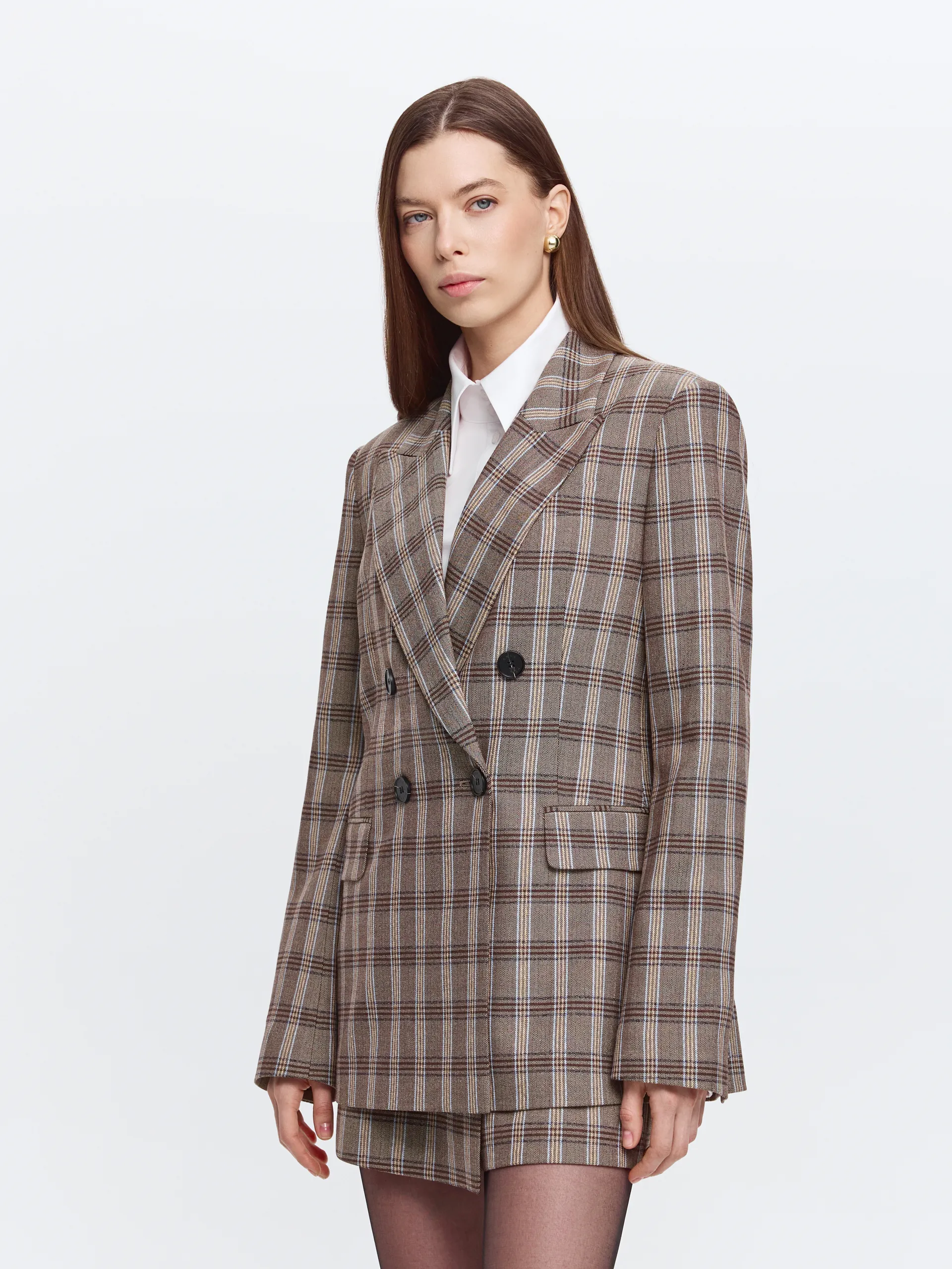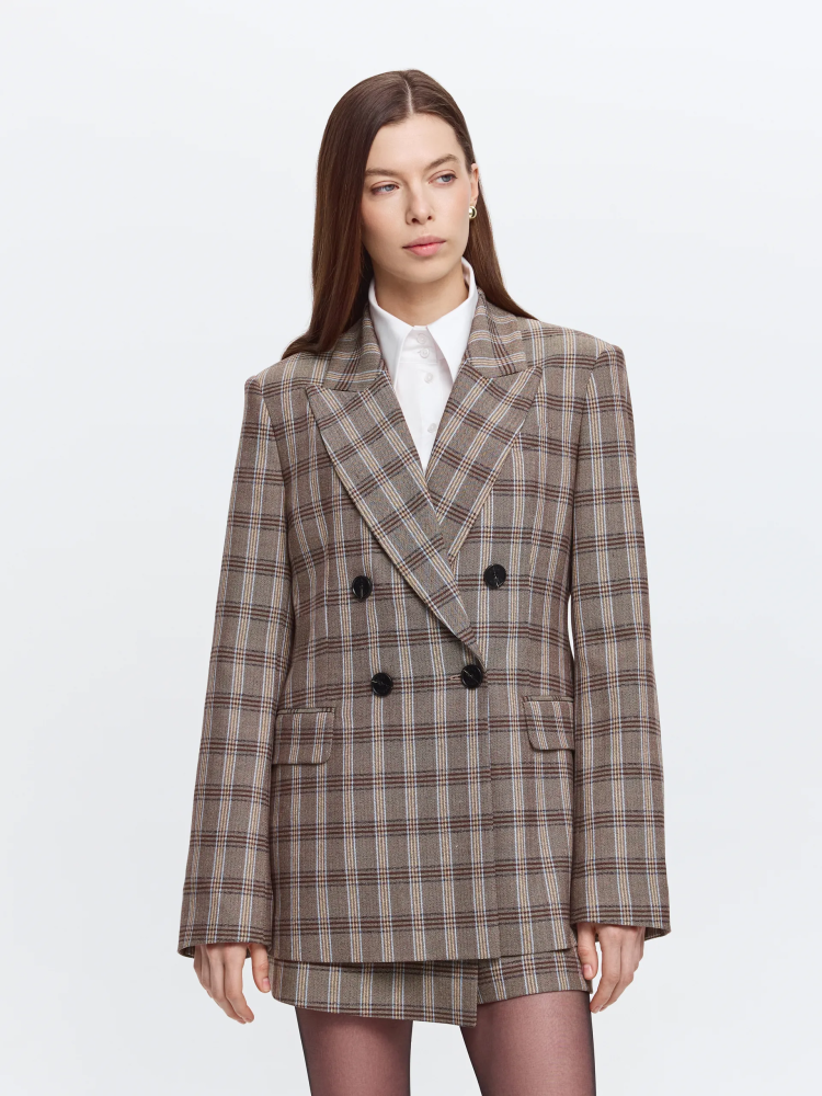 Двубортный жакет прямого силуэта в коричнево-голубую клетку — актуальная интерпретация классики. Костюмная ткань держит форму и обеспечивает аккуратную посадку, сохраняя чистоту линий. Тонкая, выверенная клетка объединяет оттенки коллекции и делает модель универсальной для сочетаний. Жакет легко комбинируется с рубашками, брюками и юбками, органично вписываясь в деловой и городской гардероб.